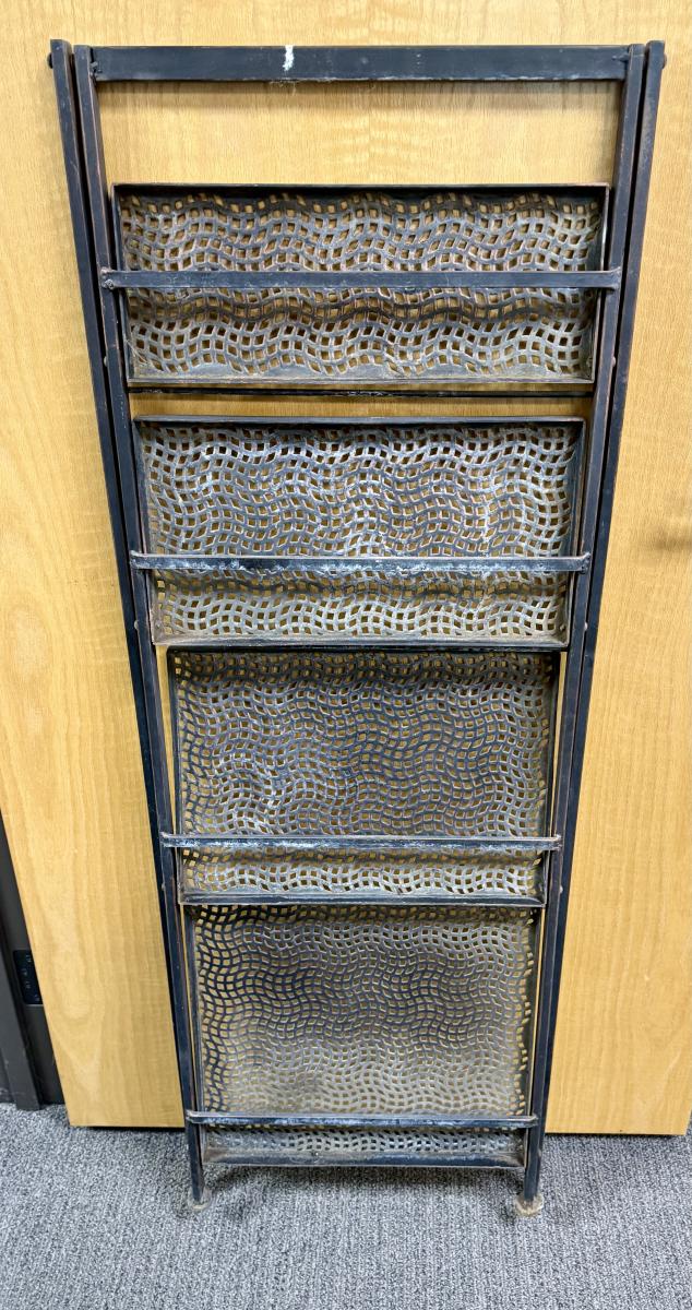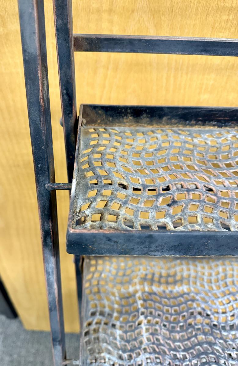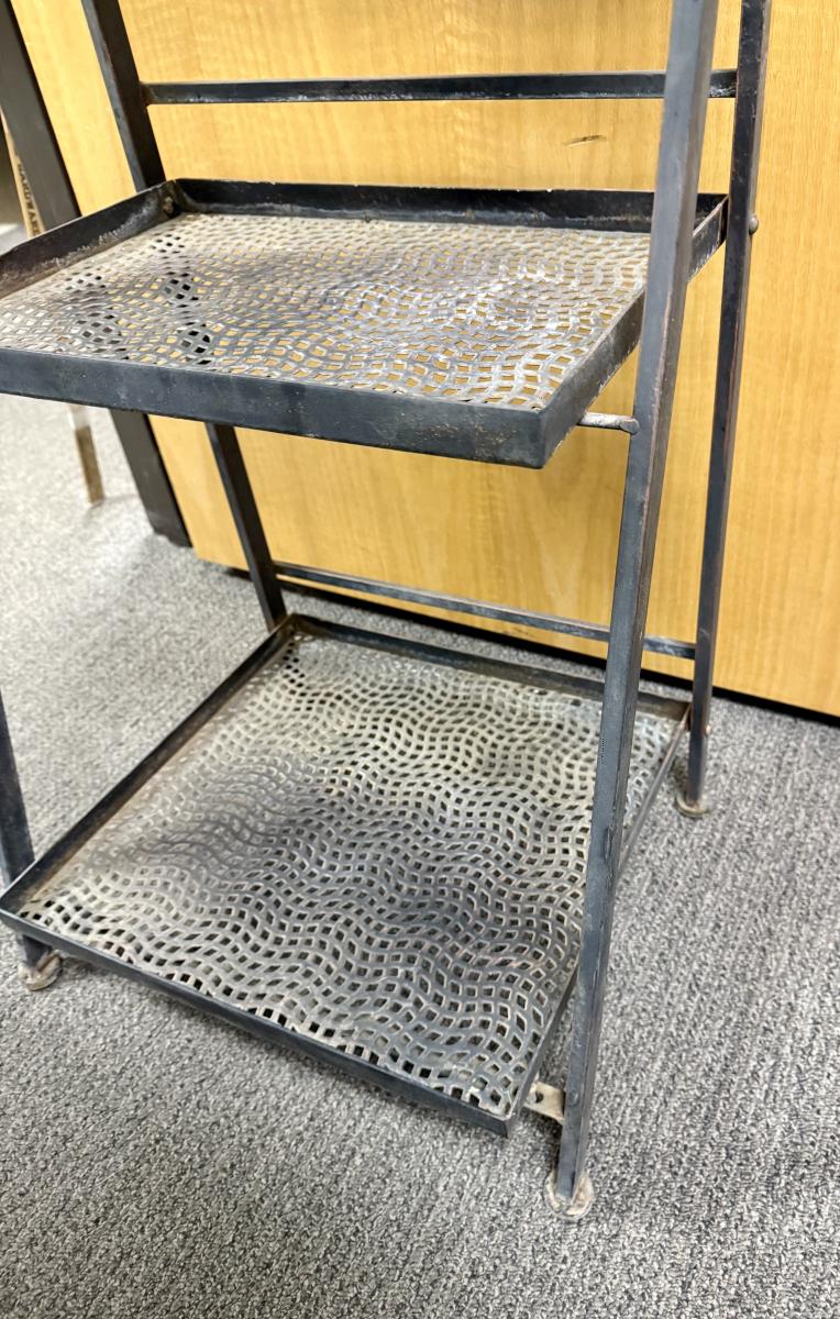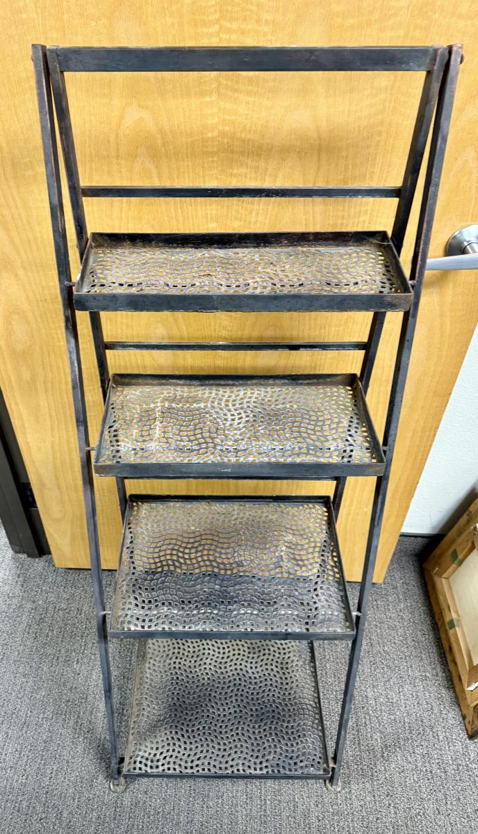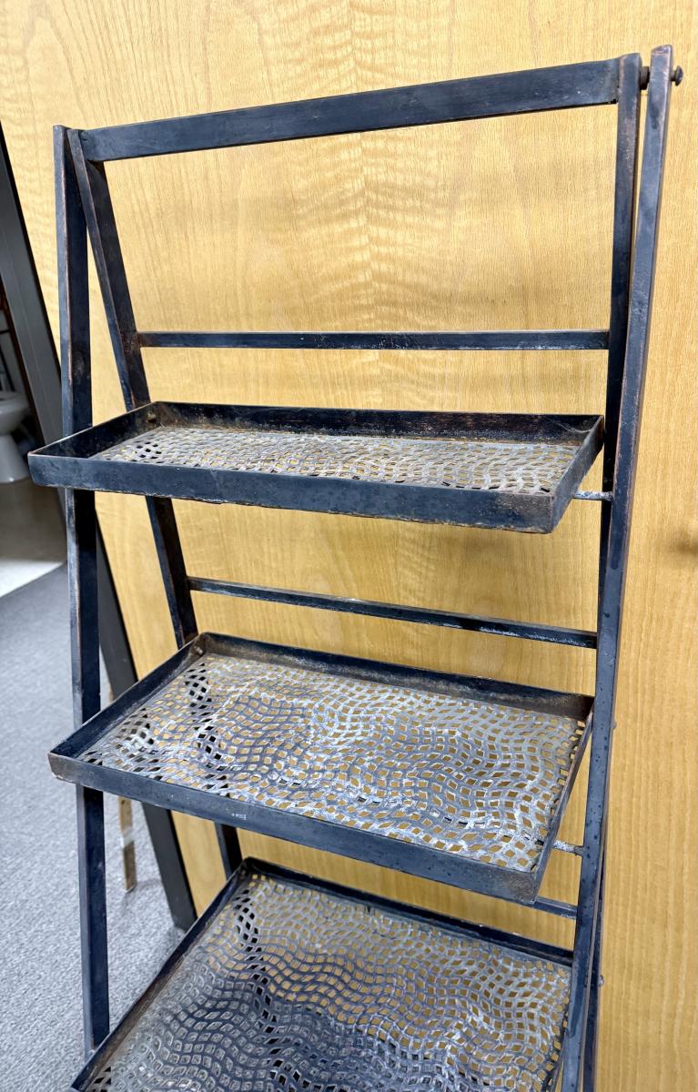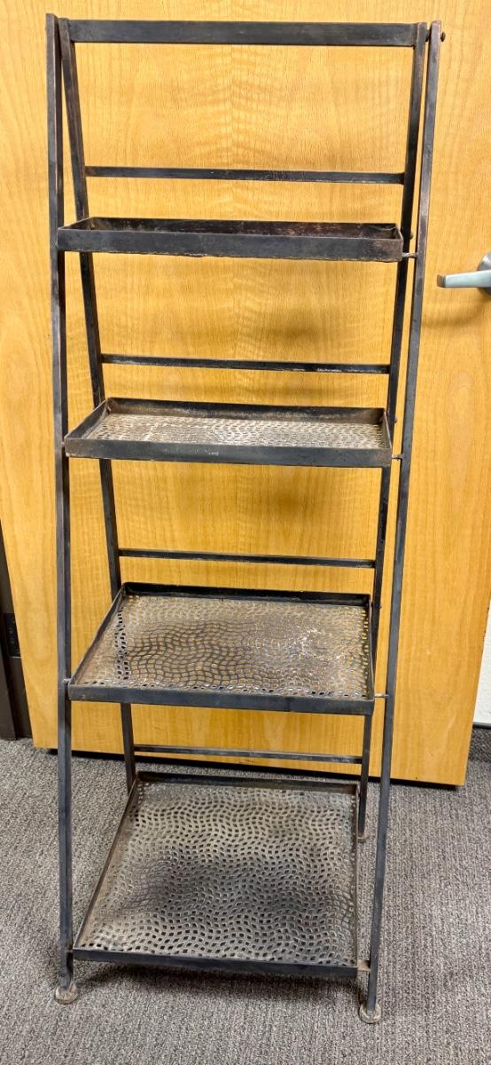 Triangular shape, widest at the bottom and narrow at the top. 4 shelves, measures approx. 52" tall and 19" wide. Good condition, does have a small amount of rust as it was used outside. Can fold up for storage like a ladder.