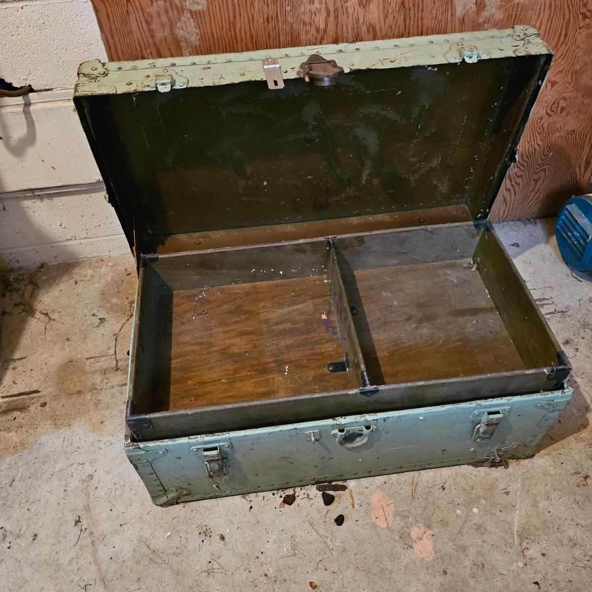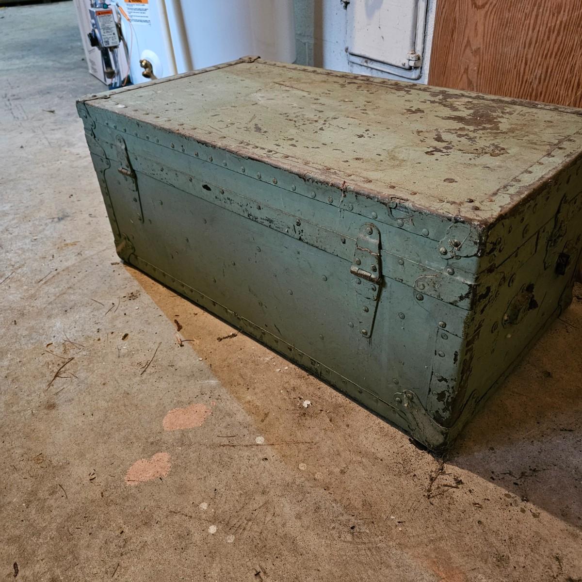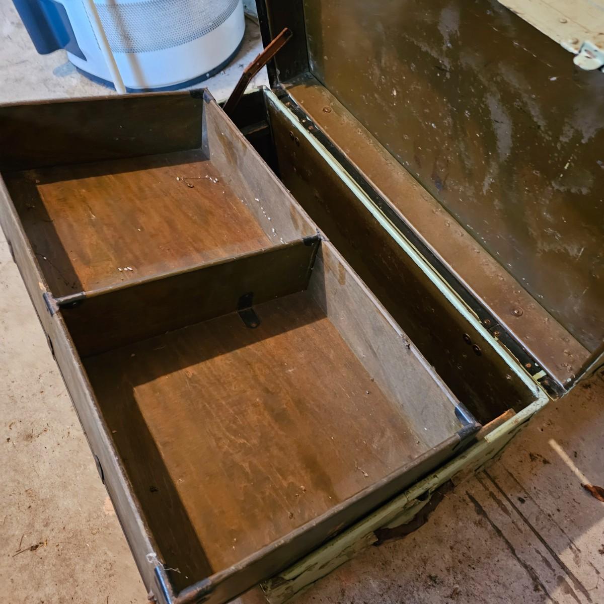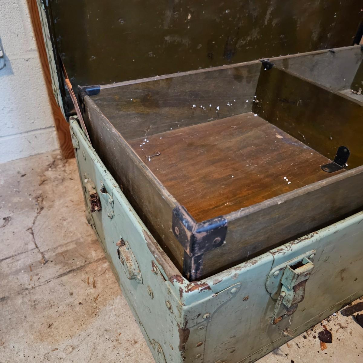Vintage green metal over wood footlocker with inside storage tray. Locker has double clasps and an extra latch on front as original lock piece has no key. One leather handle missing on left side. Inside tray is wood with metal corners and supports, lifts out for extra storage below. Piece measures 31" x 17" x 13"H, has numerous scratches and scrapes on exterior. See photos for details. Local pickup only.