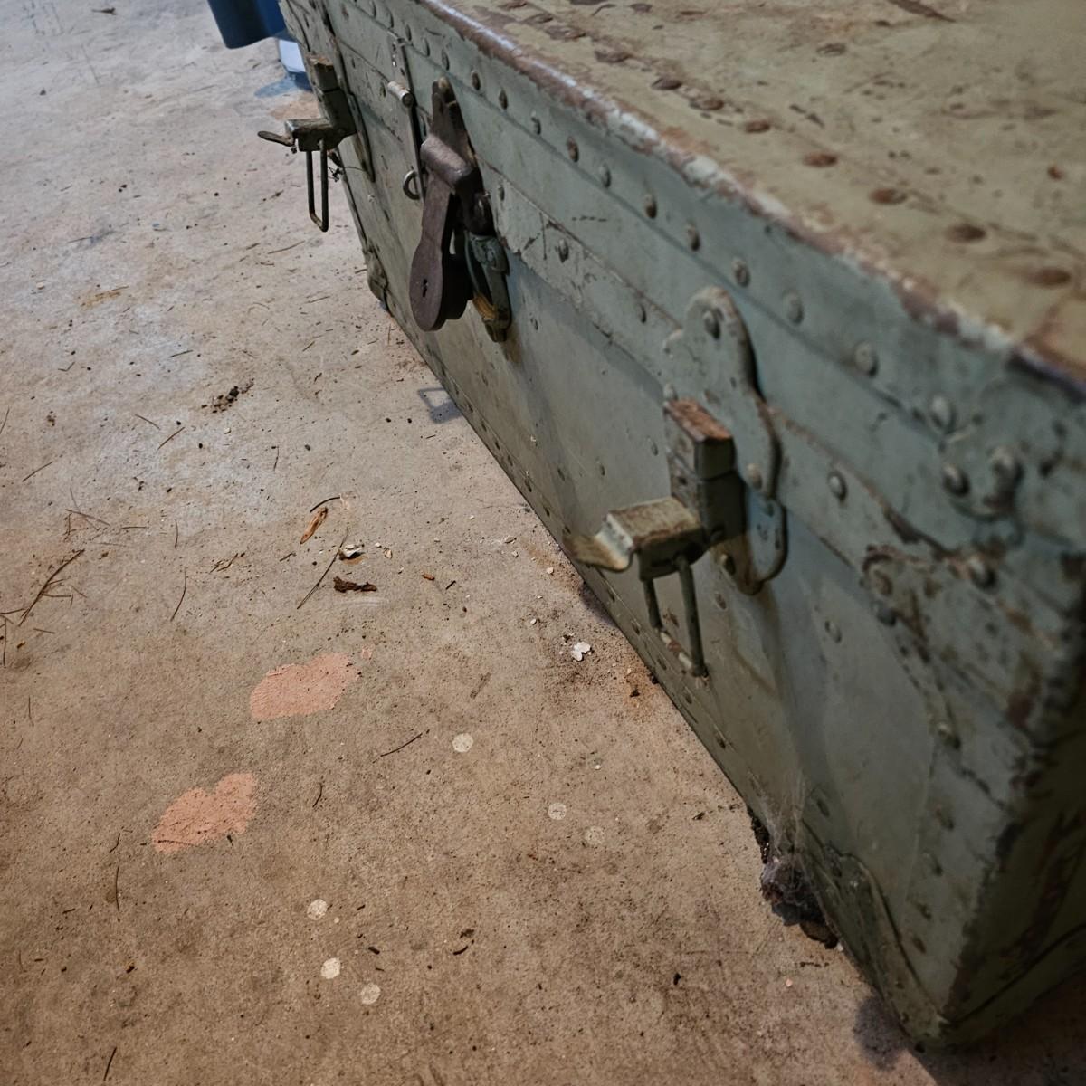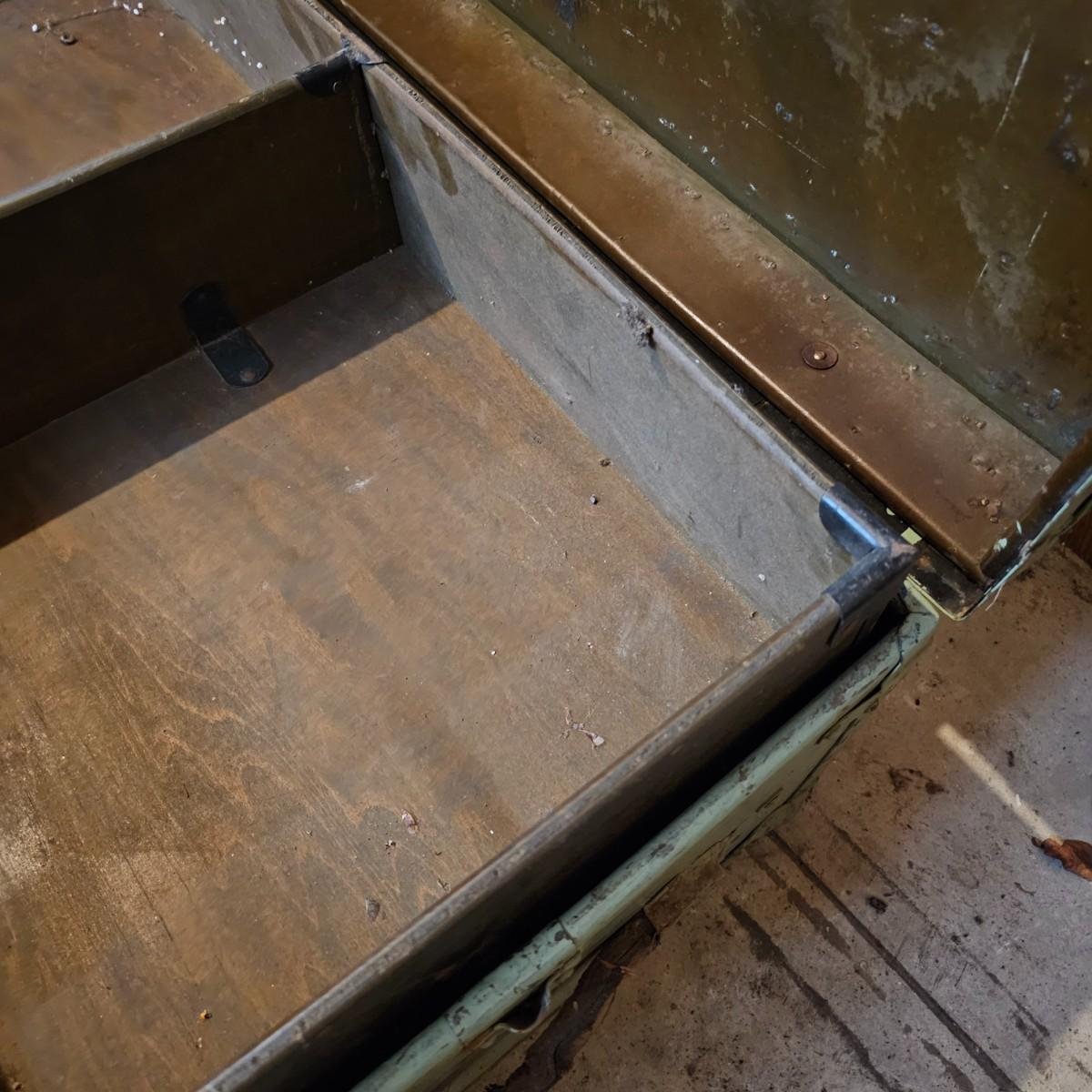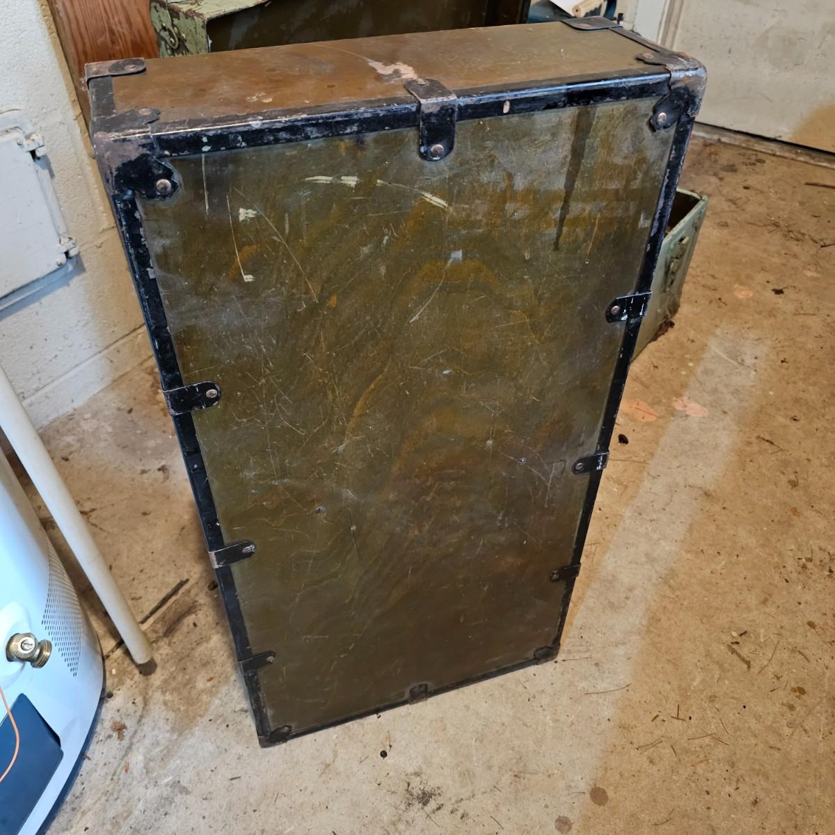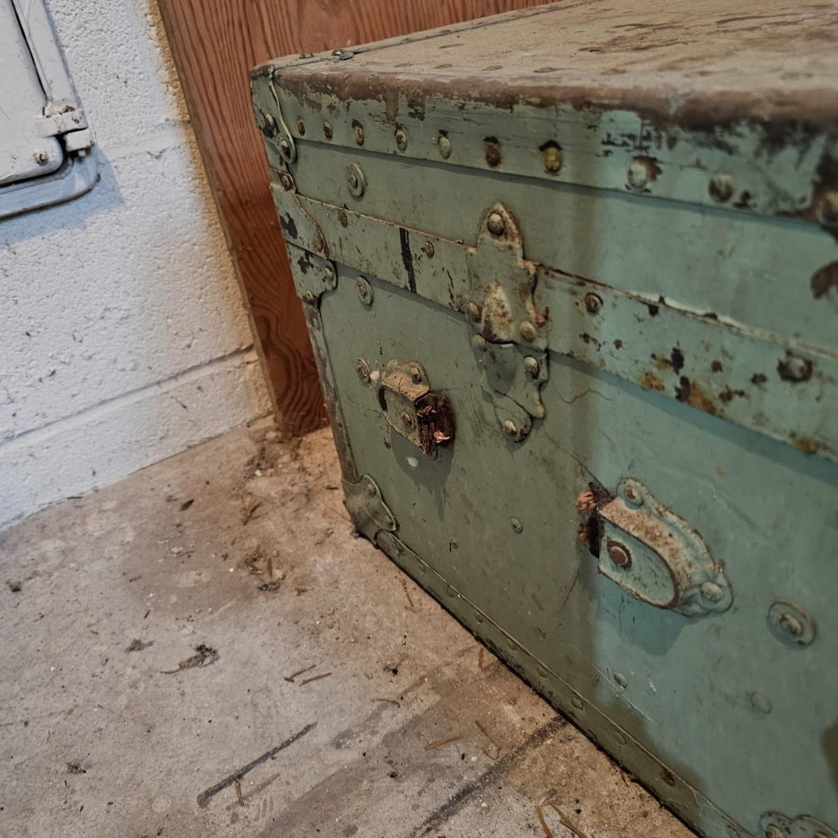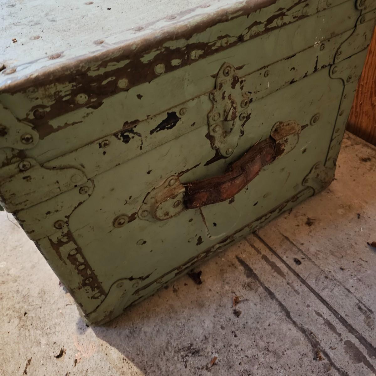 Vintage green metal over wood footlocker with inside storage tray. Locker has double clasps and an extra latch on front as original lock piece has no key. One leather handle missing on left side. Inside tray is wood with metal corners and supports, lifts out for extra storage below. Piece measures 31" x 17" x 13"H, has numerous scratches and scrapes on exterior. See photos for details. Local pickup only.