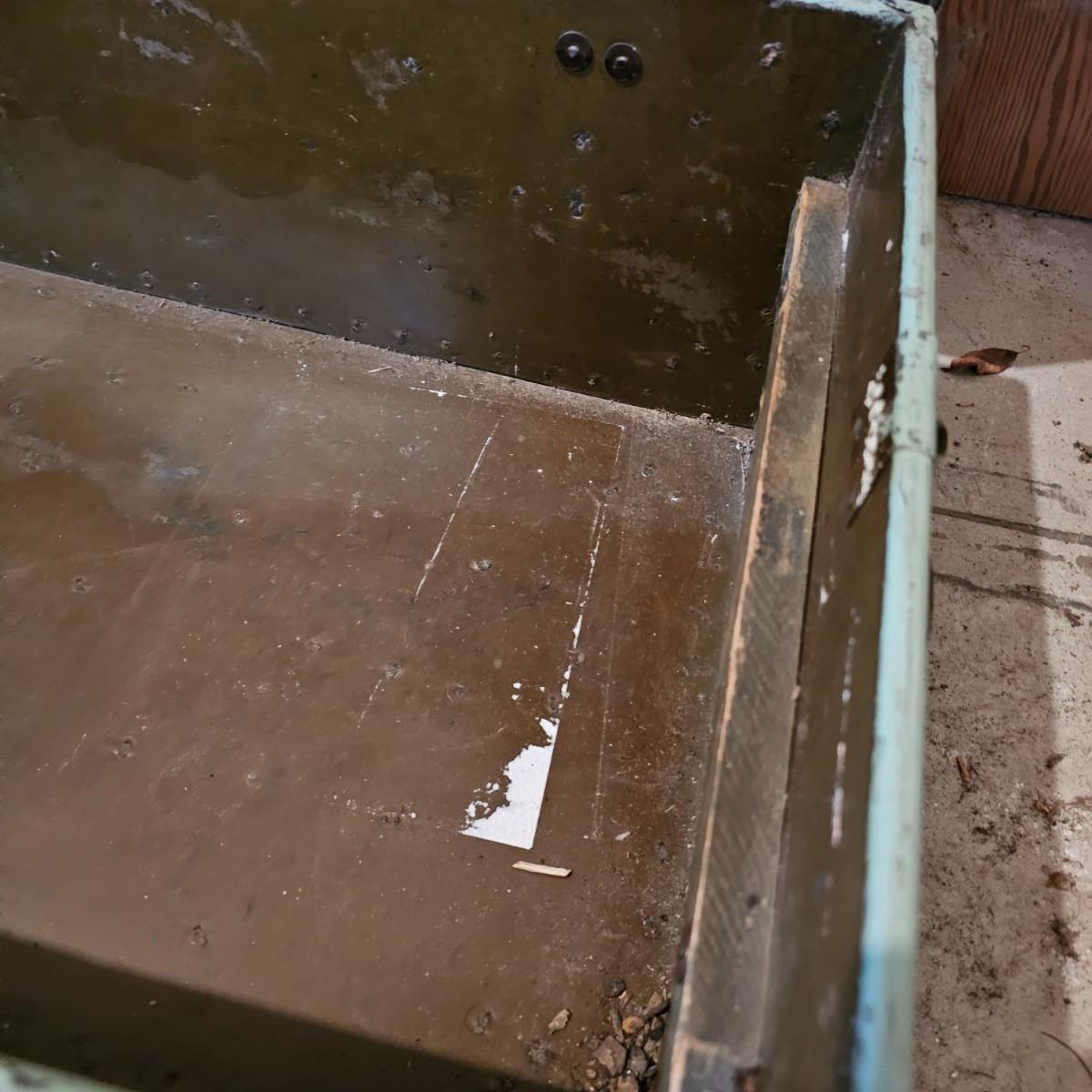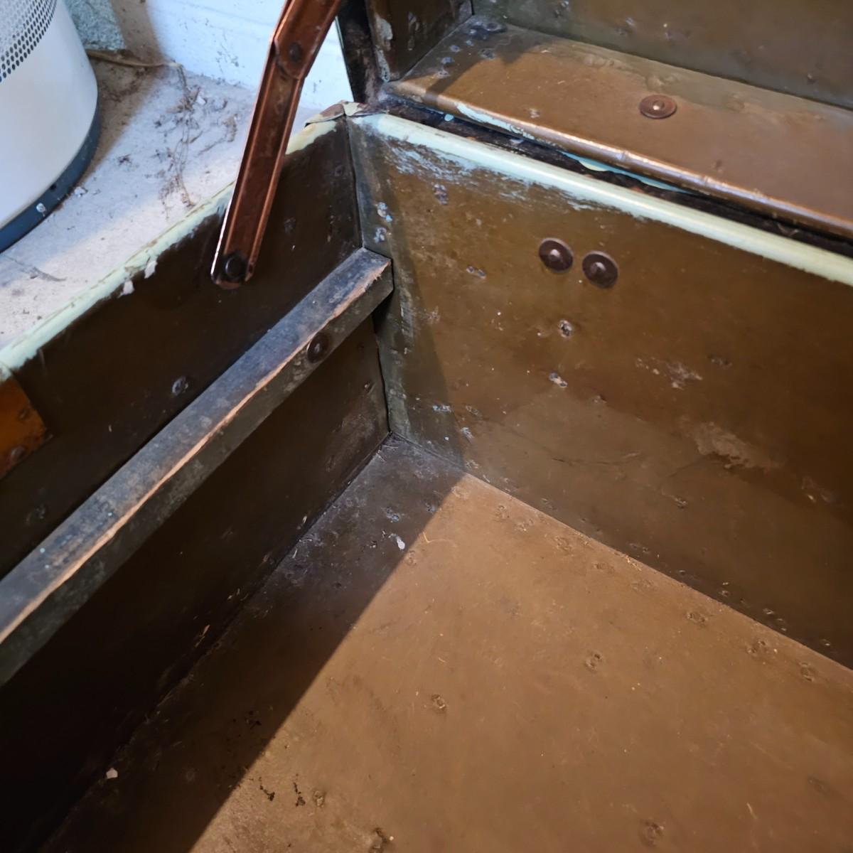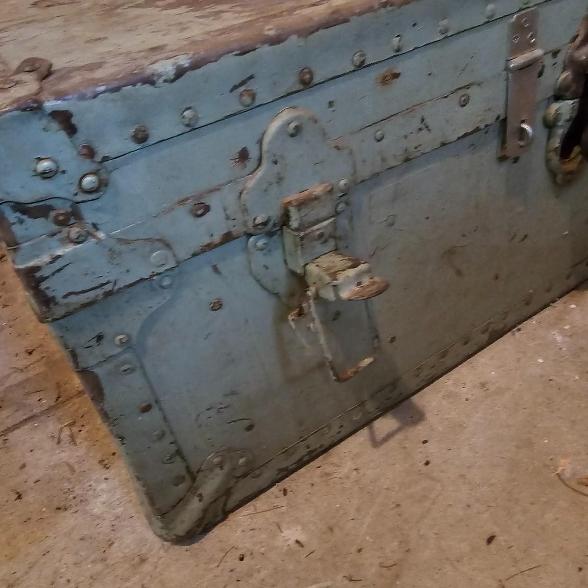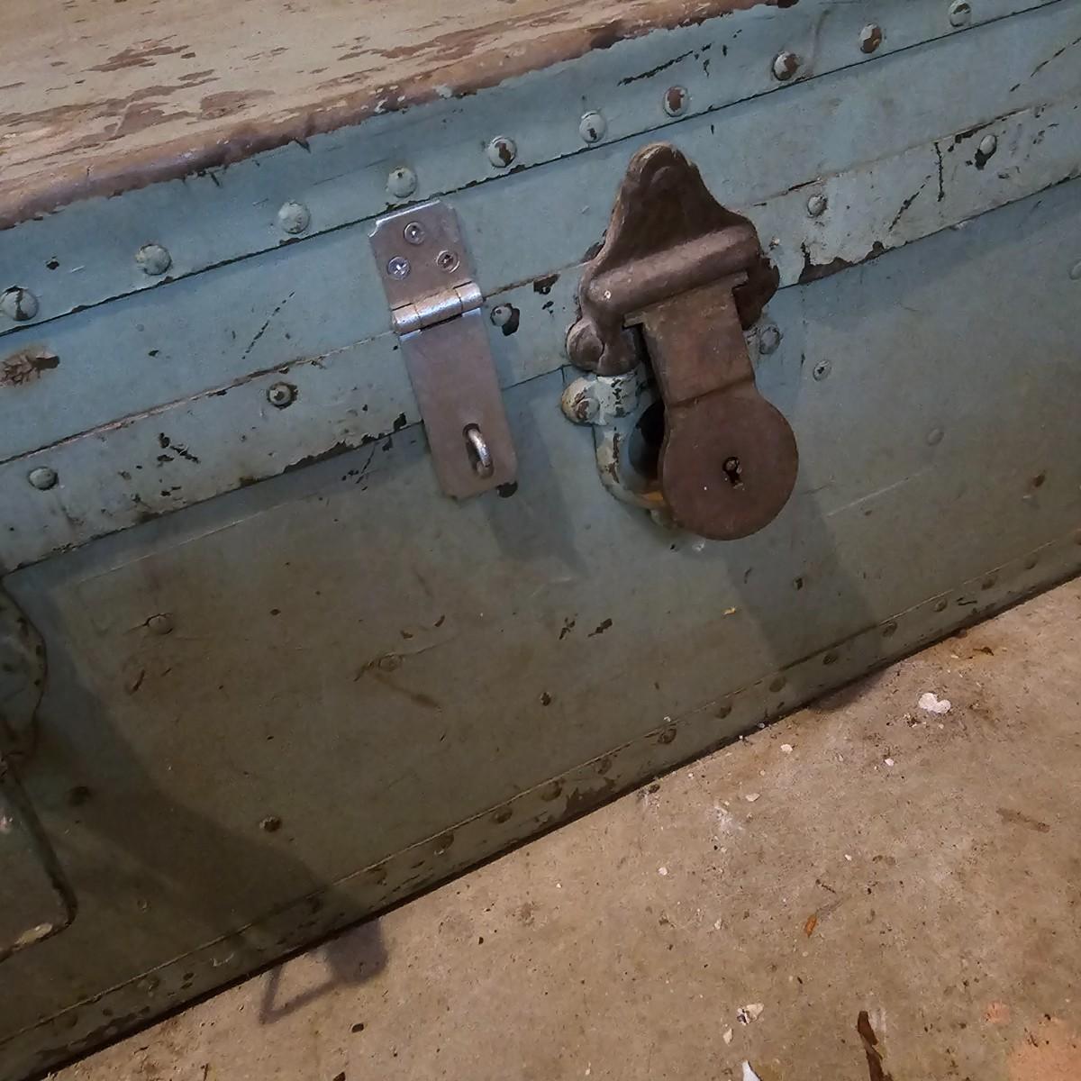 Vintage green metal over wood footlocker with inside storage tray. Locker has double clasps and an extra latch on front as original lock piece has no key. One leather handle missing on left side. Inside tray is wood with metal corners and supports, lifts out for extra storage below. Piece measures 31" x 17" x 13"H, has numerous scratches and scrapes on exterior. See photos for details. Local pickup only.