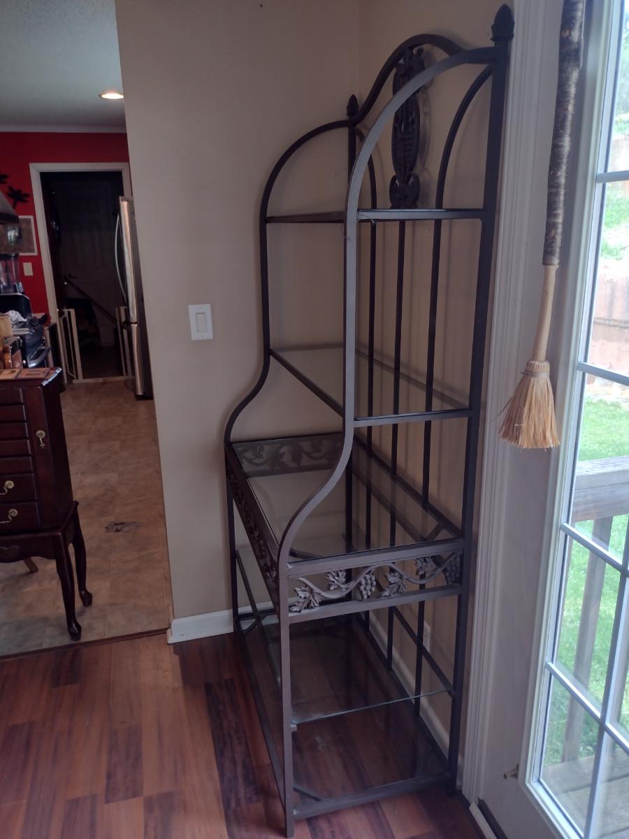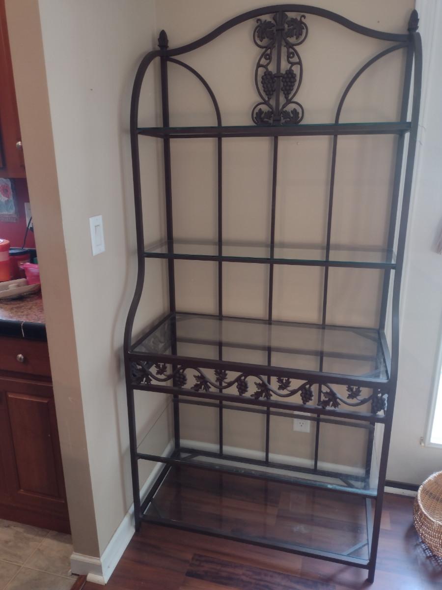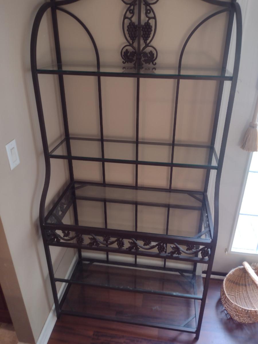 Metal Frame Baker's Rack with Glass Shelves. Measures approx 35 1/2" wide, 74" tall. Shelves vary in depth- 18 1/2" to 12 1/2".