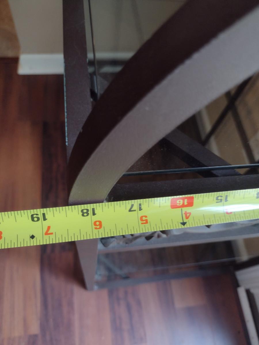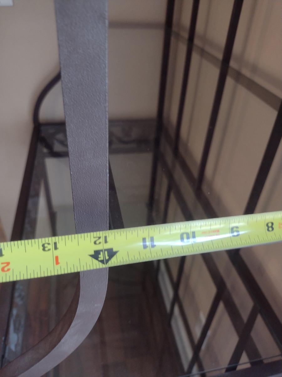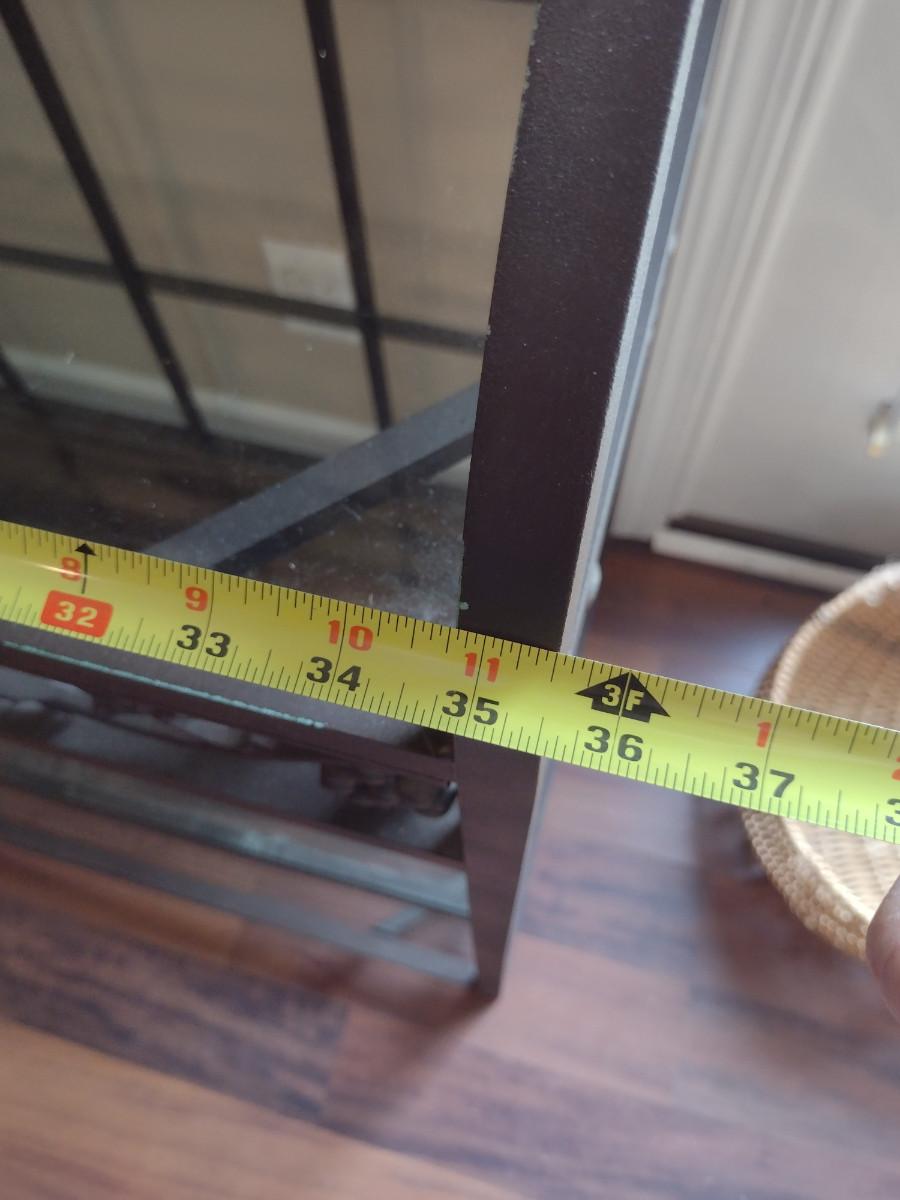 Metal Frame Baker's Rack with Glass Shelves. Measures approx 35 1/2" wide, 74" tall. Shelves vary in depth- 18 1/2" to 12 1/2".