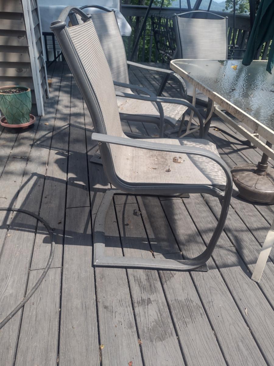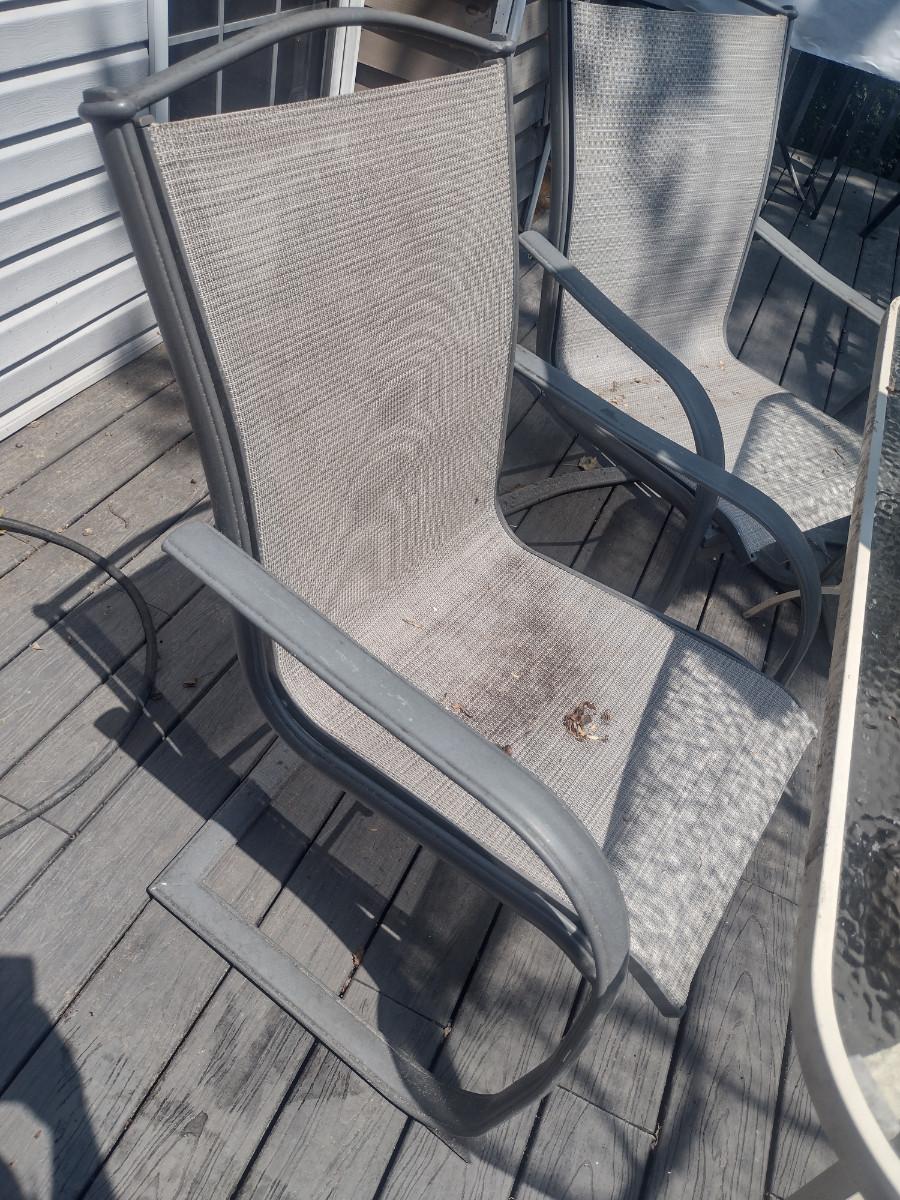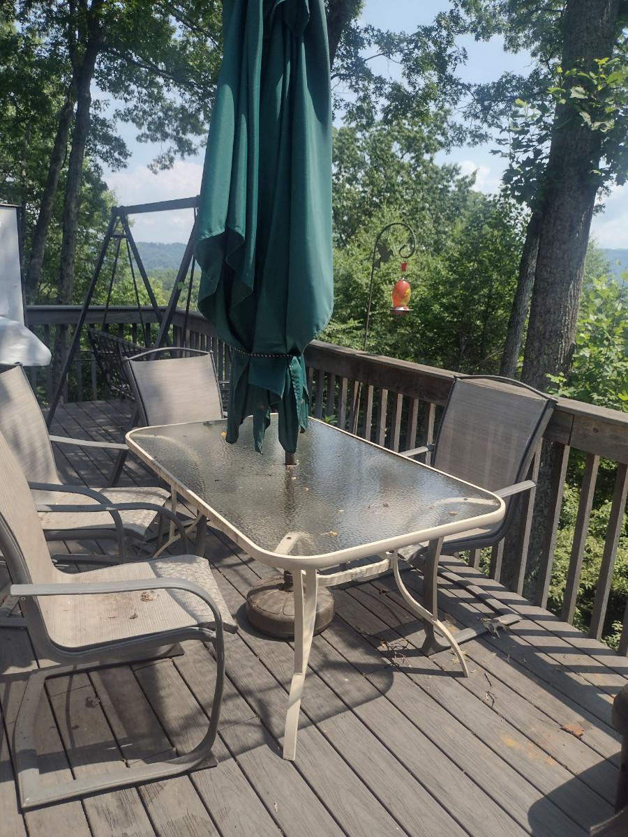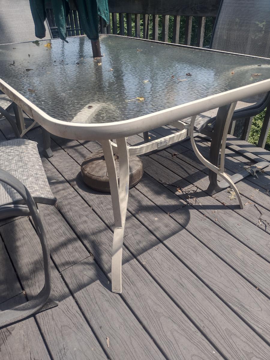Metal Frame Patio Table with Glass Top, Four Chairs, and Umbrella. Table measures approx 60" x 38" x 28" tall.