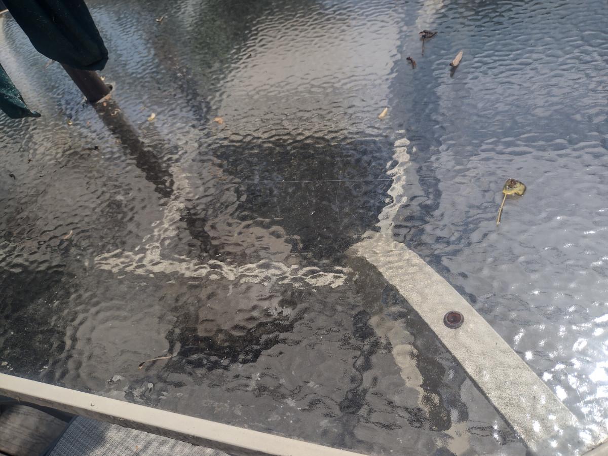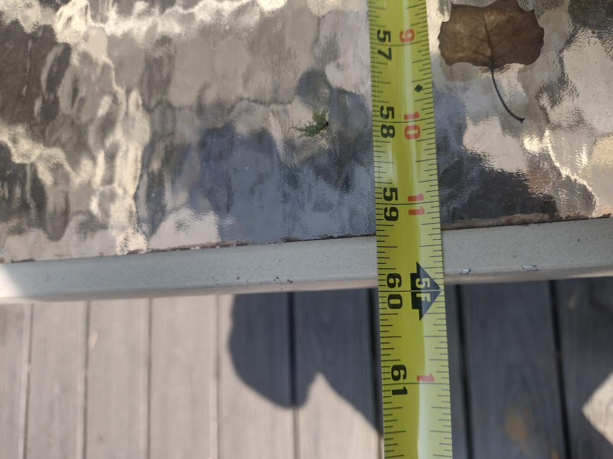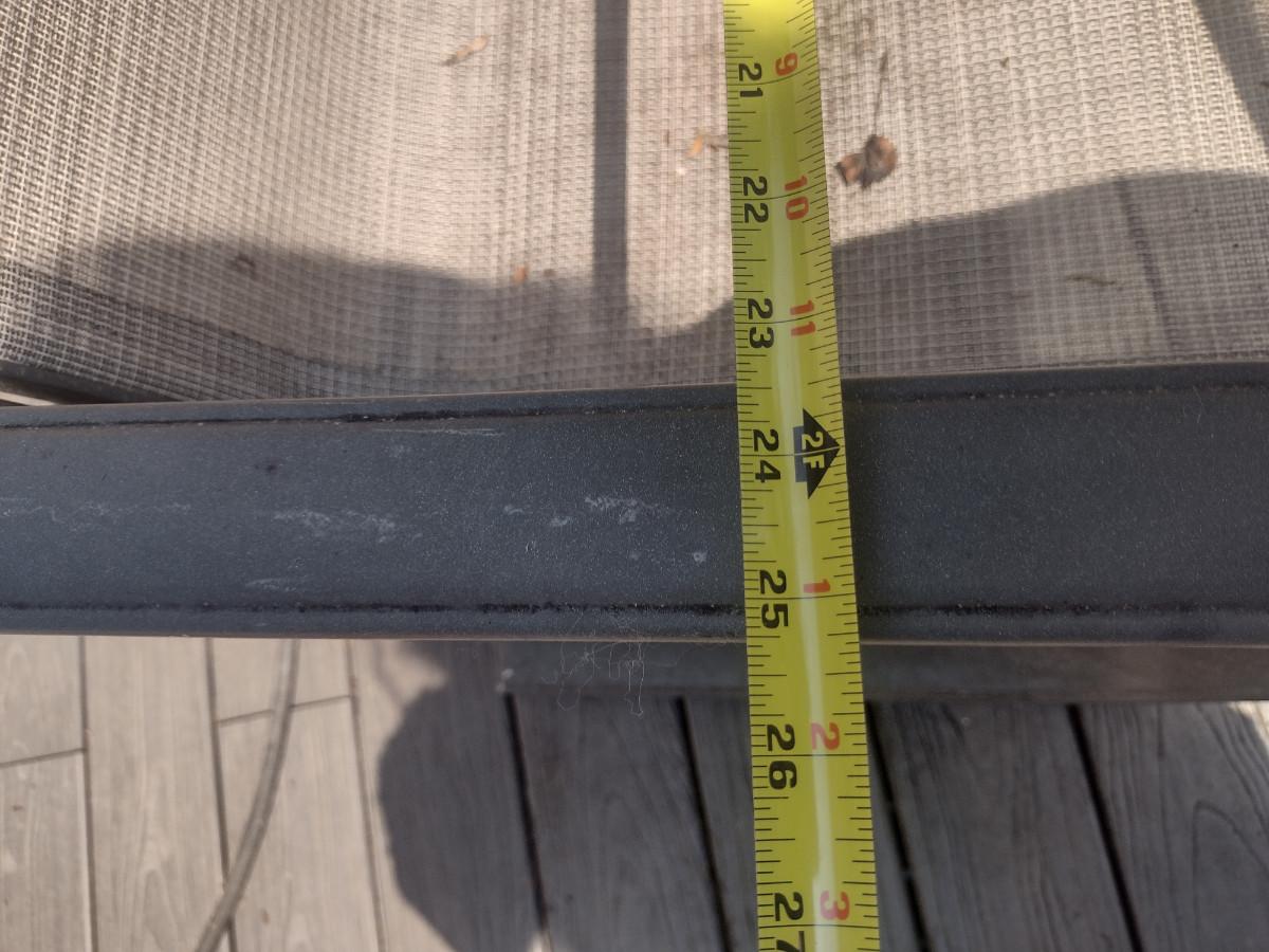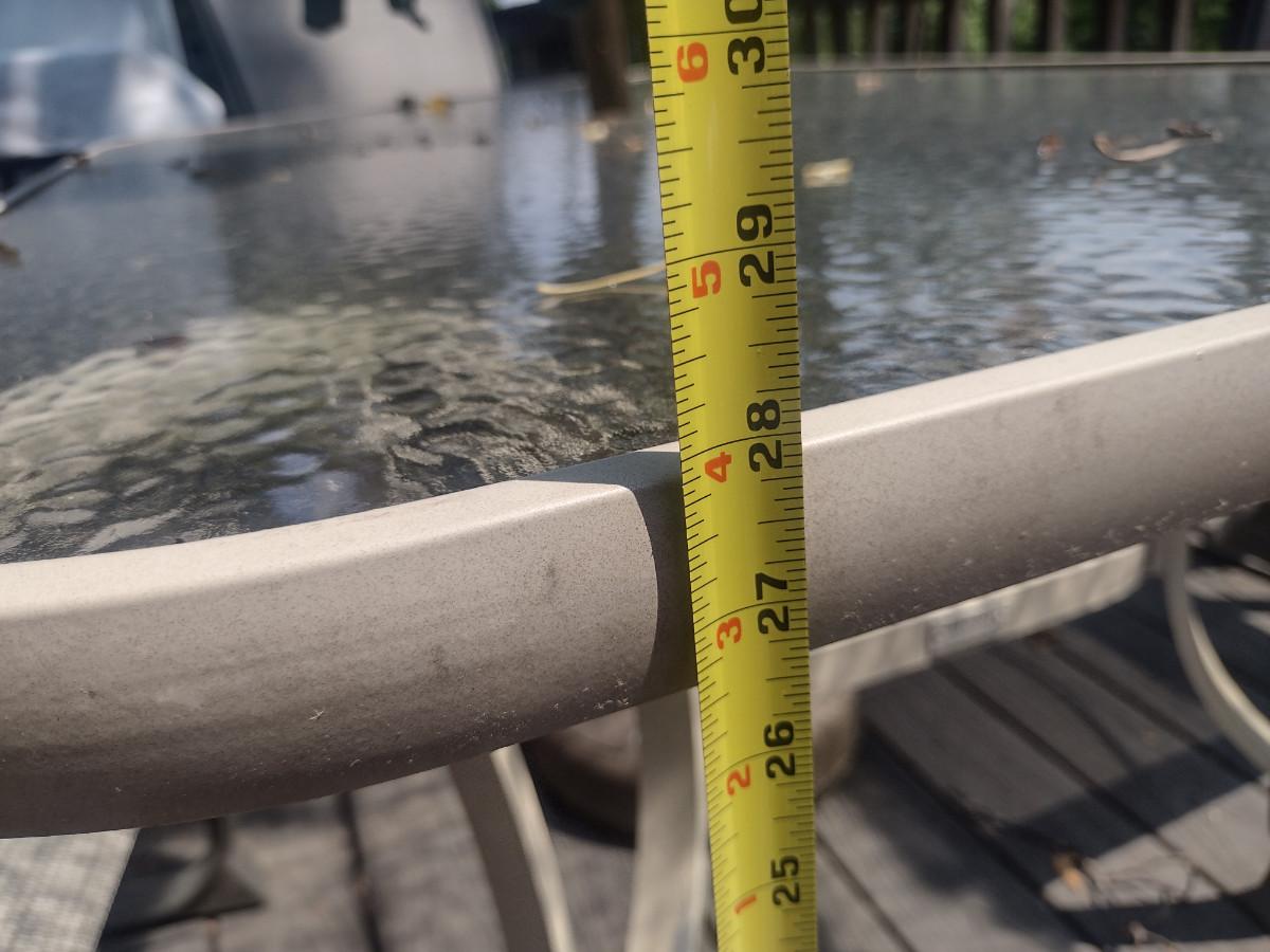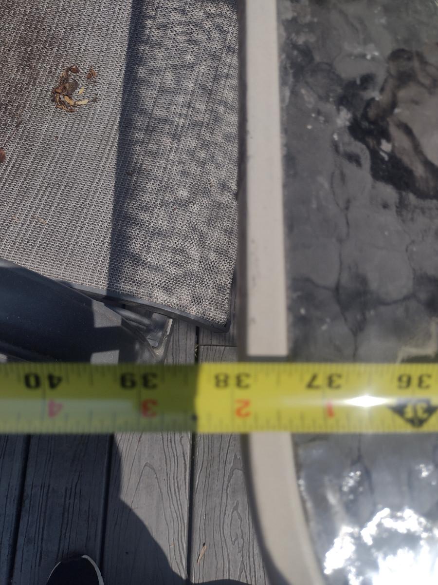 Metal Frame Patio Table with Glass Top, Four Chairs, and Umbrella. Table measures approx 60" x 38" x 28" tall.