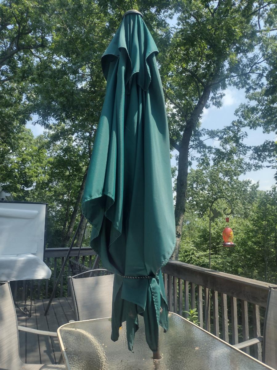 Metal Frame Patio Table with Glass Top, Four Chairs, and Umbrella