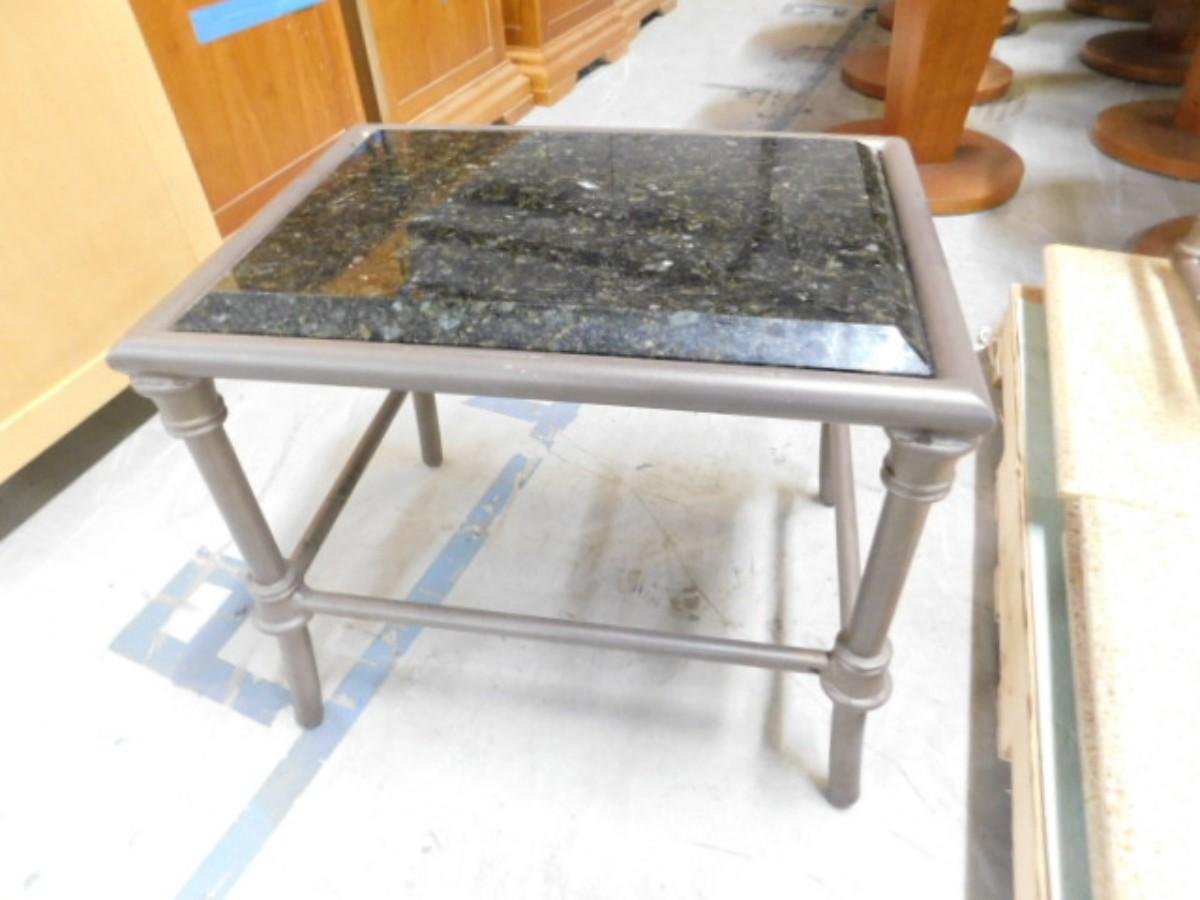 Metal Frame Side Table with Black Beveled Cut Granite Insert Choice B Shipping option via freight or local mover is Buyer's responsibility and expense. Buyer must have all shipping scheduled within the stated dates and times of pickup. Recommended local mover is Beaty Bros. Moving 828-201-2982
