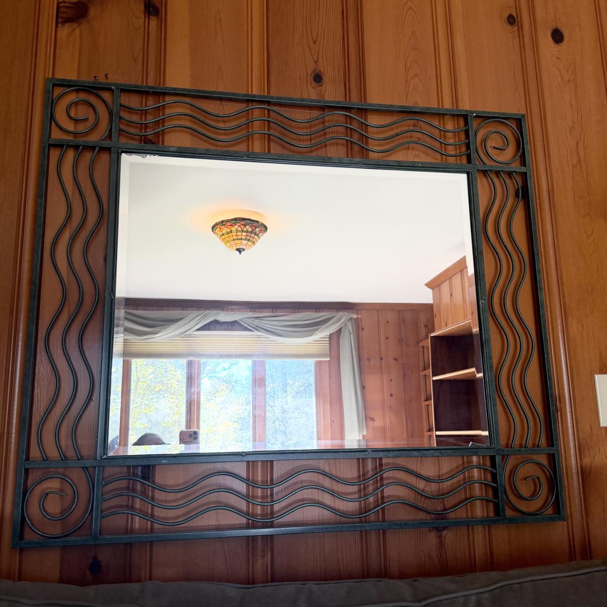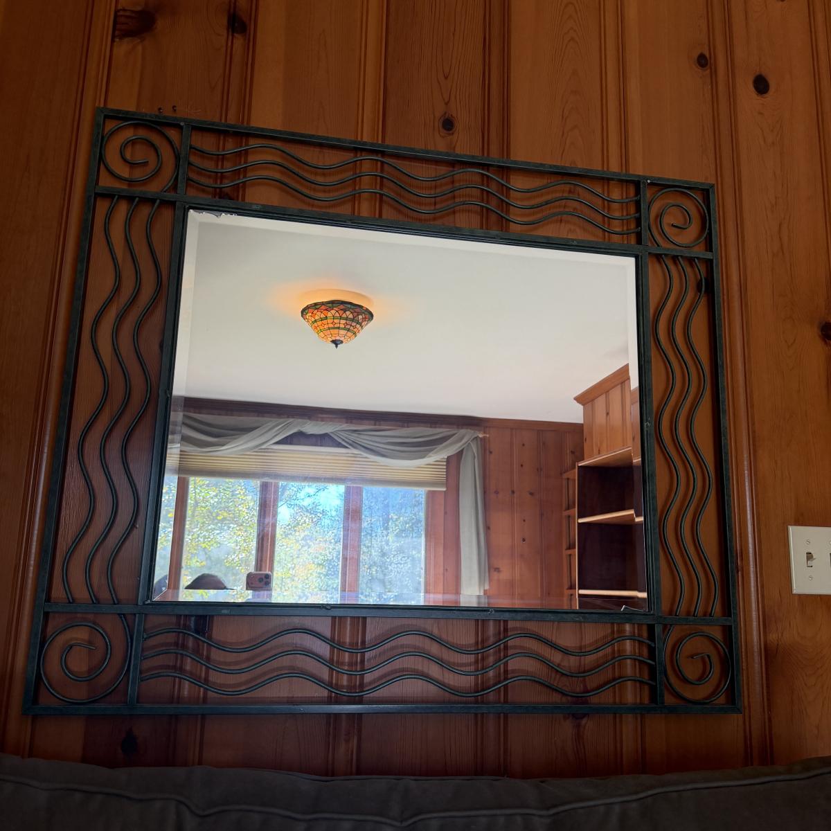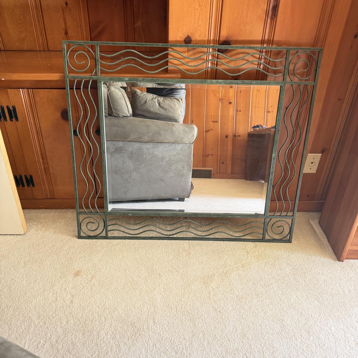 This metal framed beveled mirror measures 42” x 36”H. Two corners of mirror have small pieces missing, see pictures.