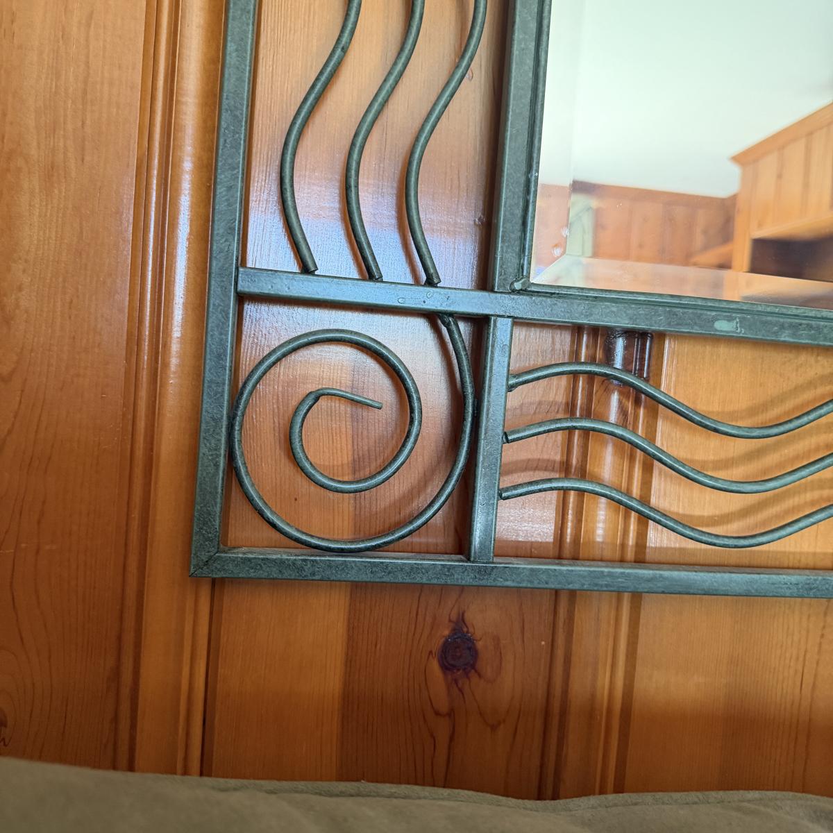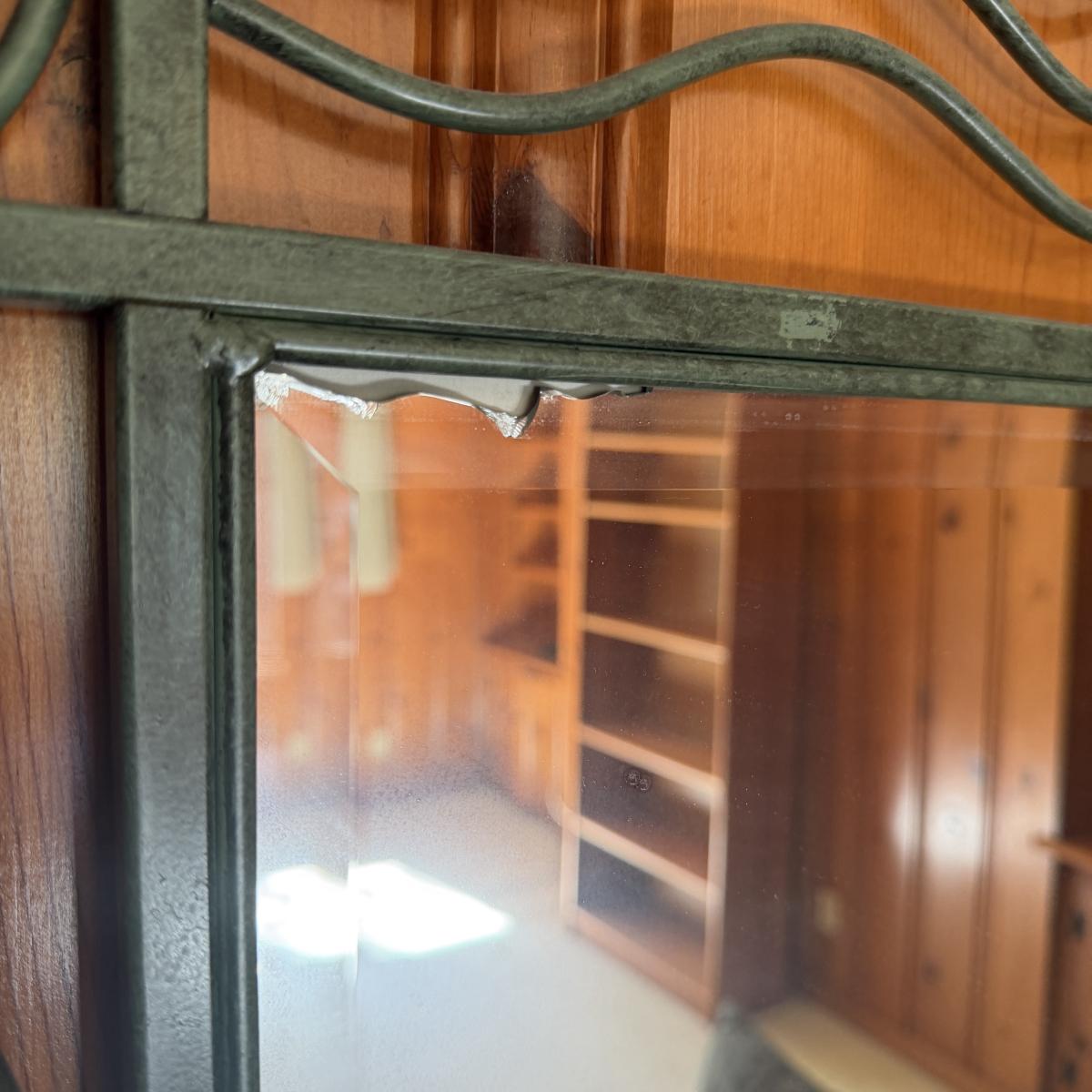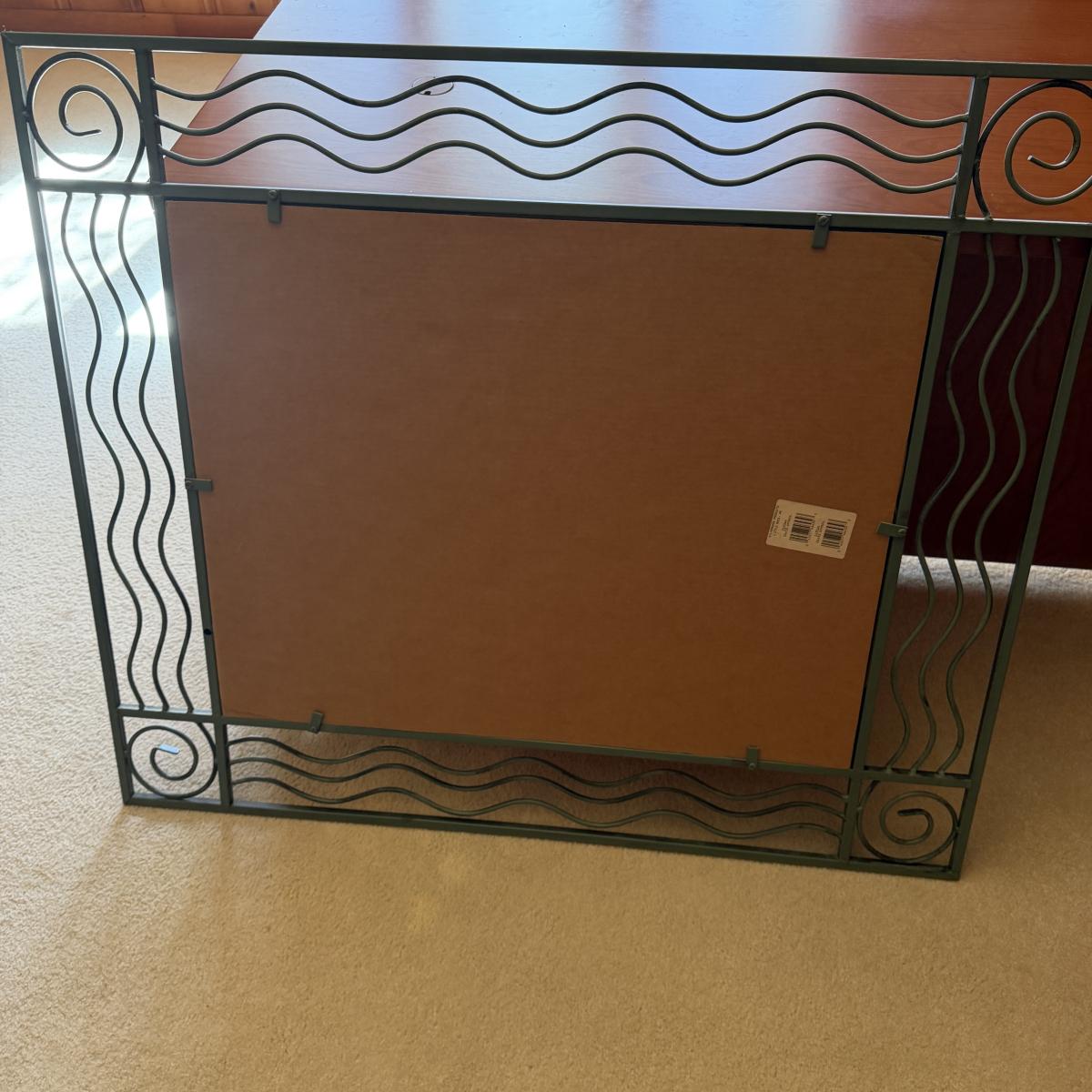 This metal framed beveled mirror measures 42” x 36”H. Two corners of mirror have small pieces missing, see pictures.