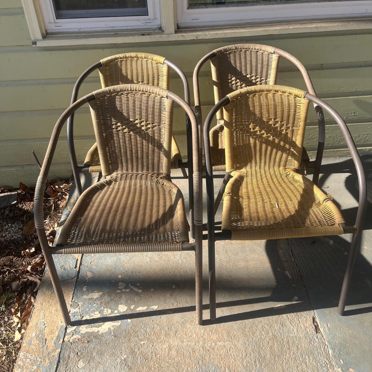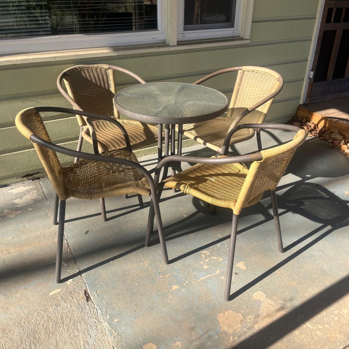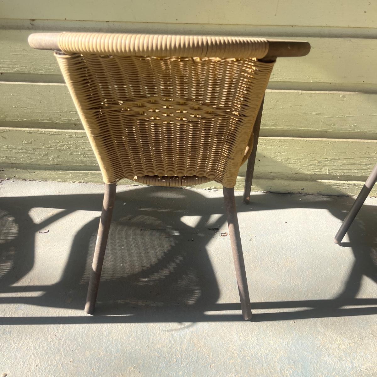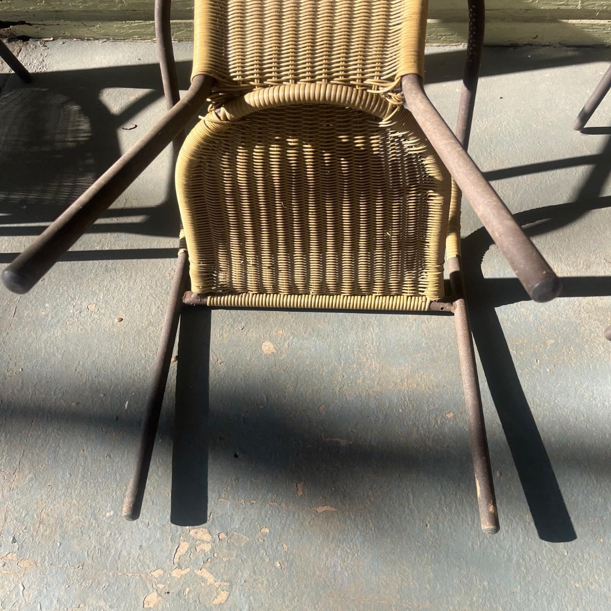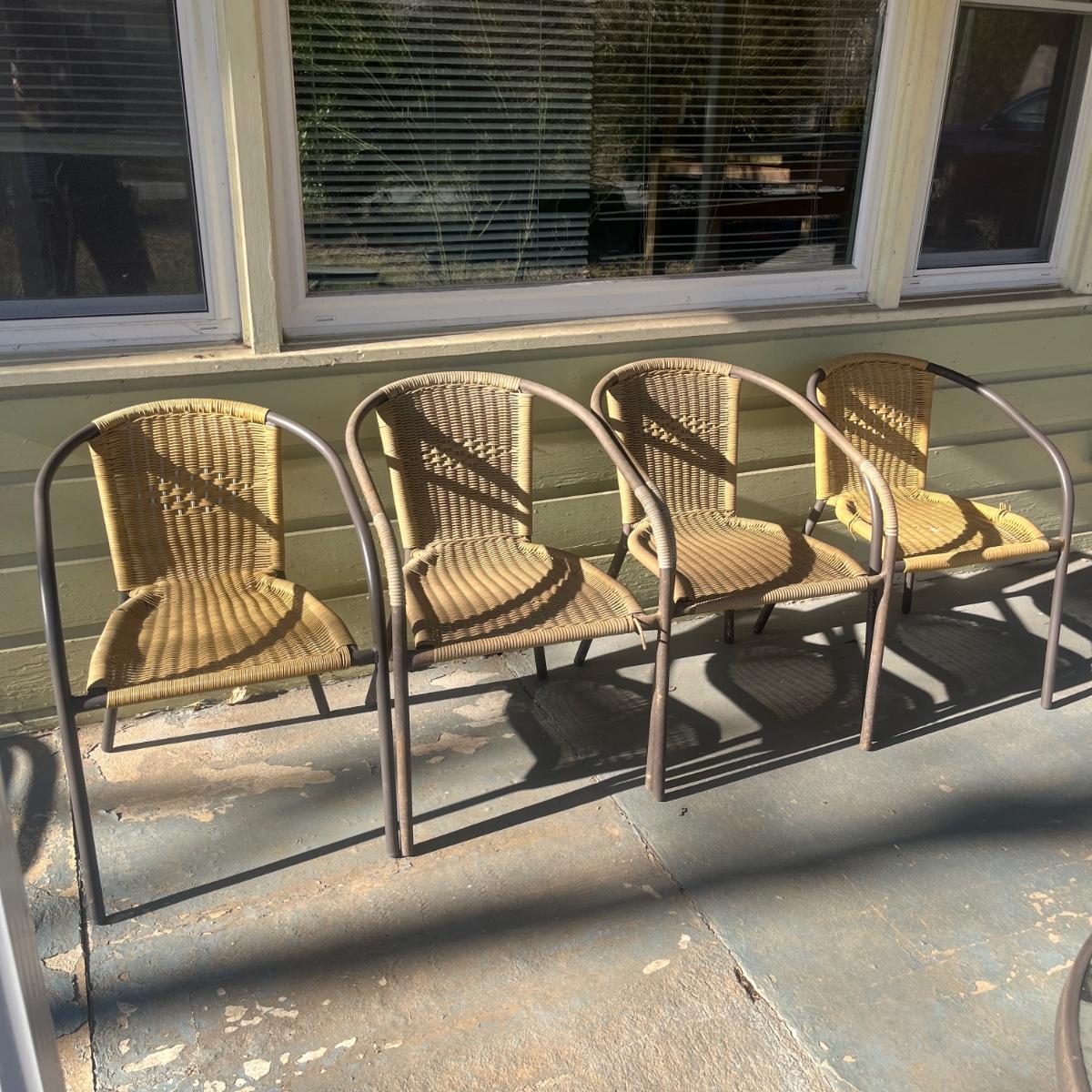 Lot includes four synthetic rattan wicker chairs with metal frames that each measure 22” x 24” x 30”H with a 17”H seat height. Plus a metal framed glass top table that measures 24”D x 28”H. Some of the chairs have loose pieces in the weave. Please see pictures.