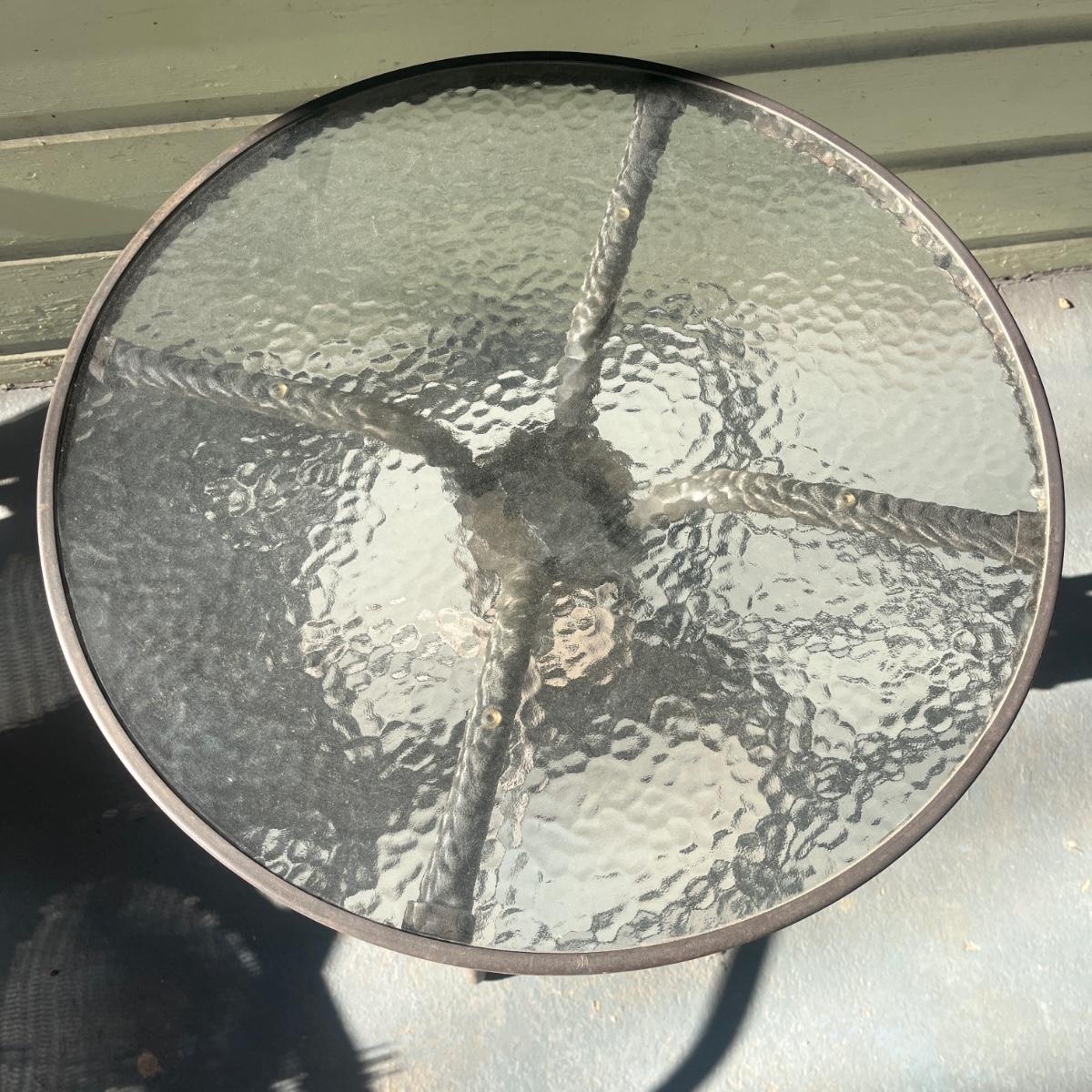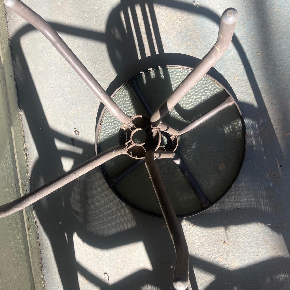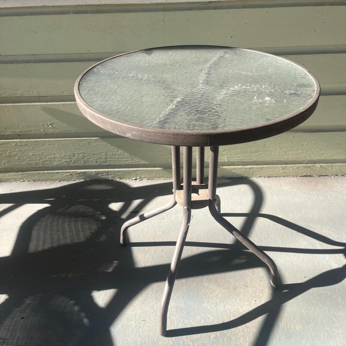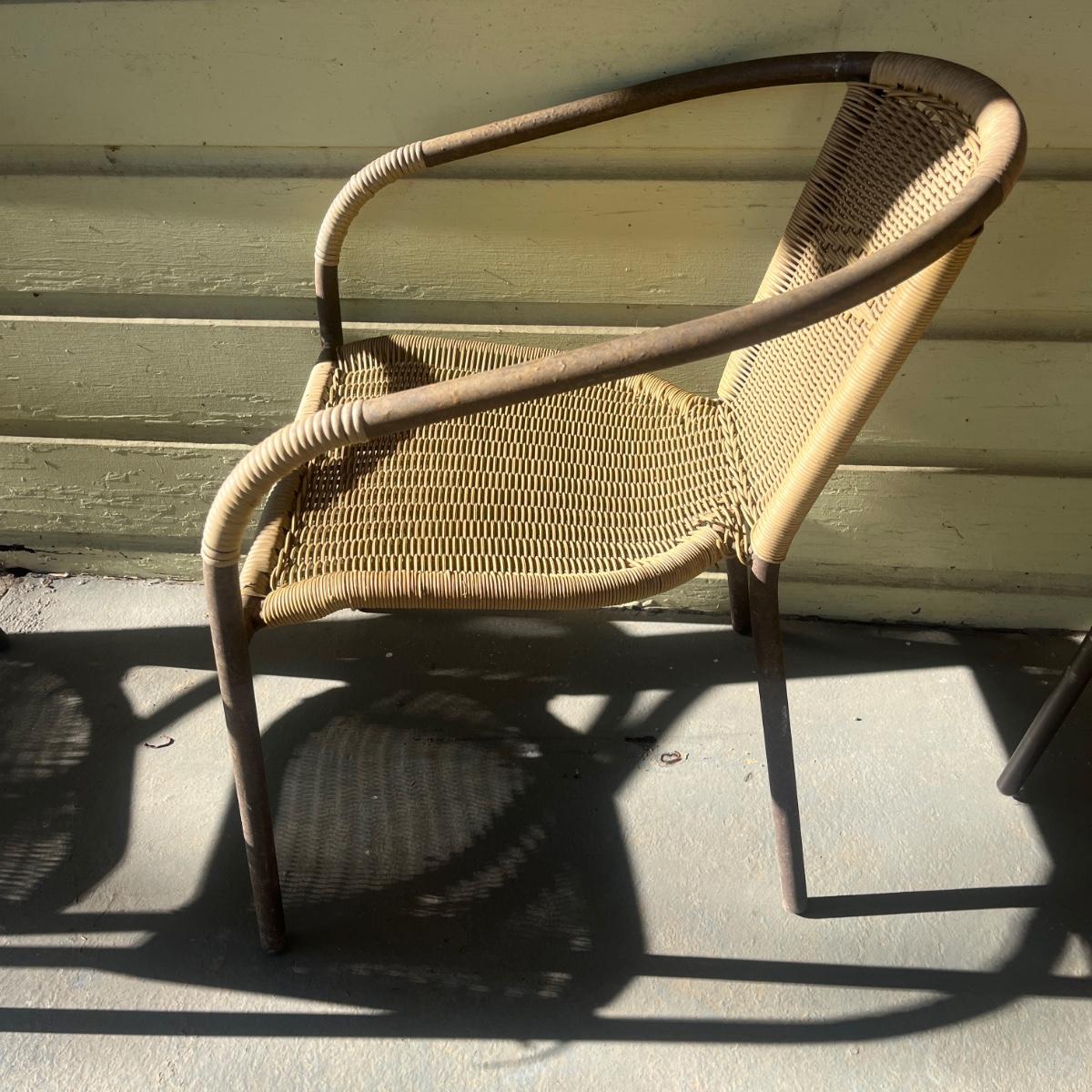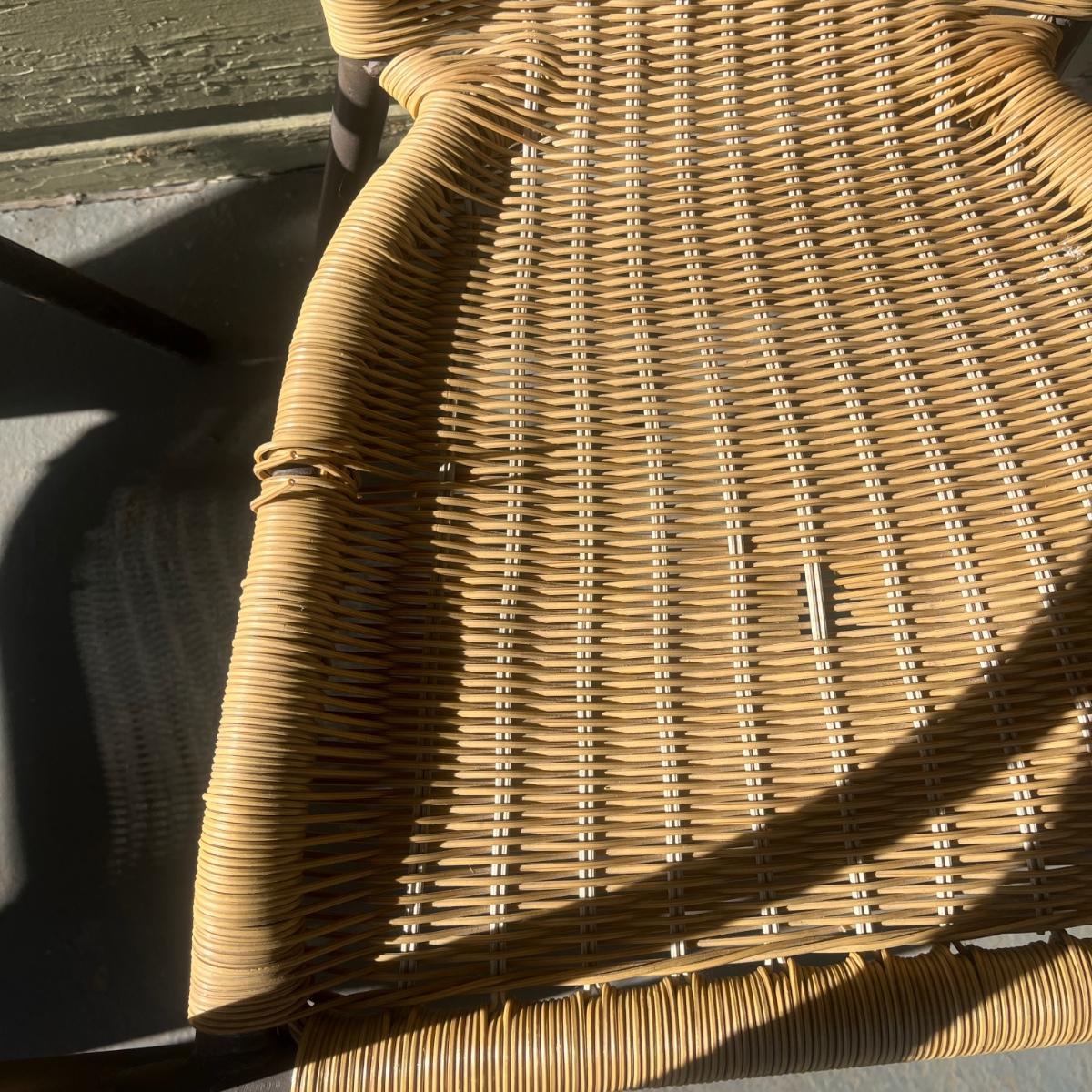 Lot includes four synthetic rattan wicker chairs with metal frames that each measure 22” x 24” x 30”H with a 17”H seat height. Plus a metal framed glass top table that measures 24”D x 28”H. Some of the chairs have loose pieces in the weave. Please see pictures.