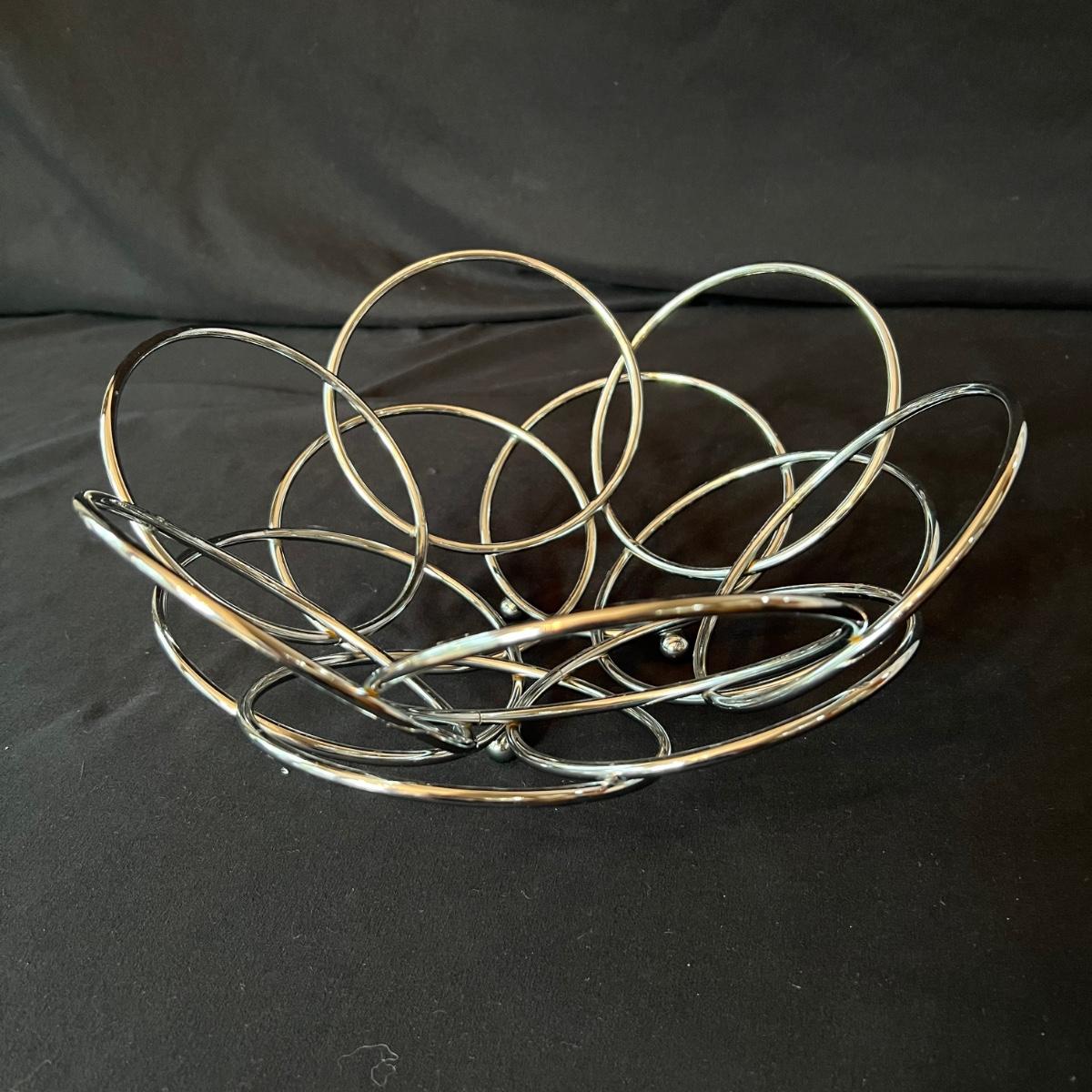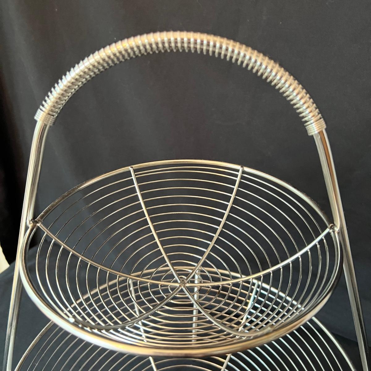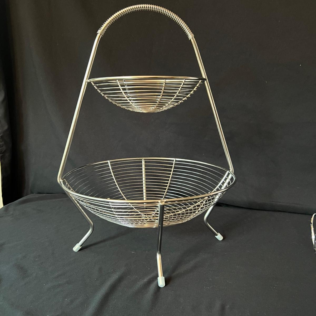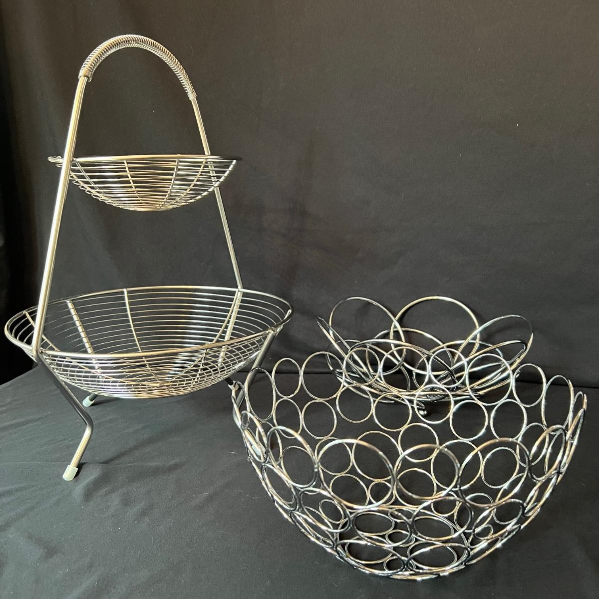 Three metal fruit bowls includes an aluminum footed, two tier stand that measures 13” D x 19” H.