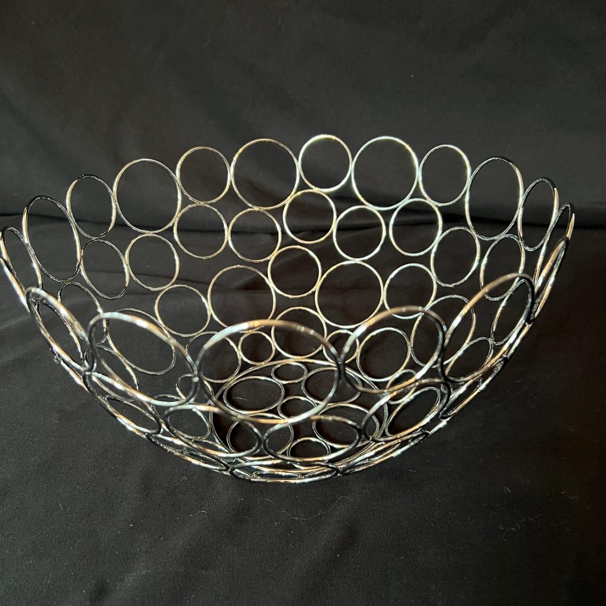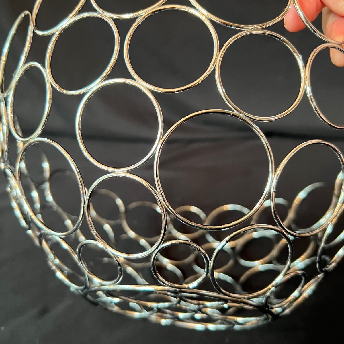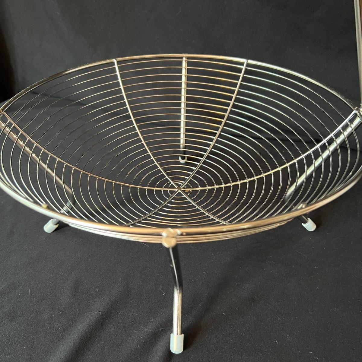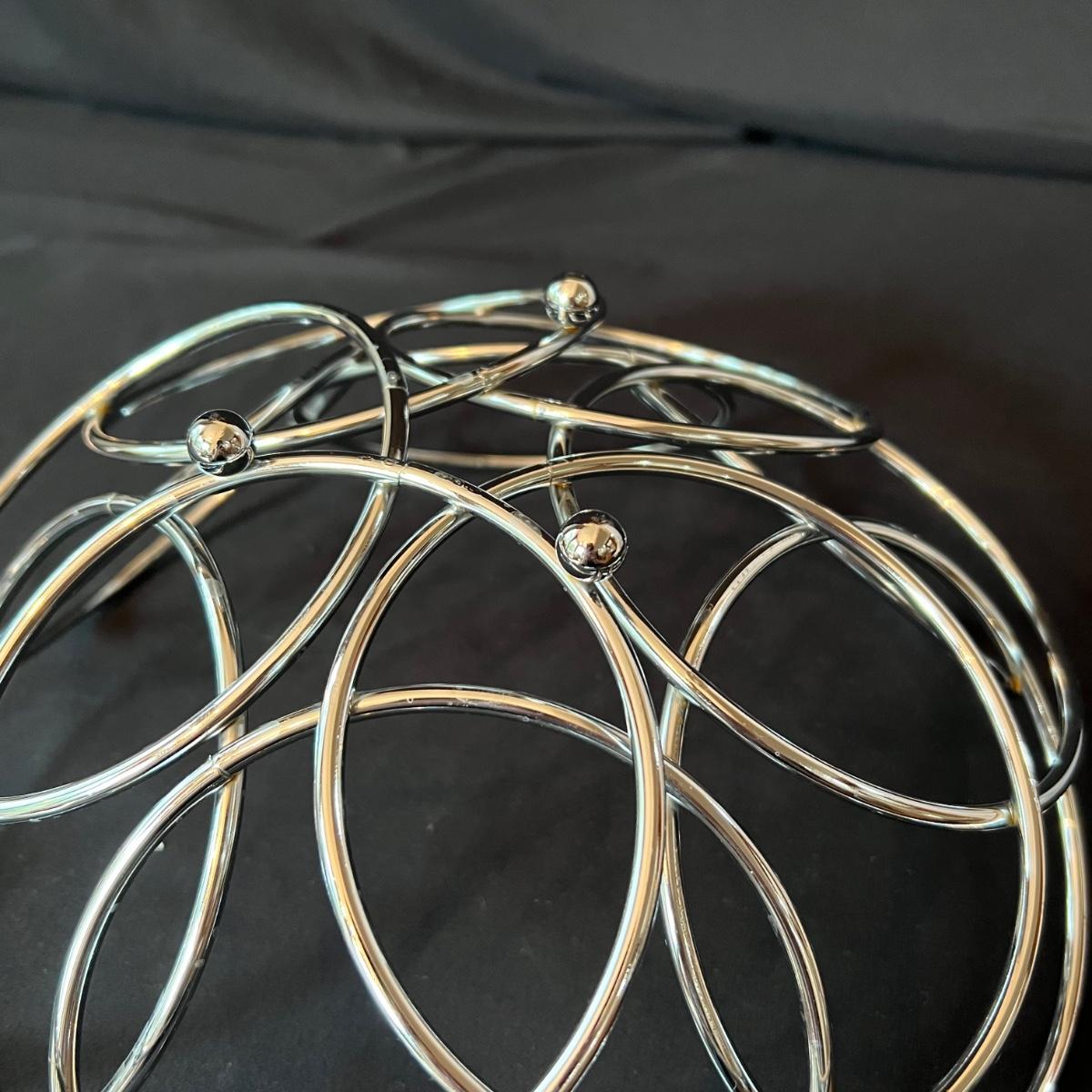 Three metal fruit bowls includes an aluminum footed, two tier stand that measures 13” D x 19” H.