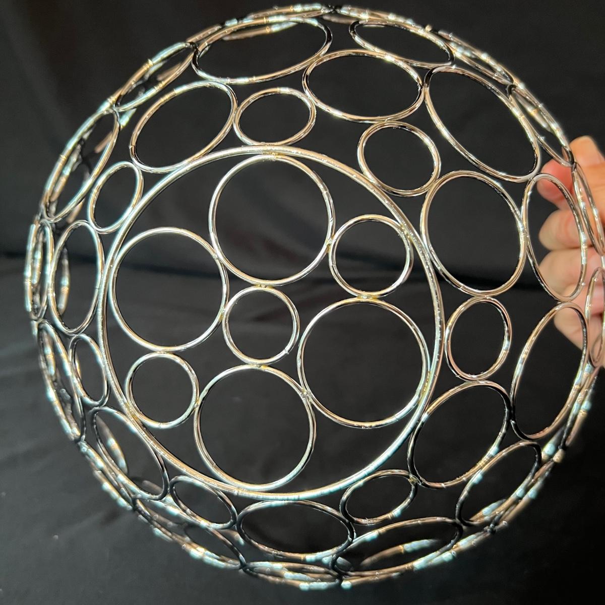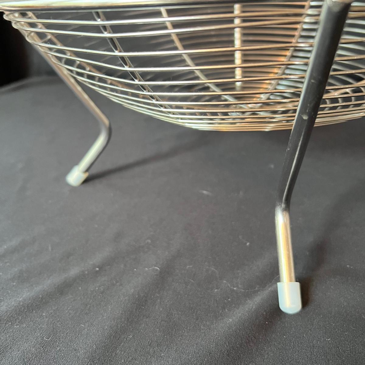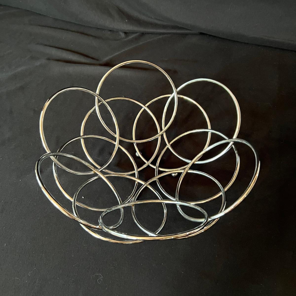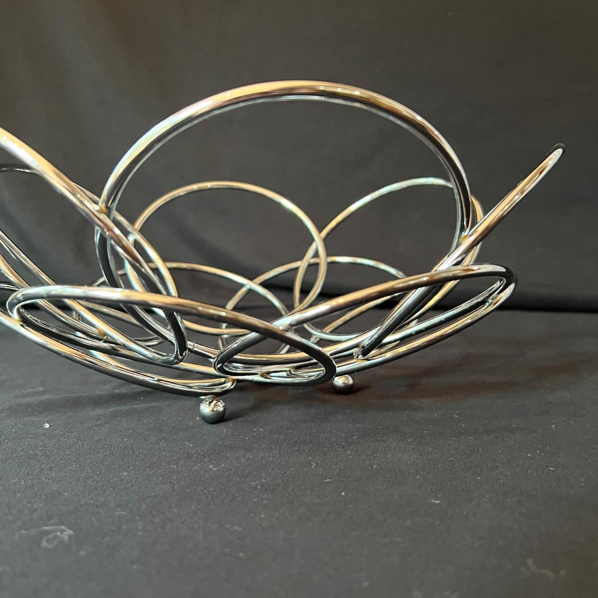 Three metal fruit bowls includes an aluminum footed, two tier stand that measures 13” D x 19” H.