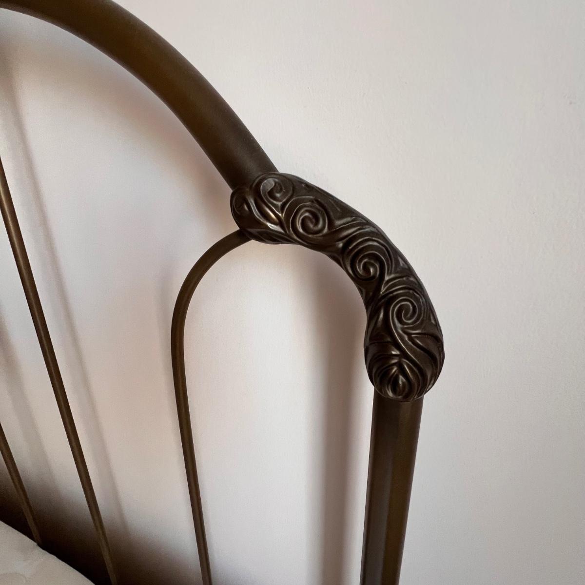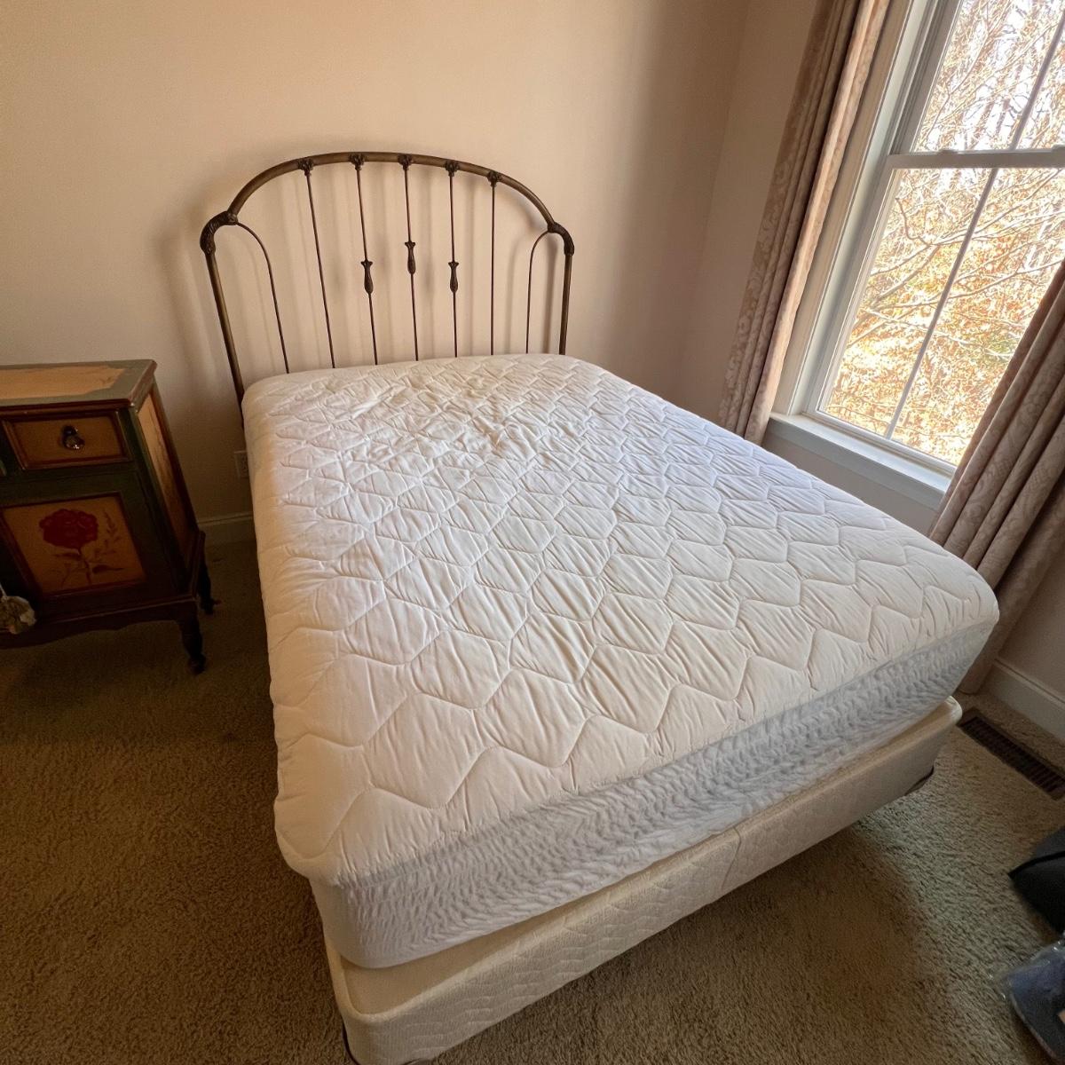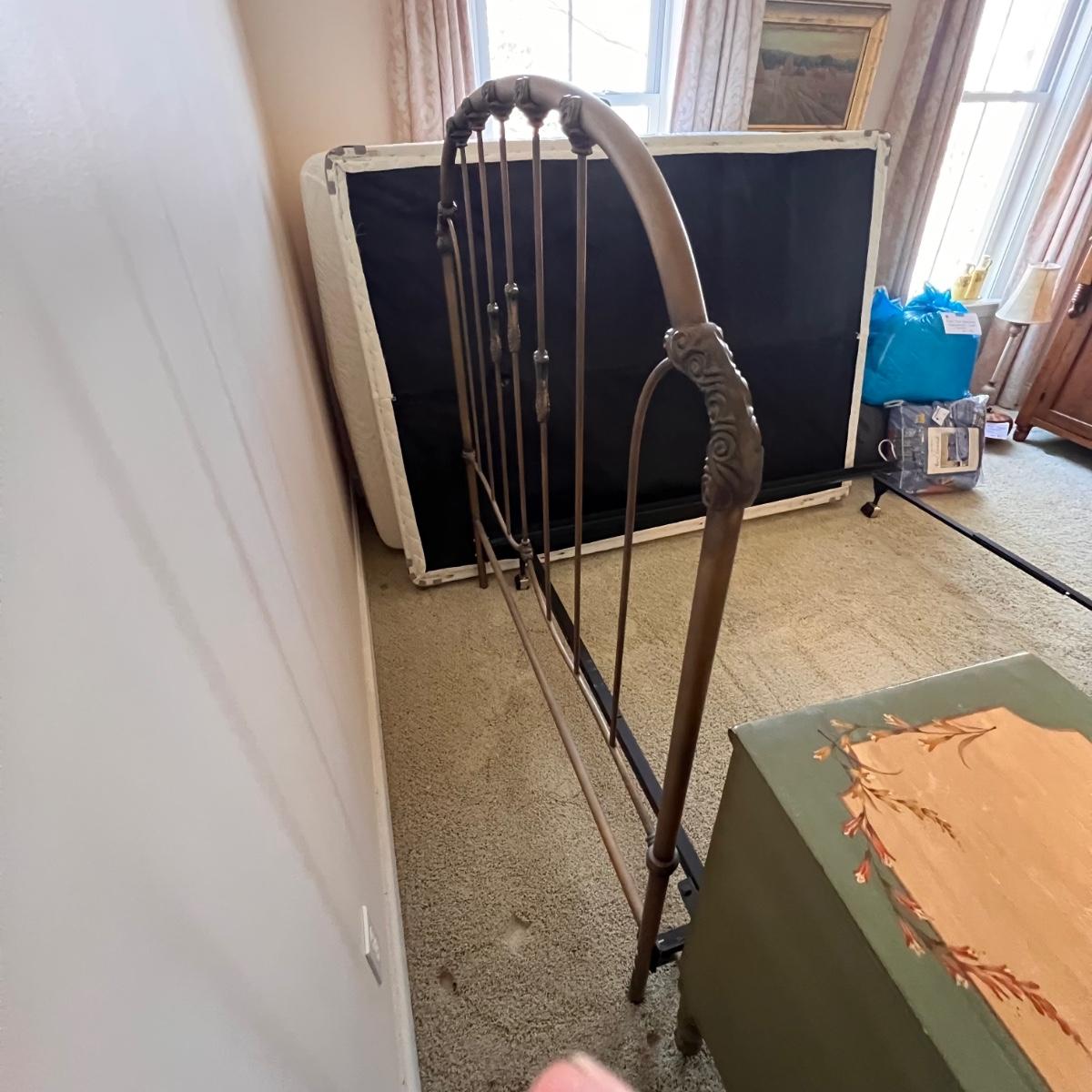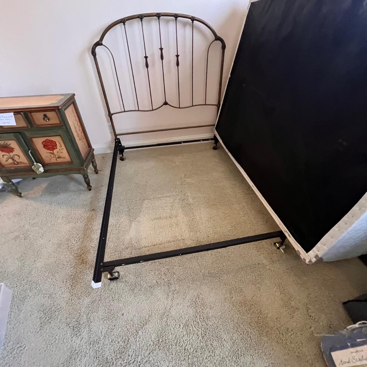 Beautiful metal full size bed frame has an aged bronze colored finish. This frame measures 53” x 56.5”H. The mattress frame is included and is attached to the frame with just two bolts that the winning bidder will be responsible to dismantle, (see pic for tool needed). The mattress and boxspring are available to the winning bidder to take if desired, but you do not have to. Per the homeowner, the headboard was purchased from Marshall Fields and the bed frame is from Tyson Furniture. This item is located on the ground floor. There are two exits from this level, each with 4 steps down leading to driveway. Local Pickup Only. Winning bidder must bring assistance to help move and load this item due to its weight and/or size.