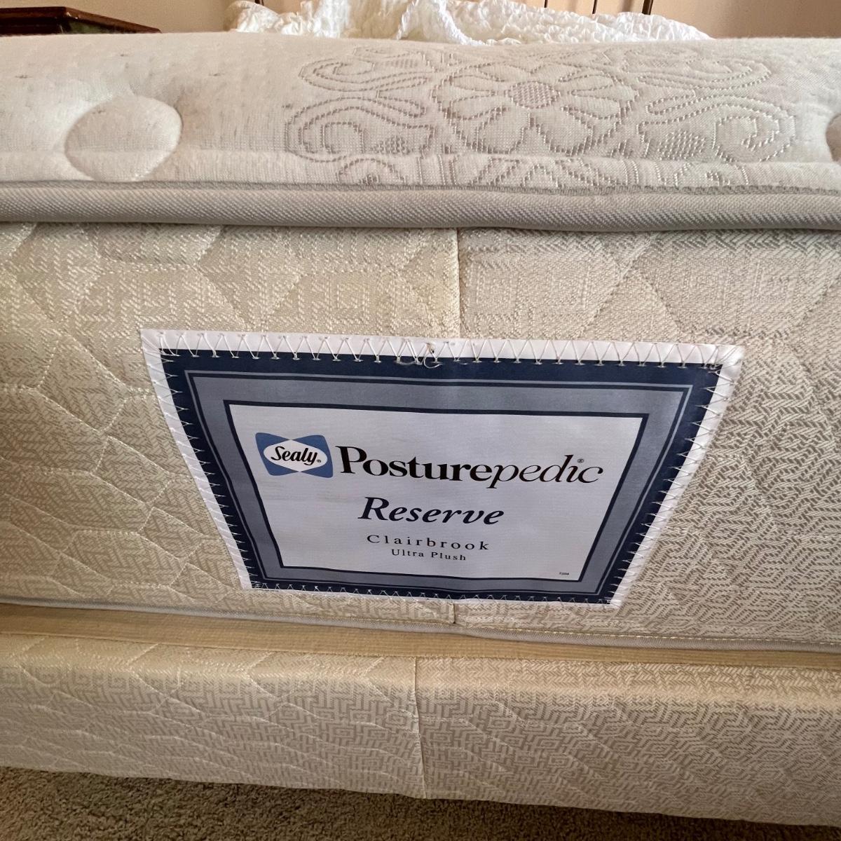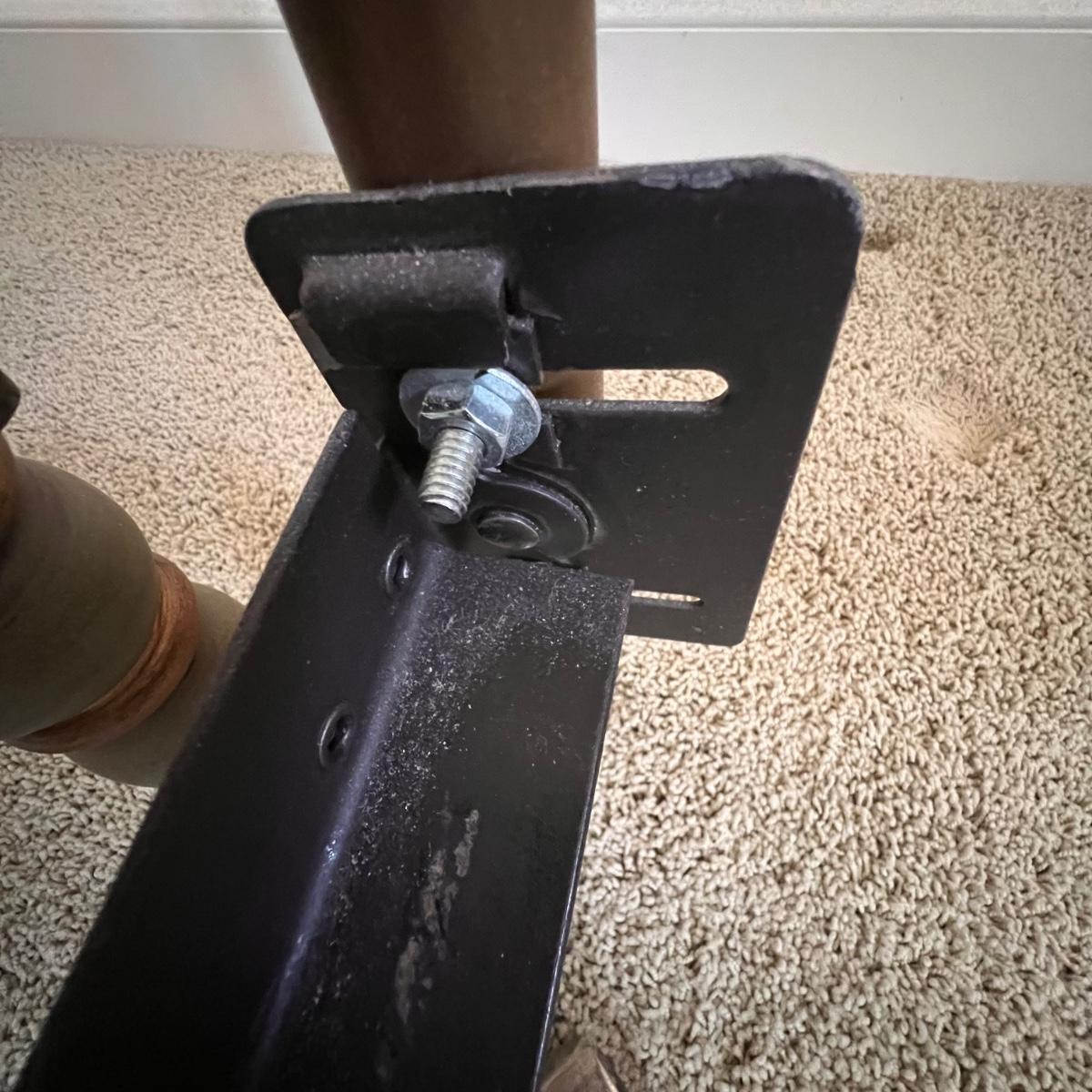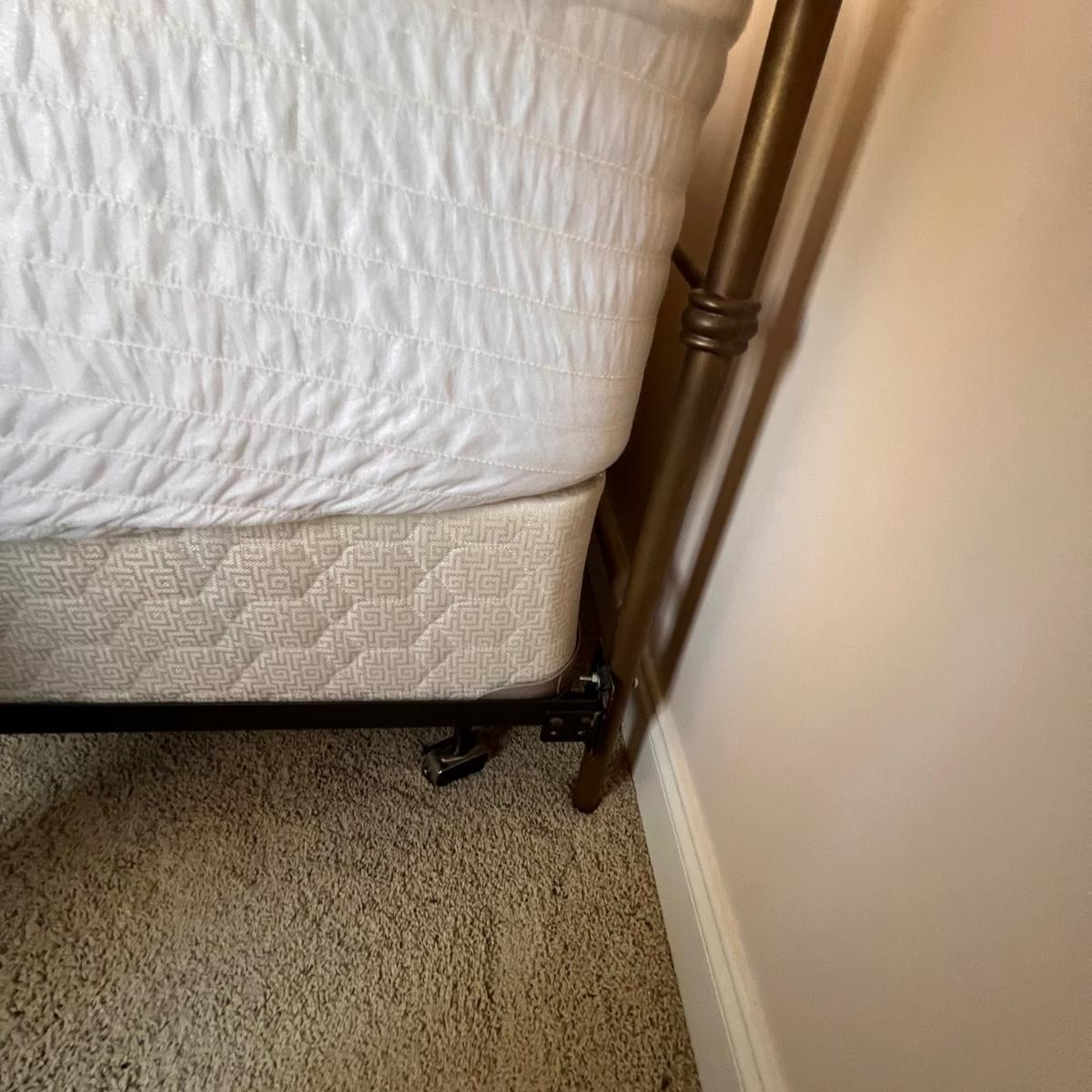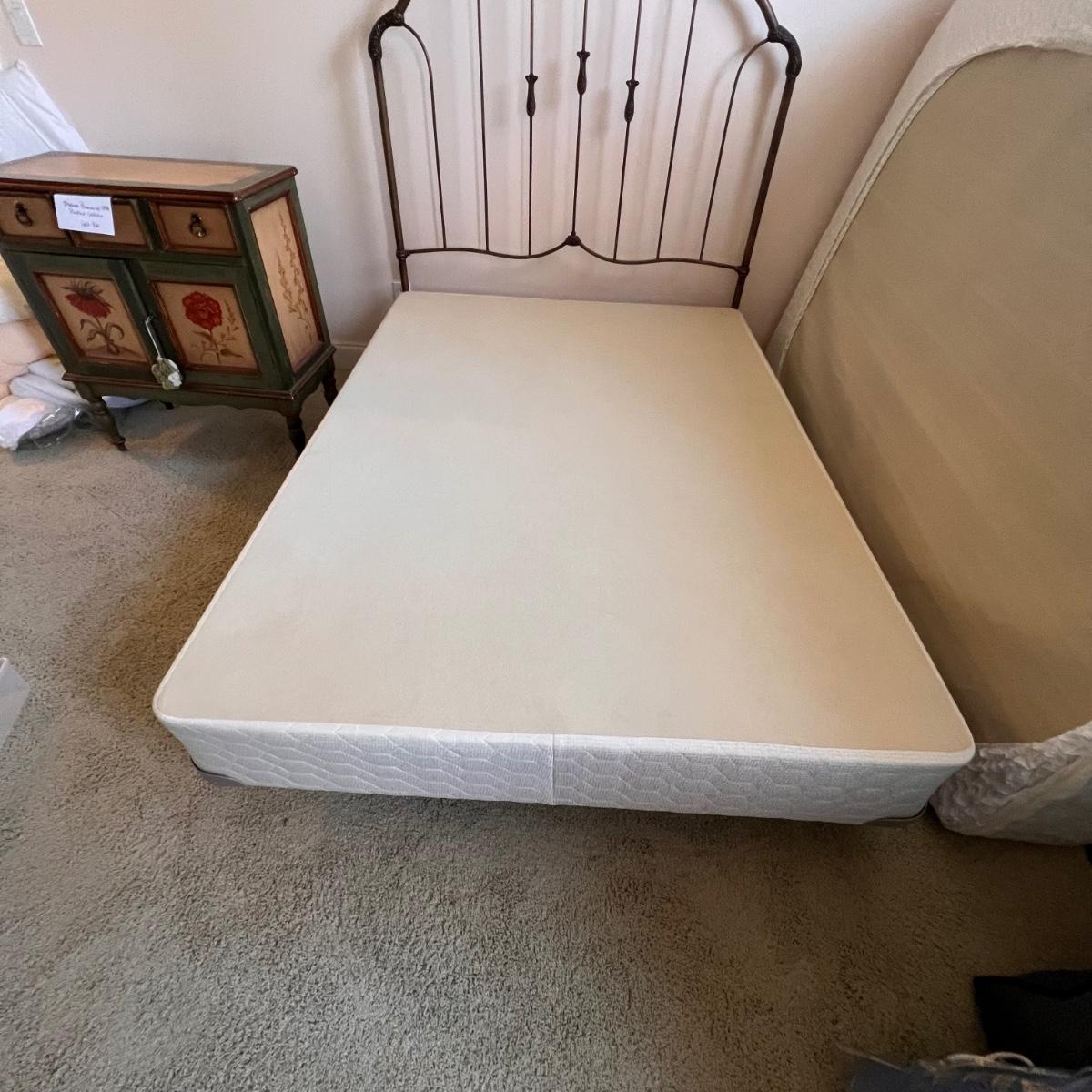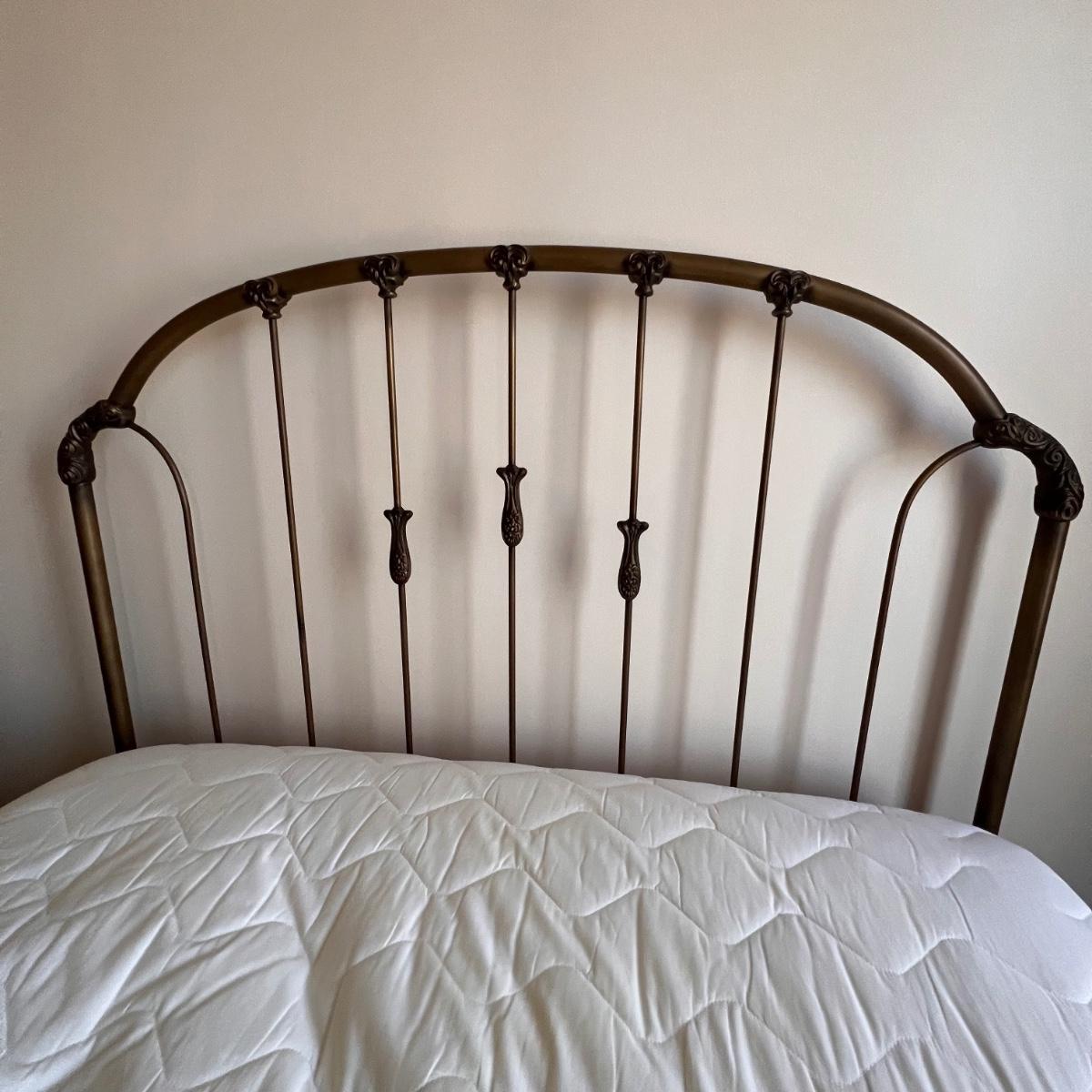 Beautiful metal full size bed frame has an aged bronze colored finish. This frame measures 53” x 56.5”H. The mattress frame is included and is attached to the frame with just two bolts that the winning bidder will be responsible to dismantle, (see pic for tool needed). The mattress and boxspring are available to the winning bidder to take if desired, but you do not have to. Per the homeowner, the headboard was purchased from Marshall Fields and the bed frame is from Tyson Furniture. This item is located on the ground floor. There are two exits from this level, each with 4 steps down leading to driveway. Local Pickup Only. Winning bidder must bring assistance to help move and load this item due to its weight and/or size.