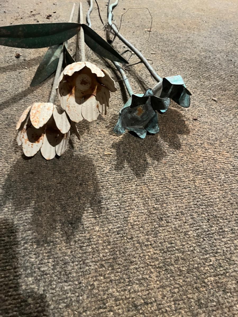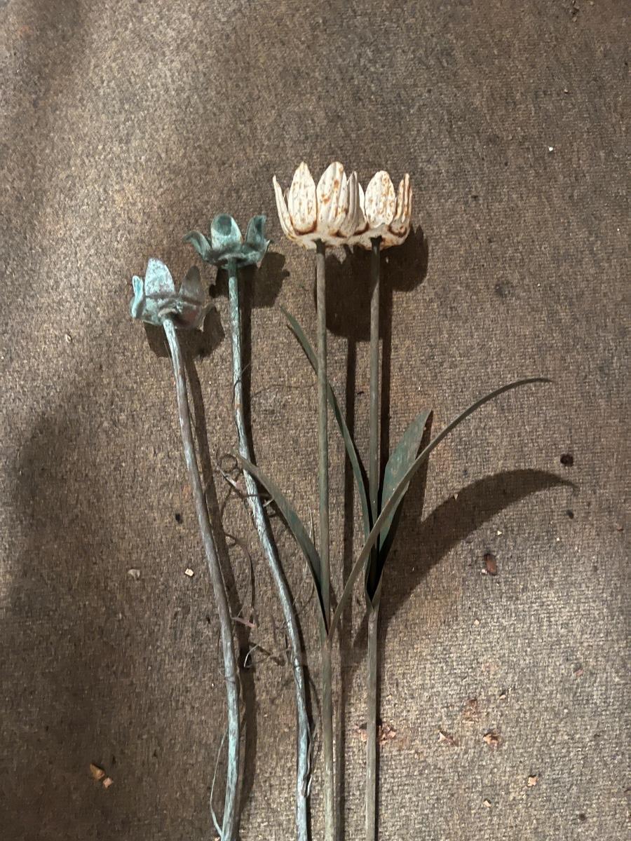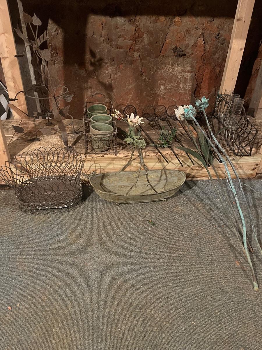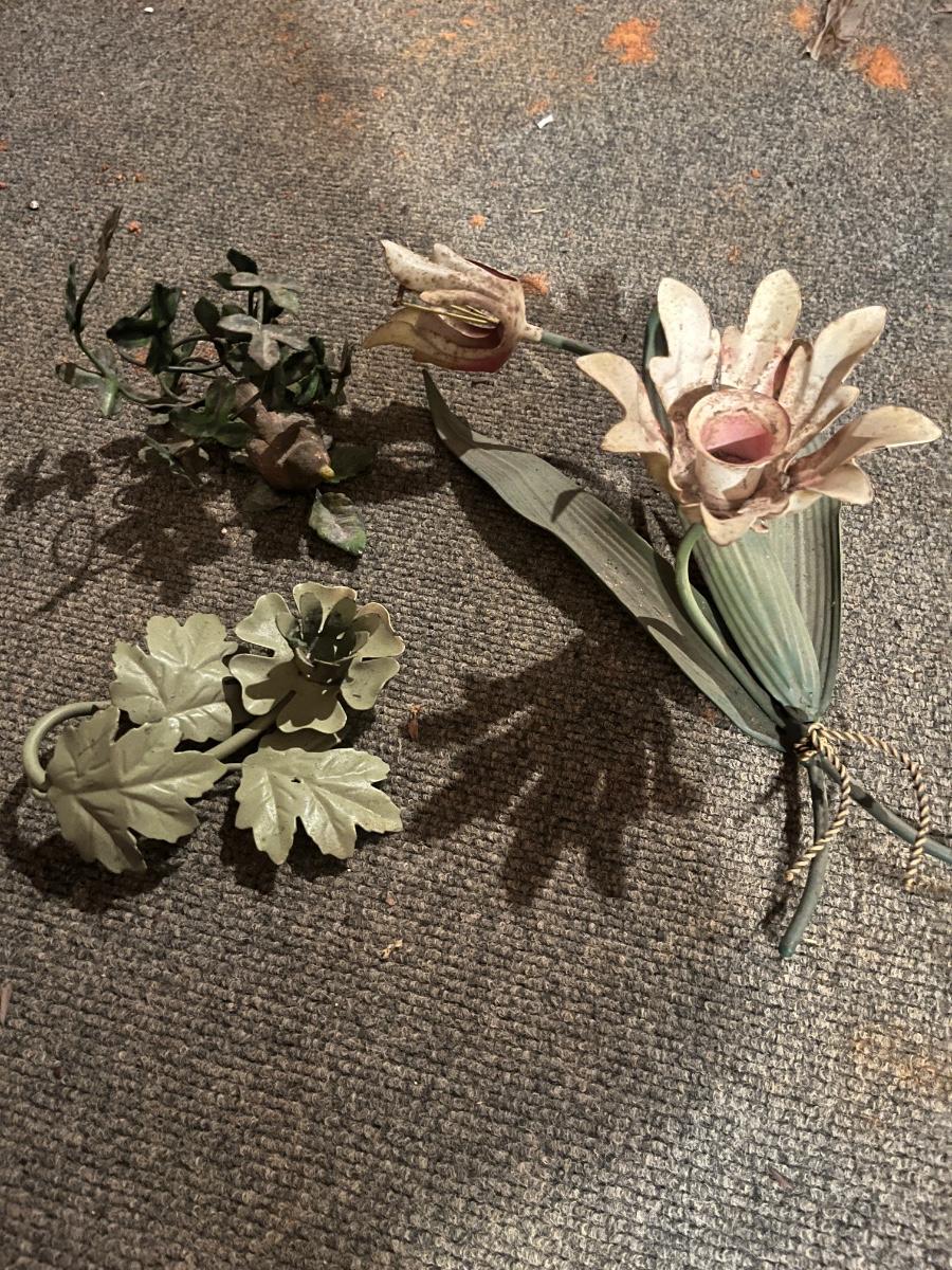 Lot includes four metal flowers, seven metal holders, plant stand, dragonfly themed flower holder and more. Tallest metal flower measures 3”D x 36”tall.