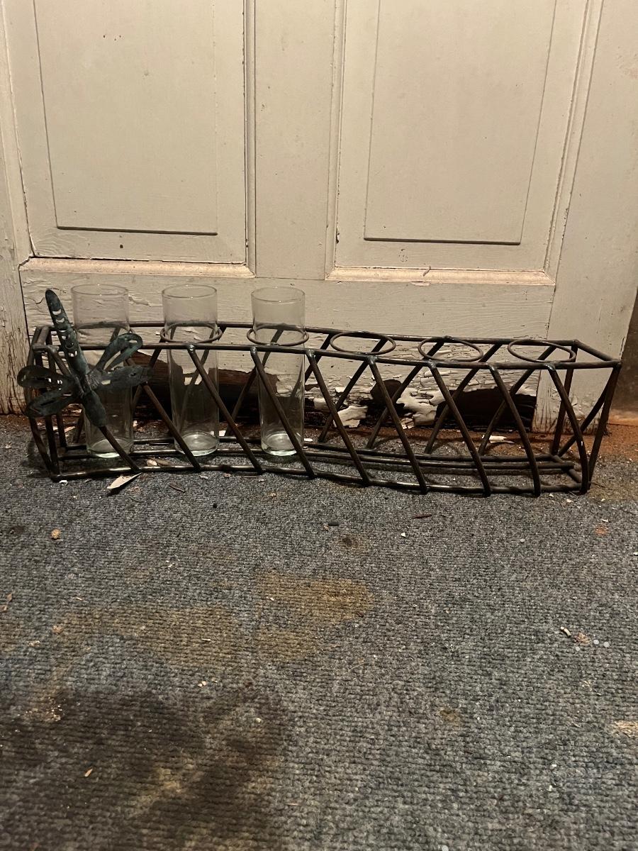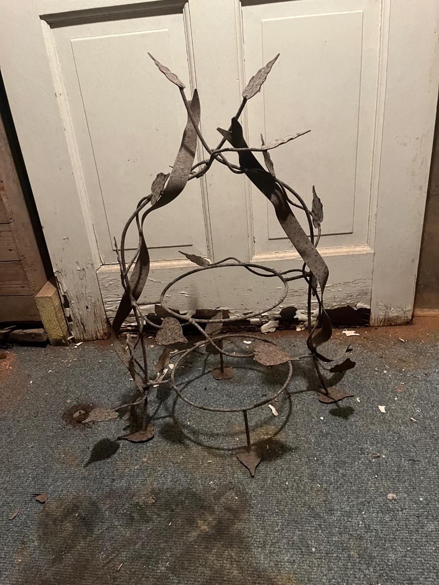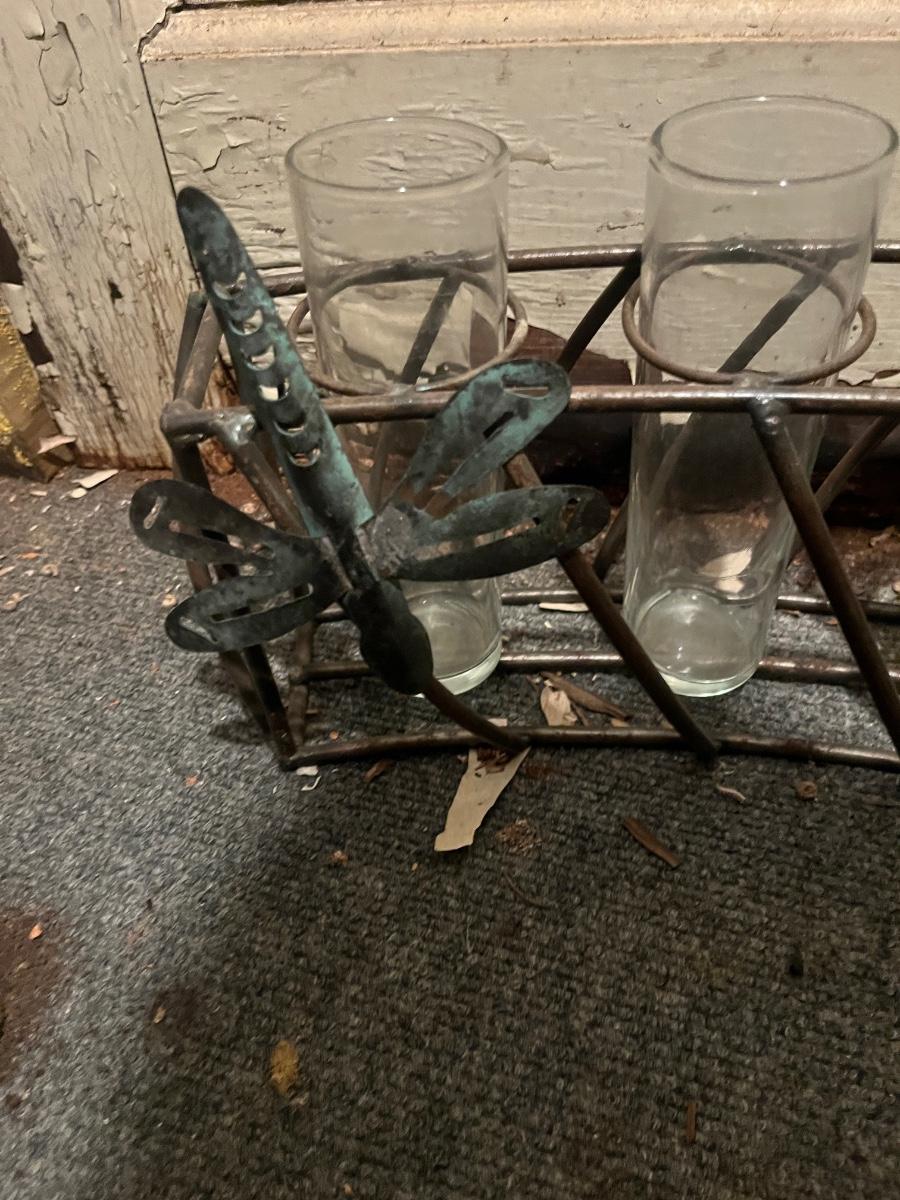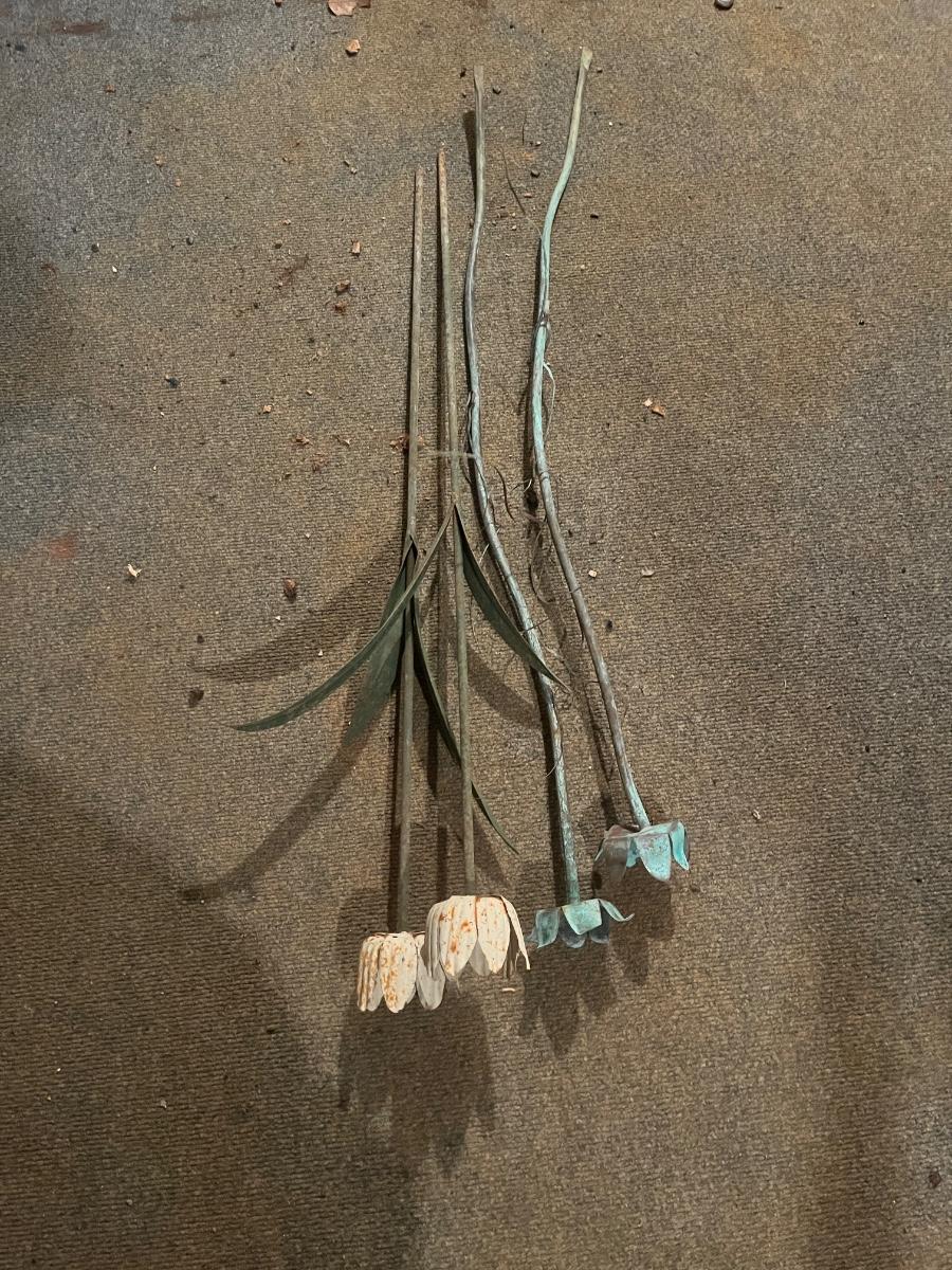 Lot includes four metal flowers, seven metal holders, plant stand, dragonfly themed flower holder and more. Tallest metal flower measures 3”D x 36”tall.