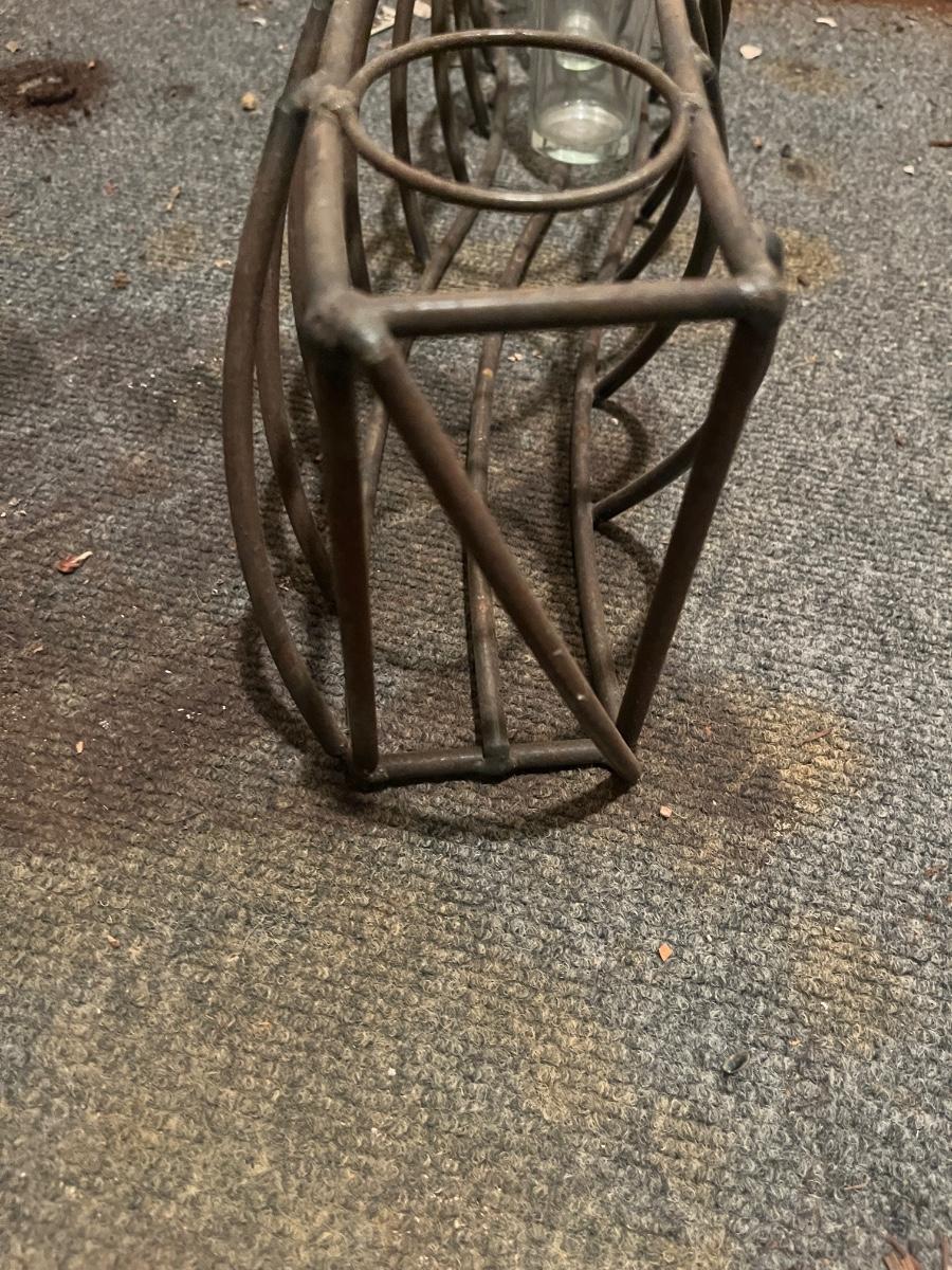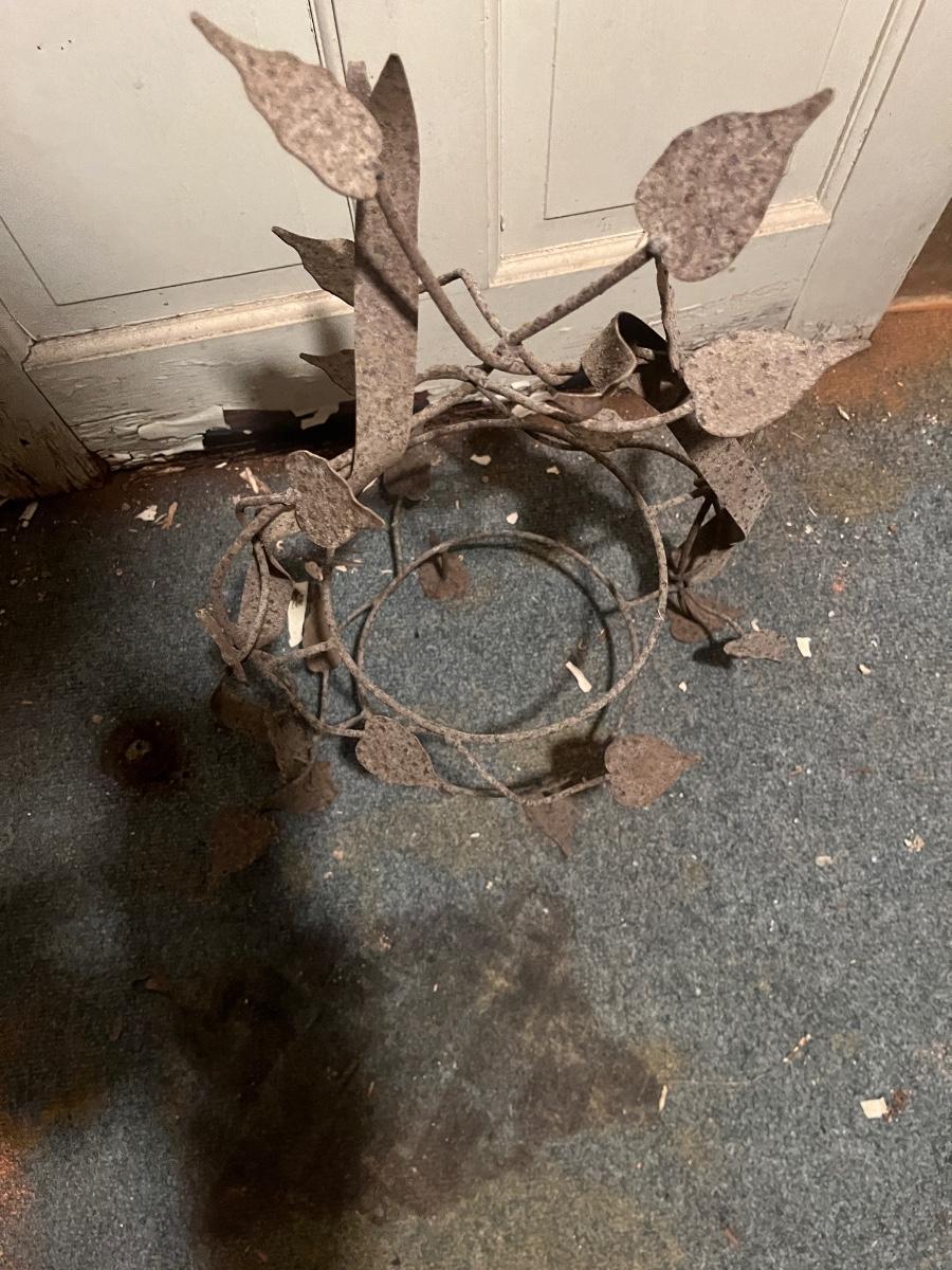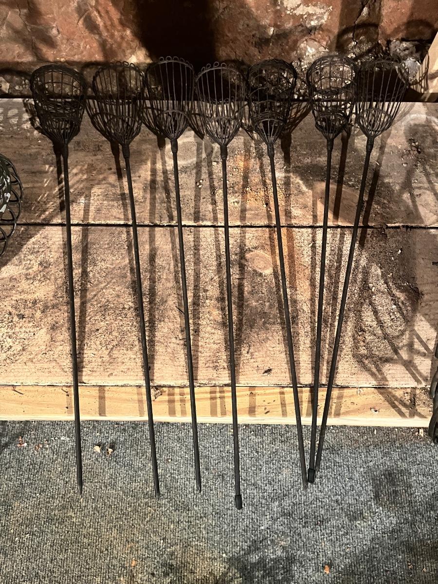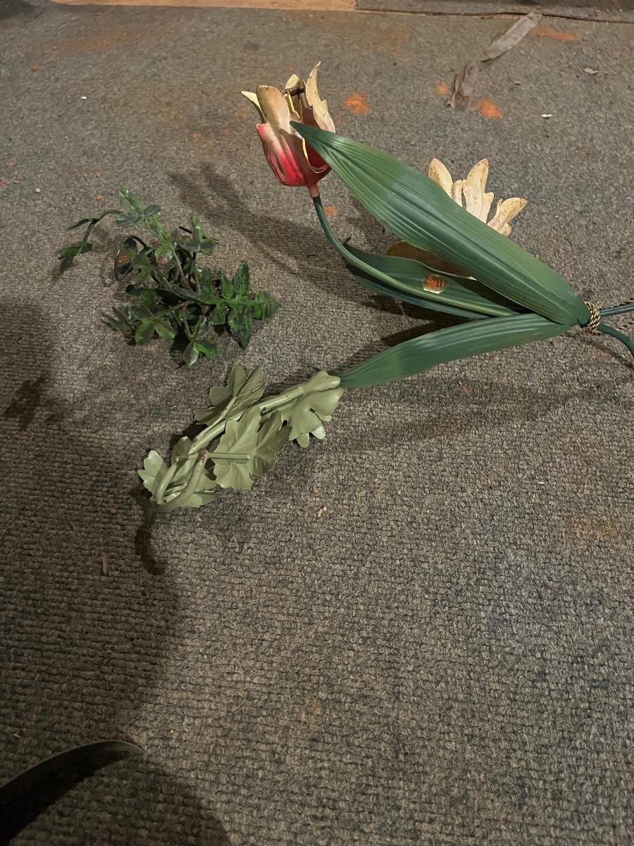 Lot includes four metal flowers, seven metal holders, plant stand, dragonfly themed flower holder and more. Tallest metal flower measures 3”D x 36”tall.