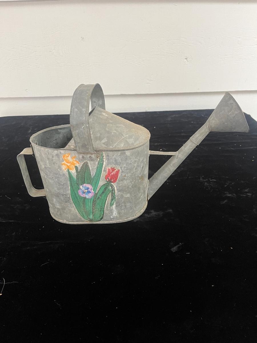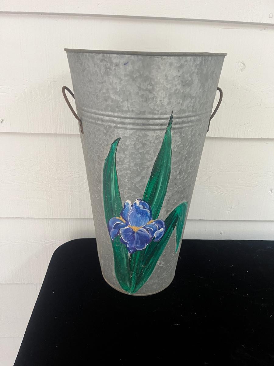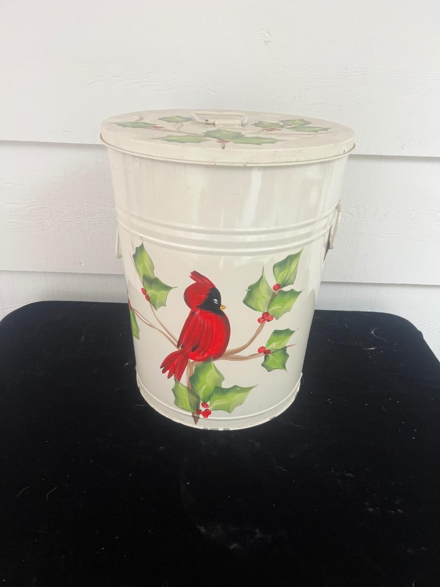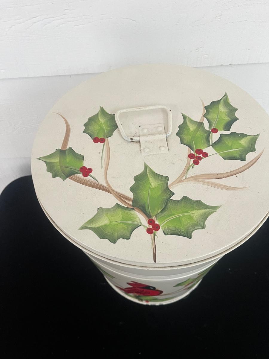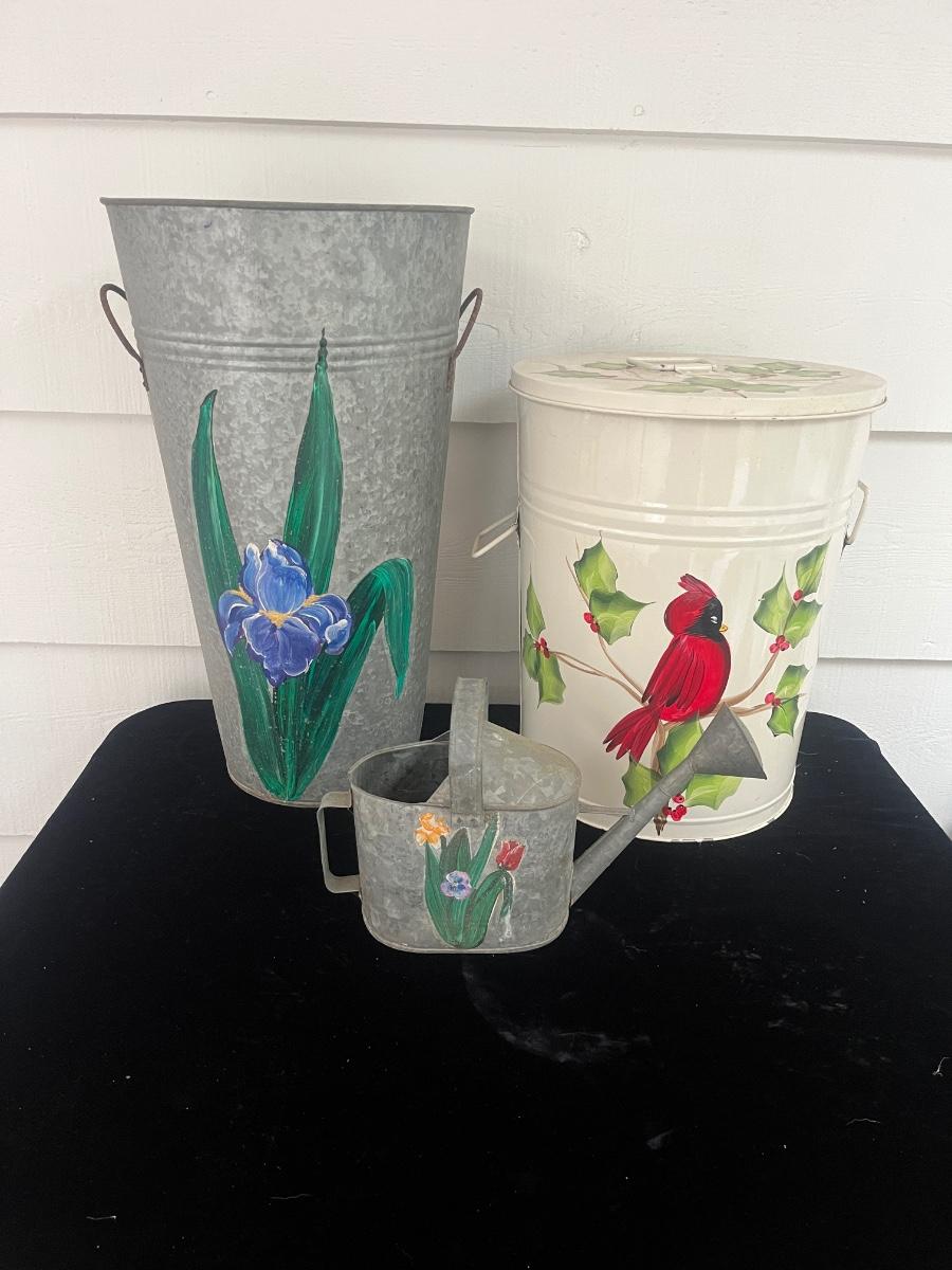 Lot features a white metal can with lid, painted with cardinal and holly. Lot also includes a metal water can with painted flowers and a tall metal pot with painted on flowers. White can measures 13”D x 16”H.