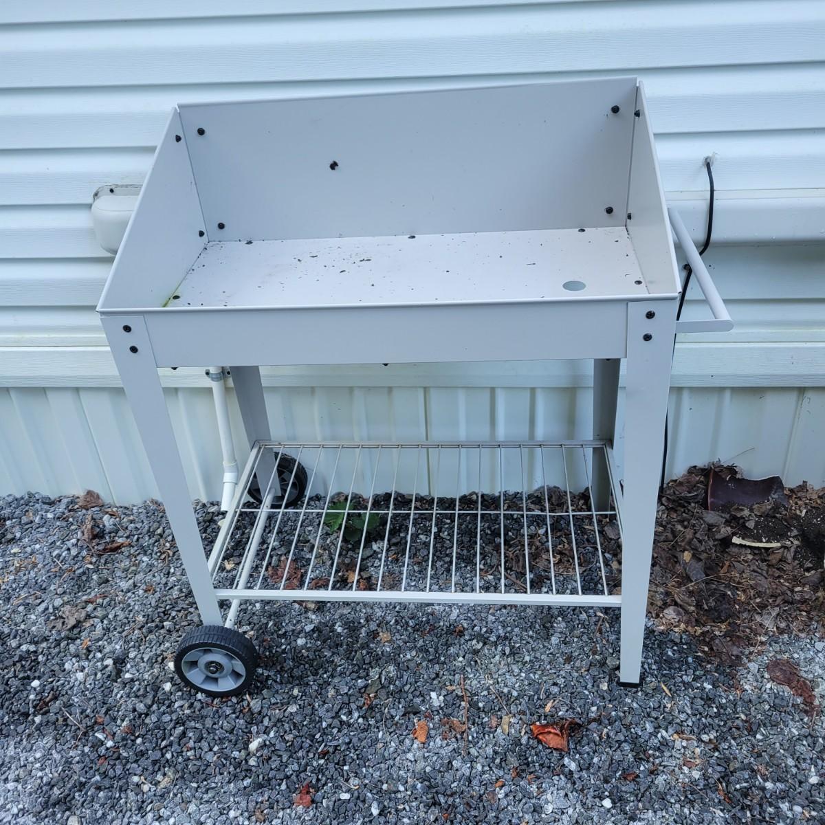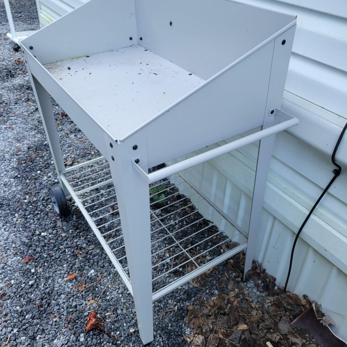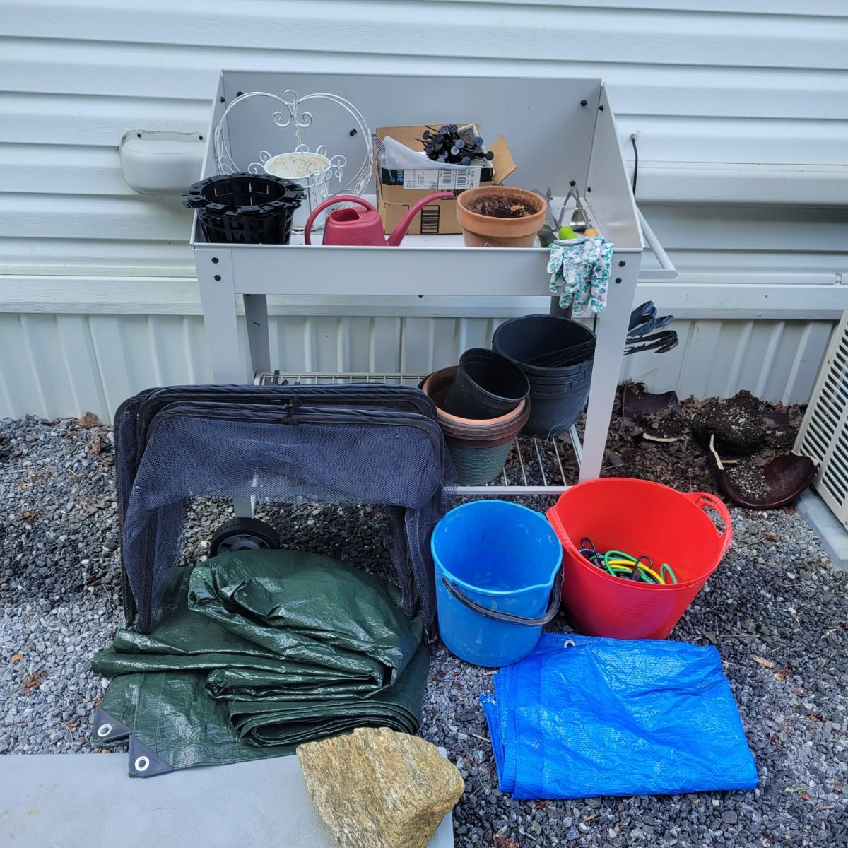 A metal gardening cart that measures approximately 35" x 19" x 38"H and has plastic wheels. Also included is an assortment of plastic pots and hanging baskets, hand tools, tarps, plant stakes, labels and more. Local pickup only