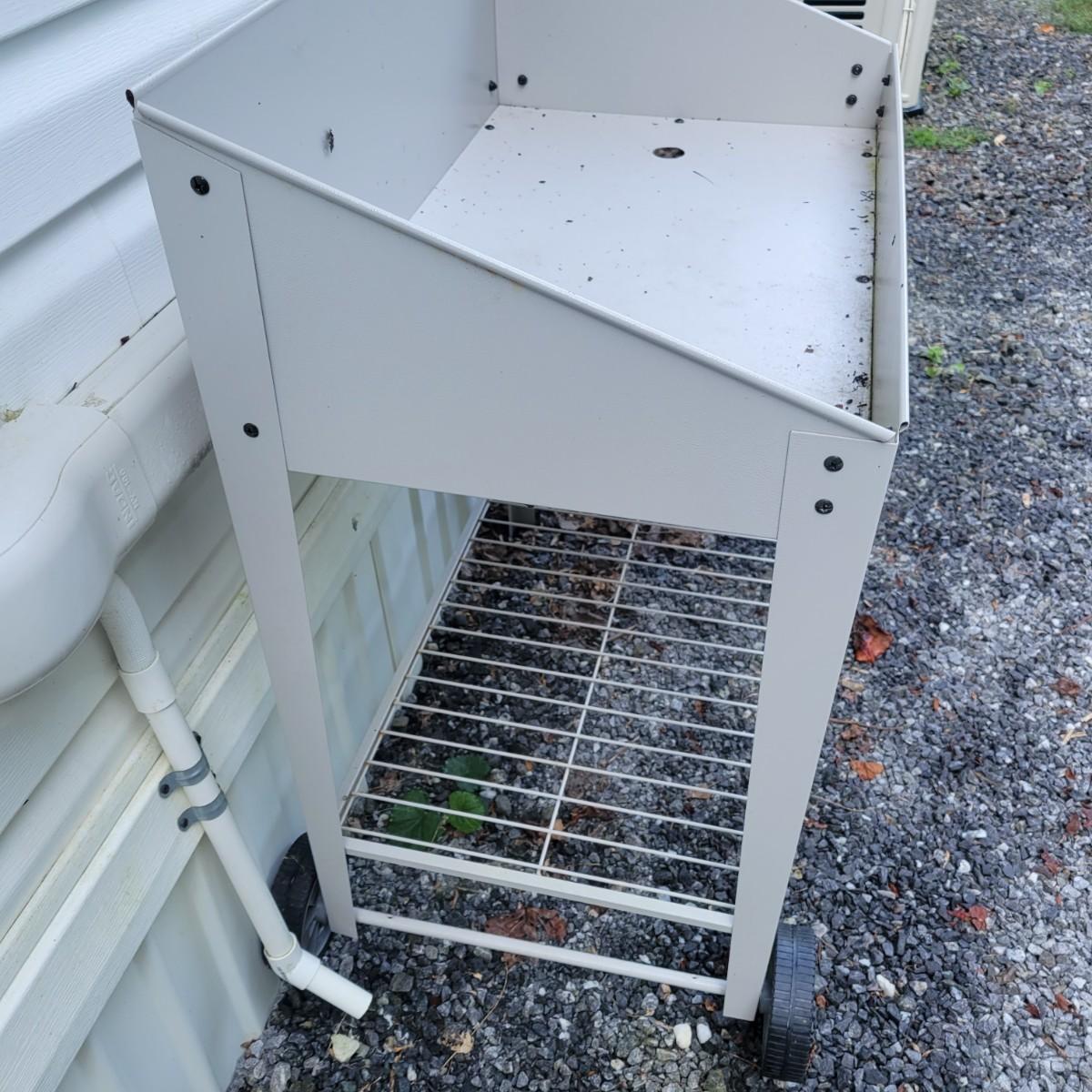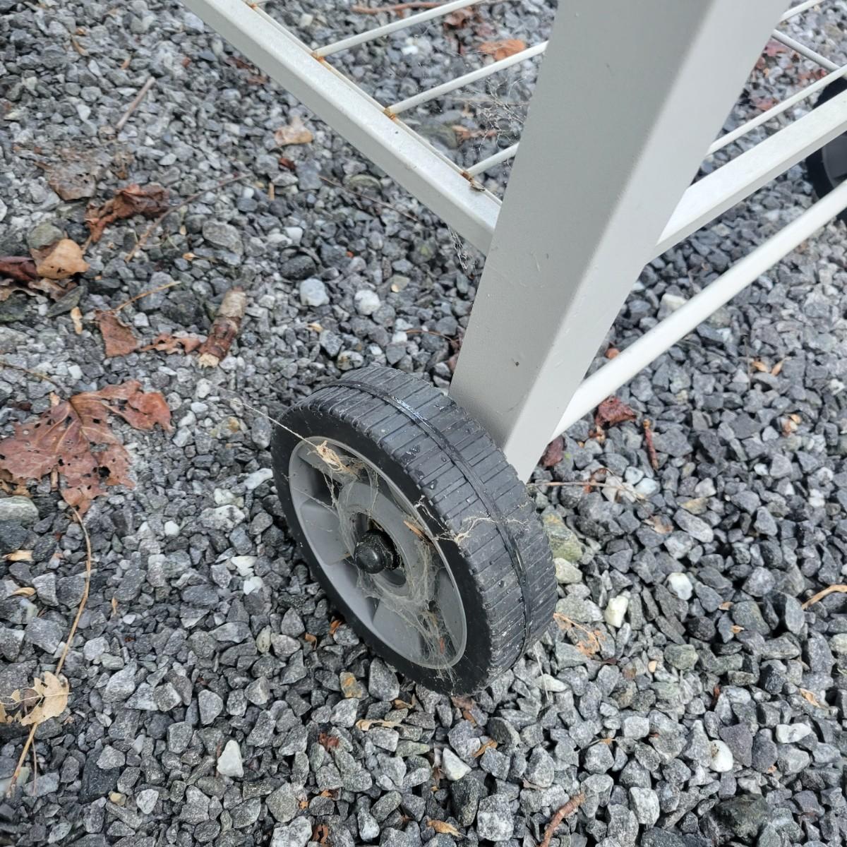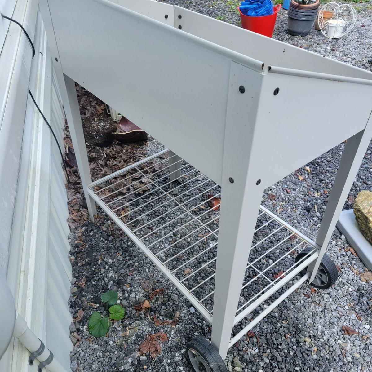 A metal gardening cart that measures approximately 35" x 19" x 38"H and has plastic wheels. Also included is an assortment of plastic pots and hanging baskets, hand tools, tarps, plant stakes, labels and more. Local pickup only