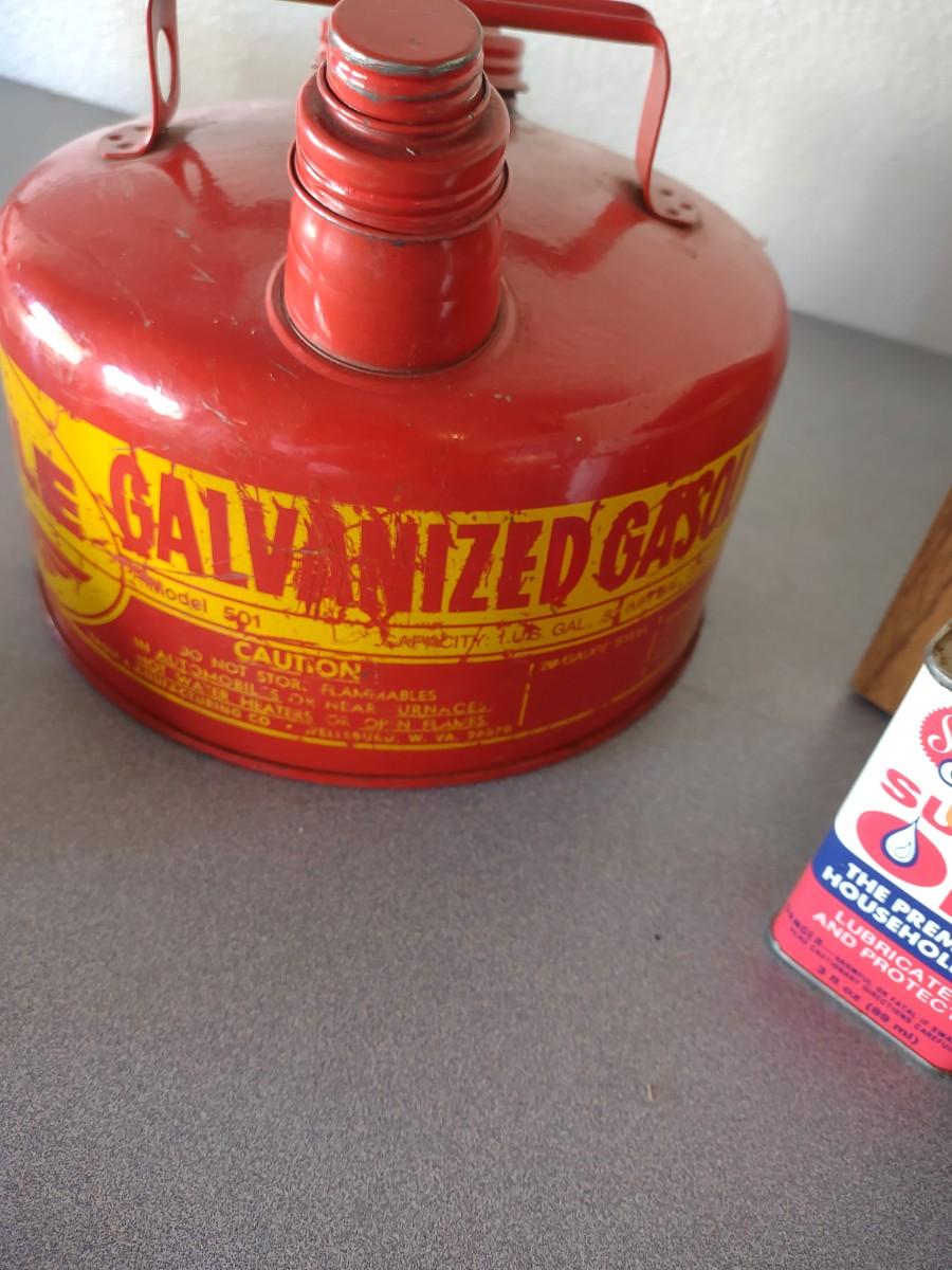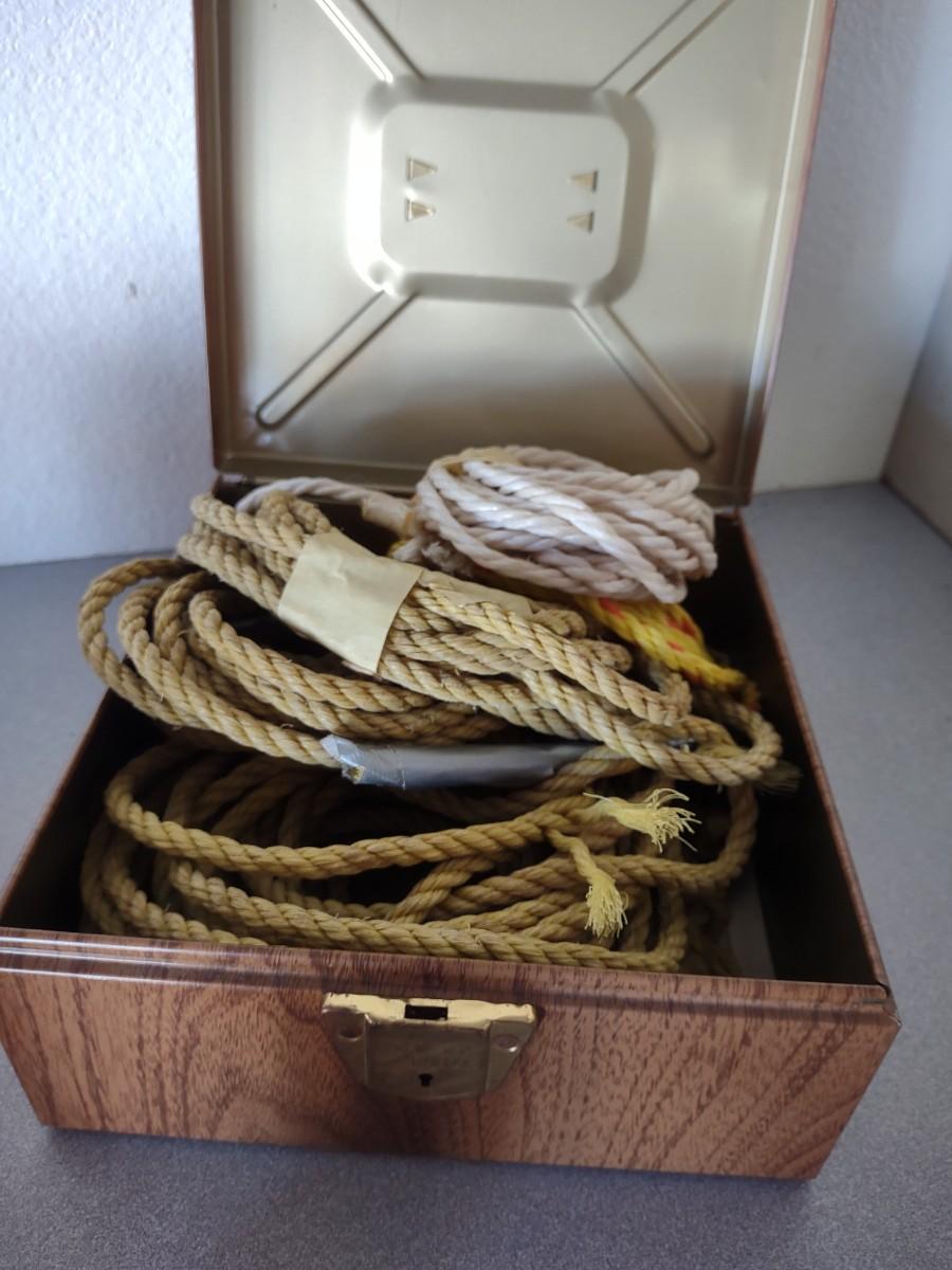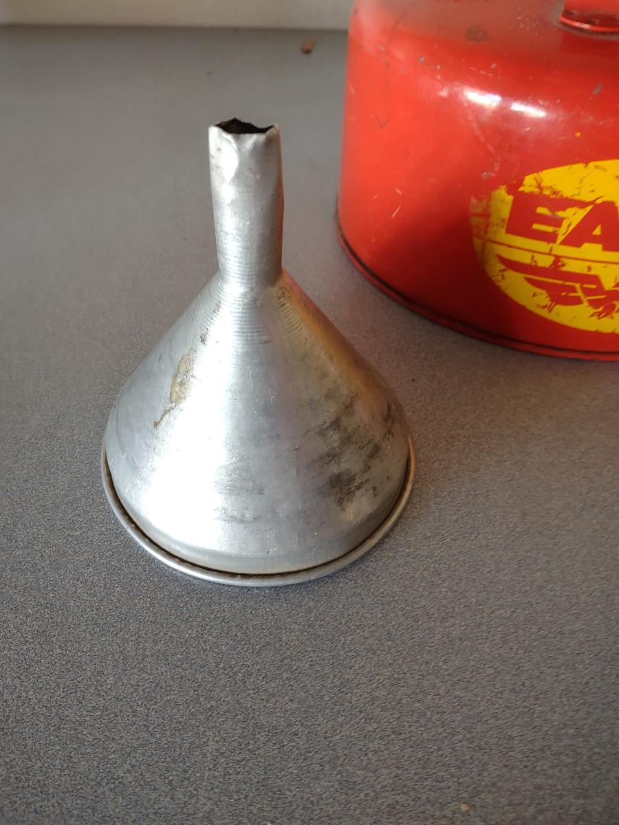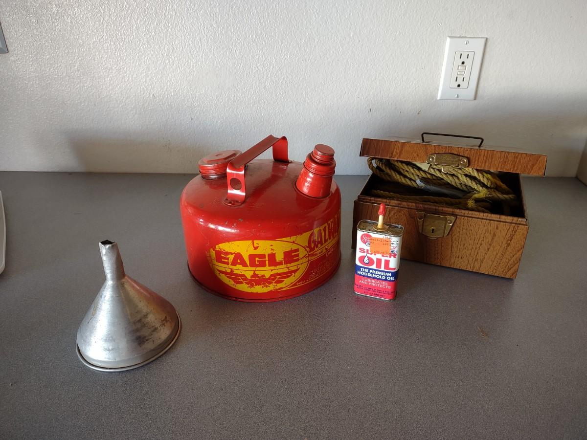 METAL GAS CAN, PIECES OF ROPE, FUNNEL & OIL