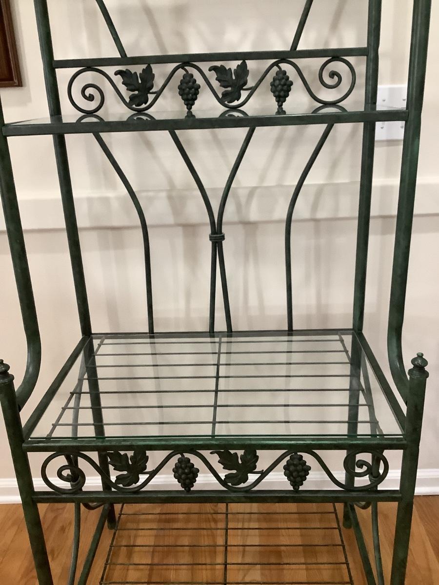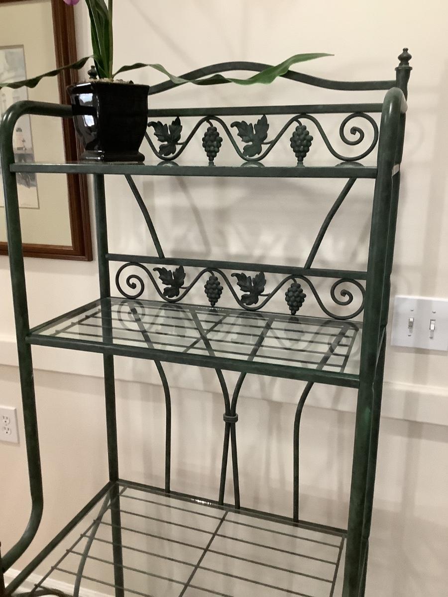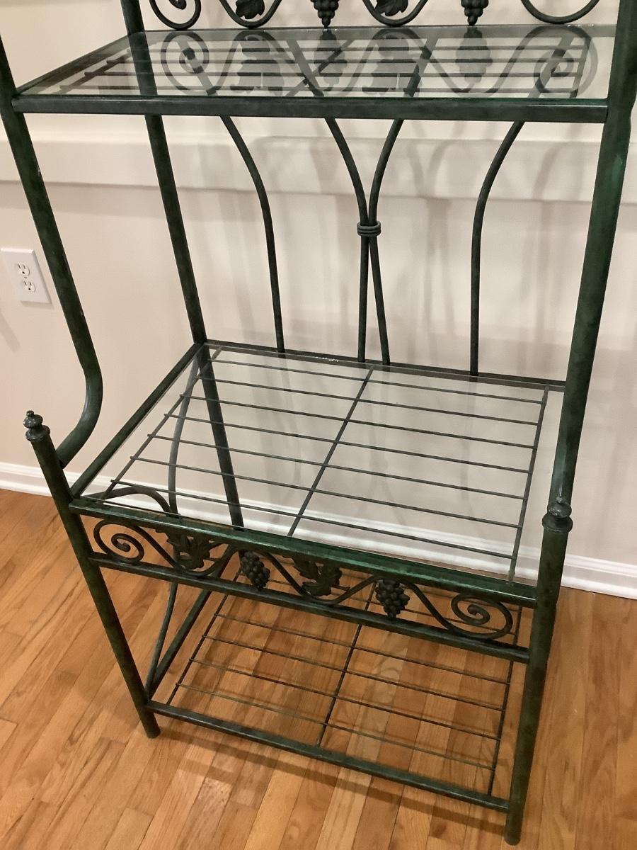 Metal & glass baker’s rack, 4 shelves, 3 with glass 65”H 27”W 18”depth