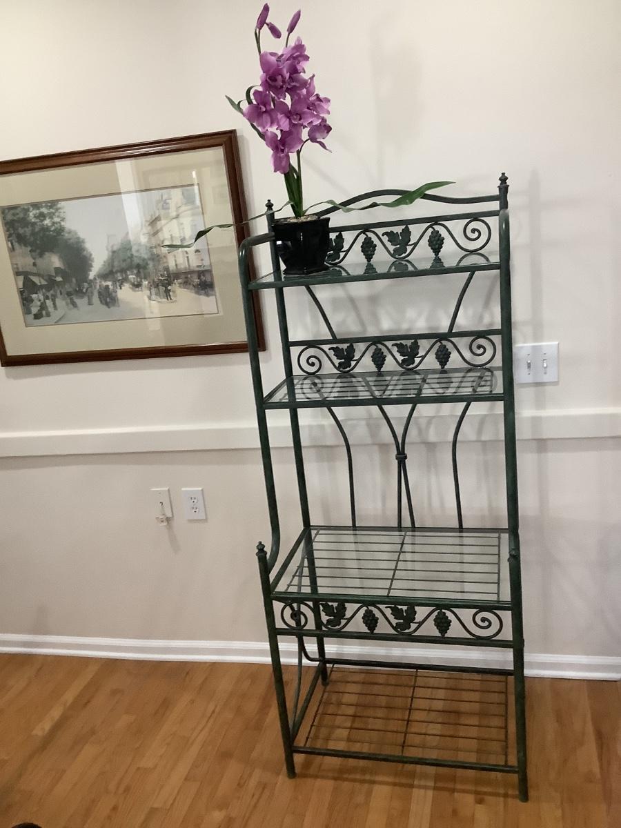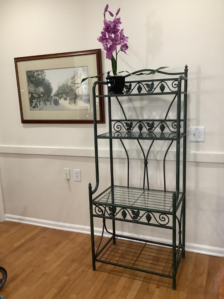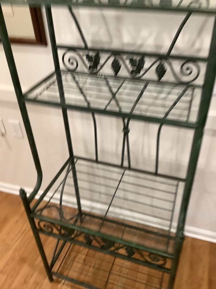 Metal & glass baker’s rack, 4 shelves, 3 with glass 65”H 27”W 18”depth