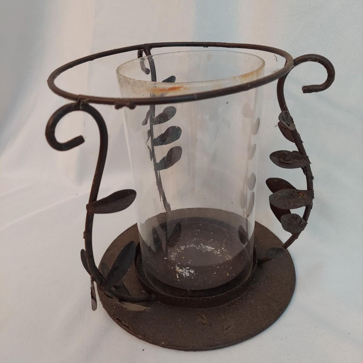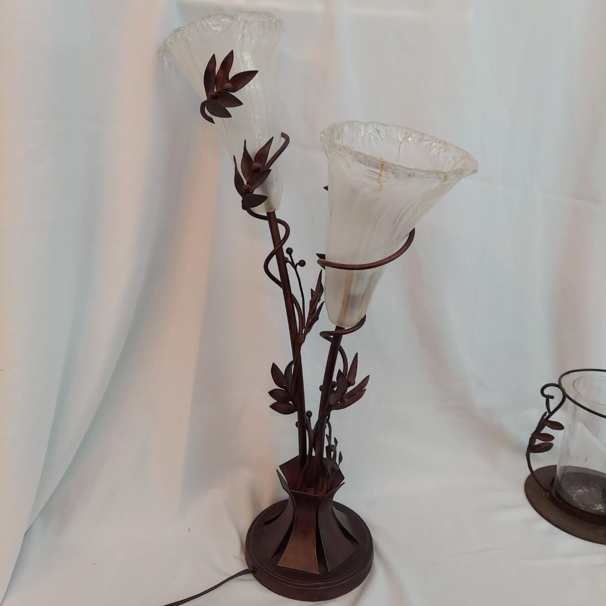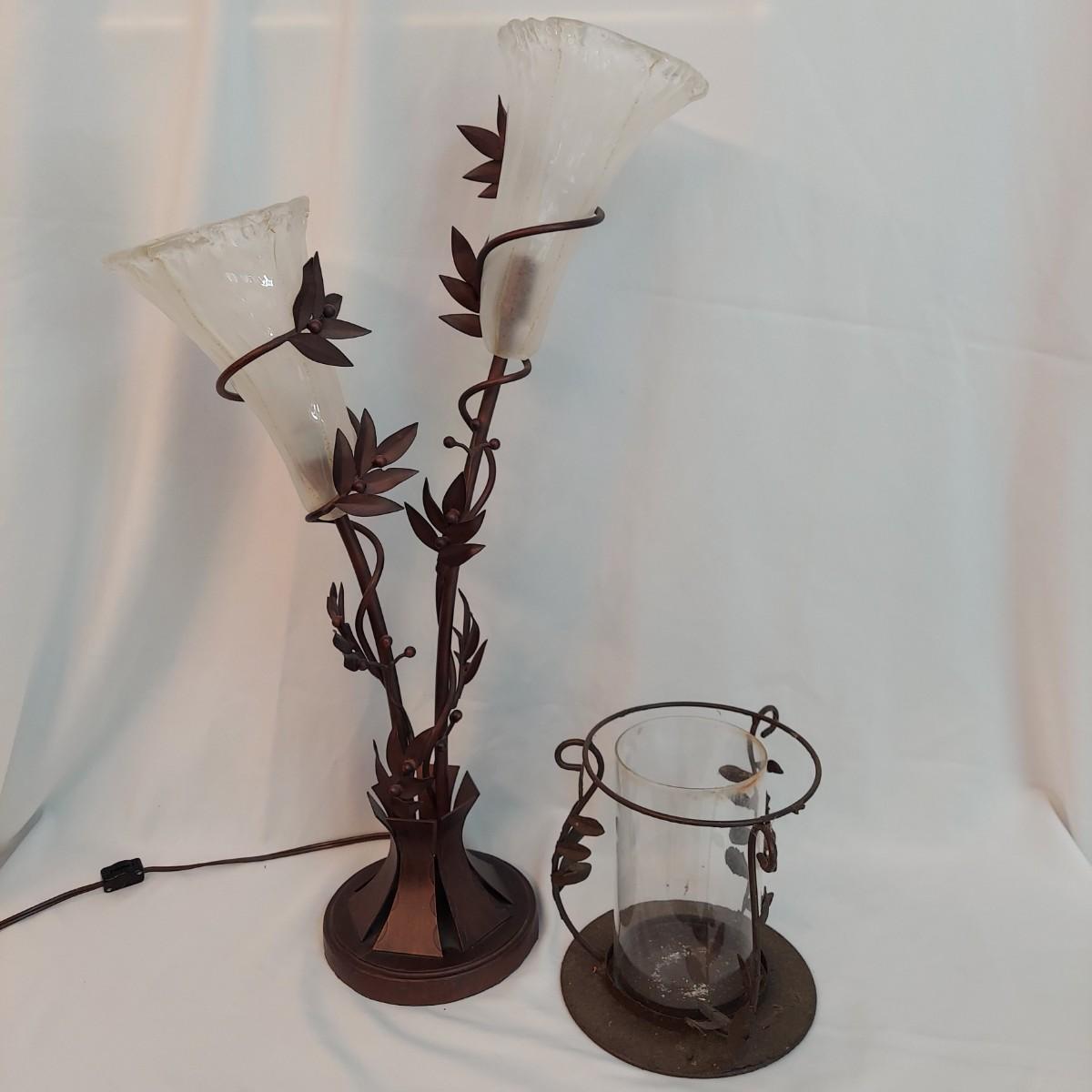 Several French Country style home decor pieces. They are all metal and glass. The basket appears to be wrought iron. The others are a unknown lightweight painted metal. The bronze colored metal and glass flower lamp is 29" tall. The large metal vine candle holder has 7" diameter and is 9" tall. The wrought iron leaf basket is 19" x 7" x 9"H. The skinny crackle glass votive candle holder is 12" tall. Local Pickup Only.