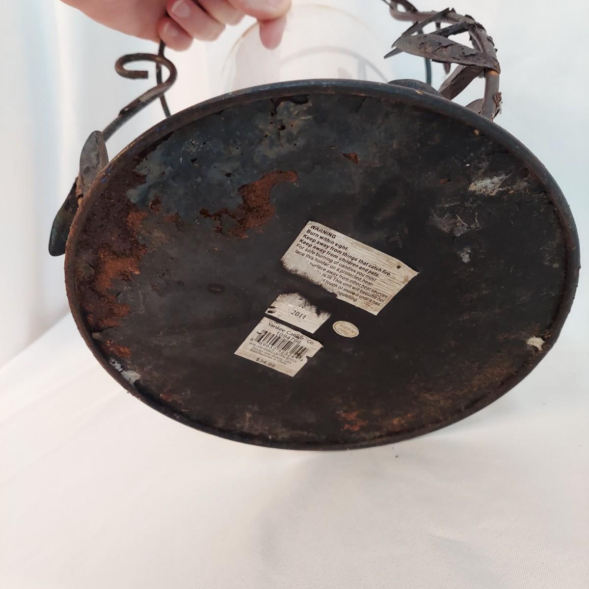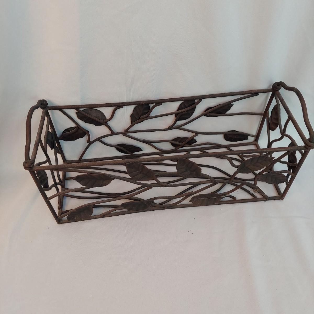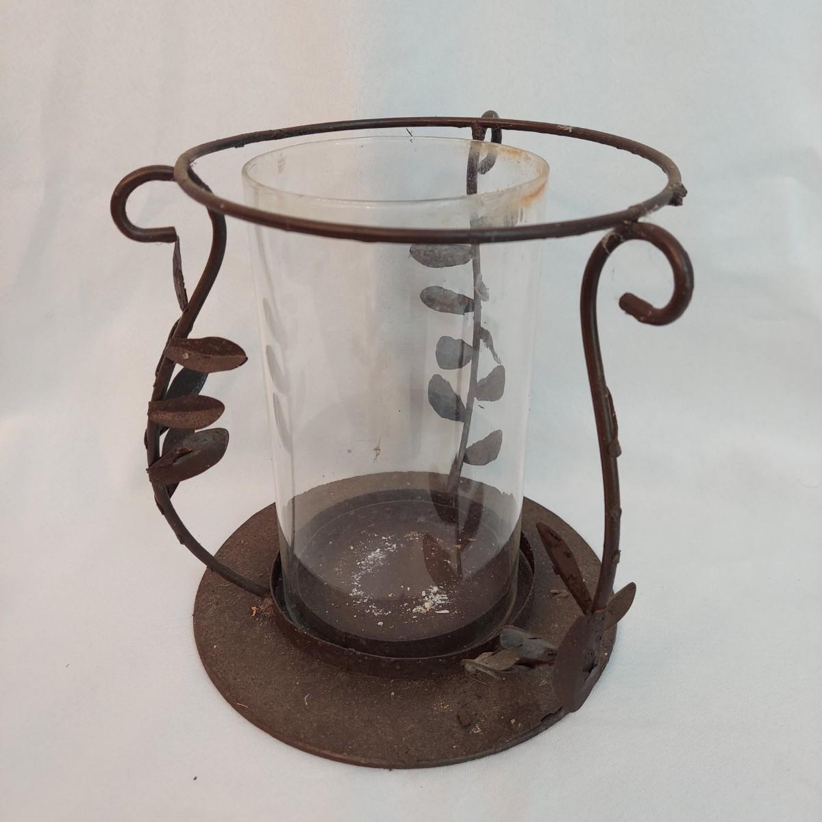 Several French Country style home decor pieces. They are all metal and glass. The basket appears to be wrought iron. The others are a unknown lightweight painted metal. The bronze colored metal and glass flower lamp is 29" tall. The large metal vine candle holder has 7" diameter and is 9" tall. The wrought iron leaf basket is 19" x 7" x 9"H. The skinny crackle glass votive candle holder is 12" tall. Local Pickup Only.