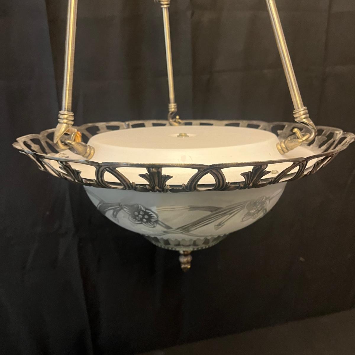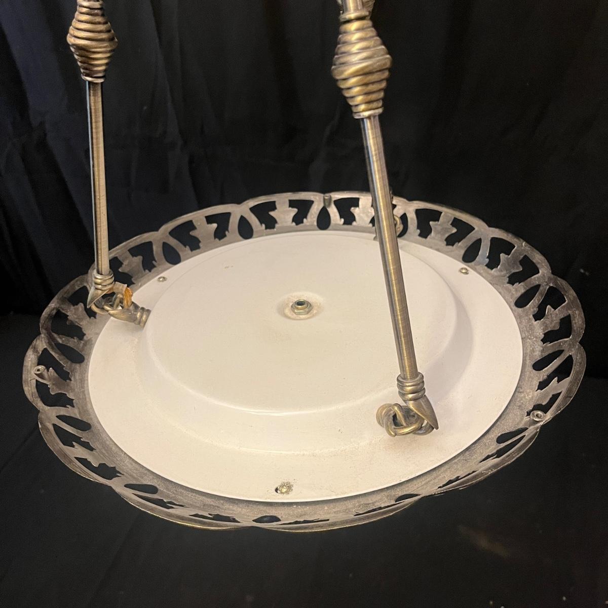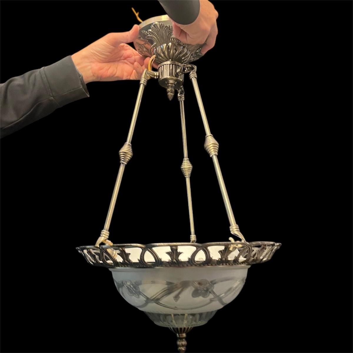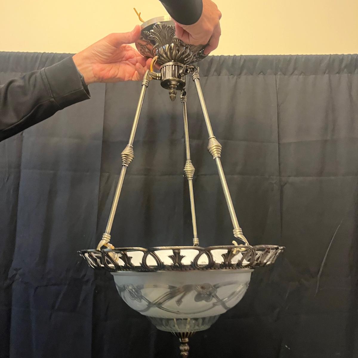 This hanging light is metal with a glass shade. Light measures 15”D x 29”Long. Light powered on when tested.
