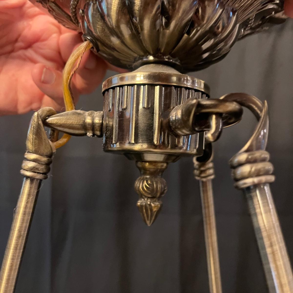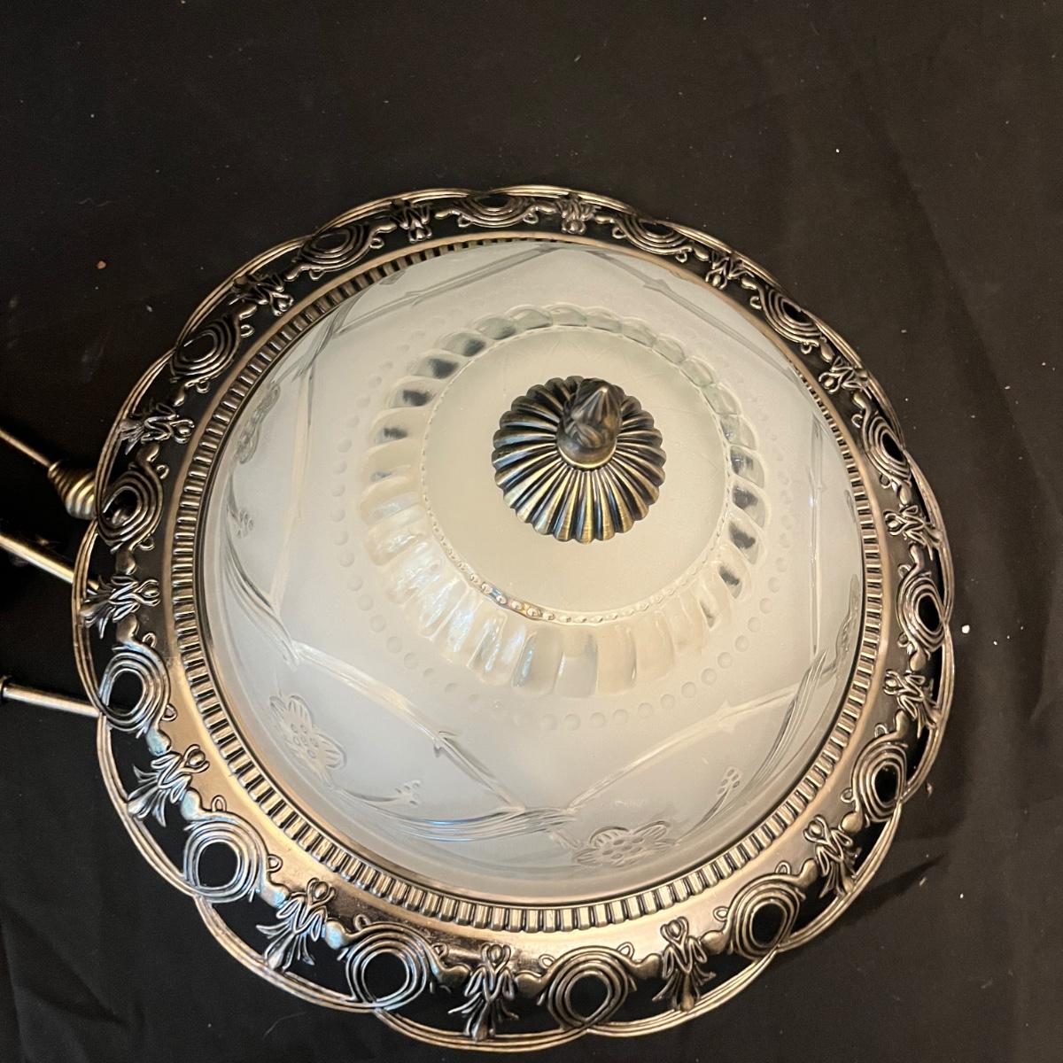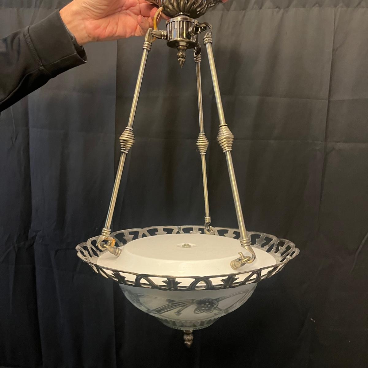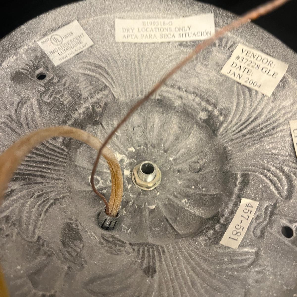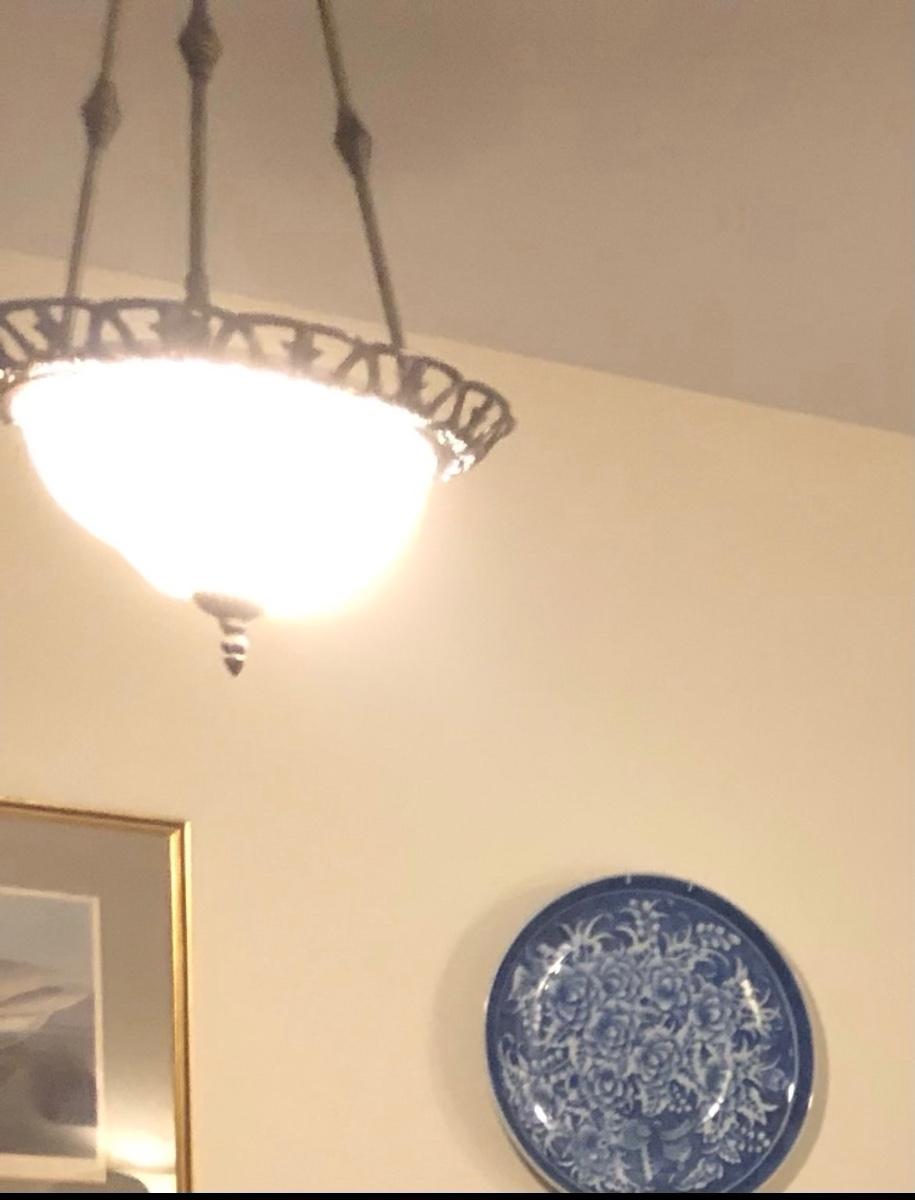 This hanging light is metal with a glass shade. Light measures 15”D x 29”Long. Light powered on when tested.