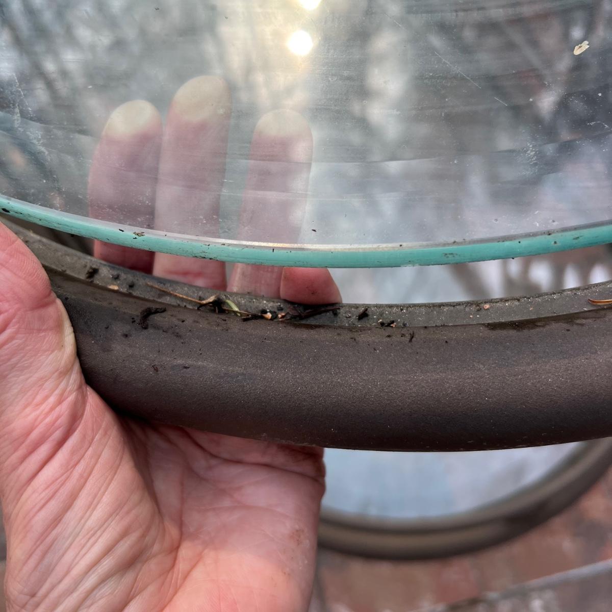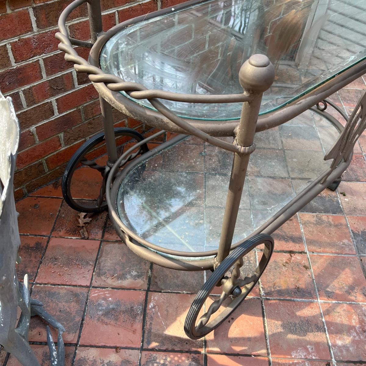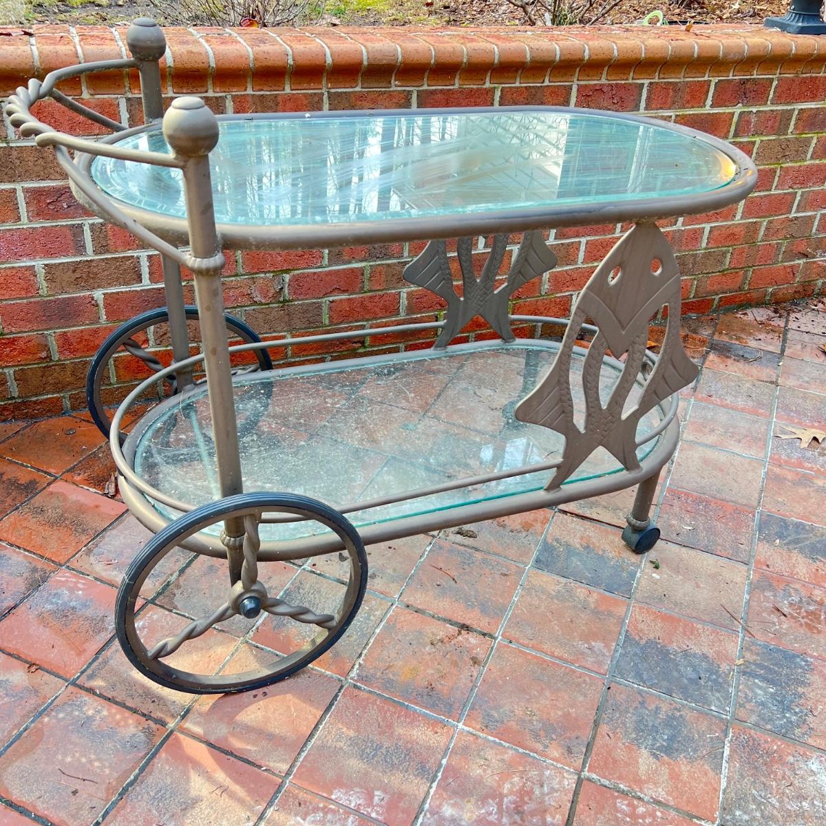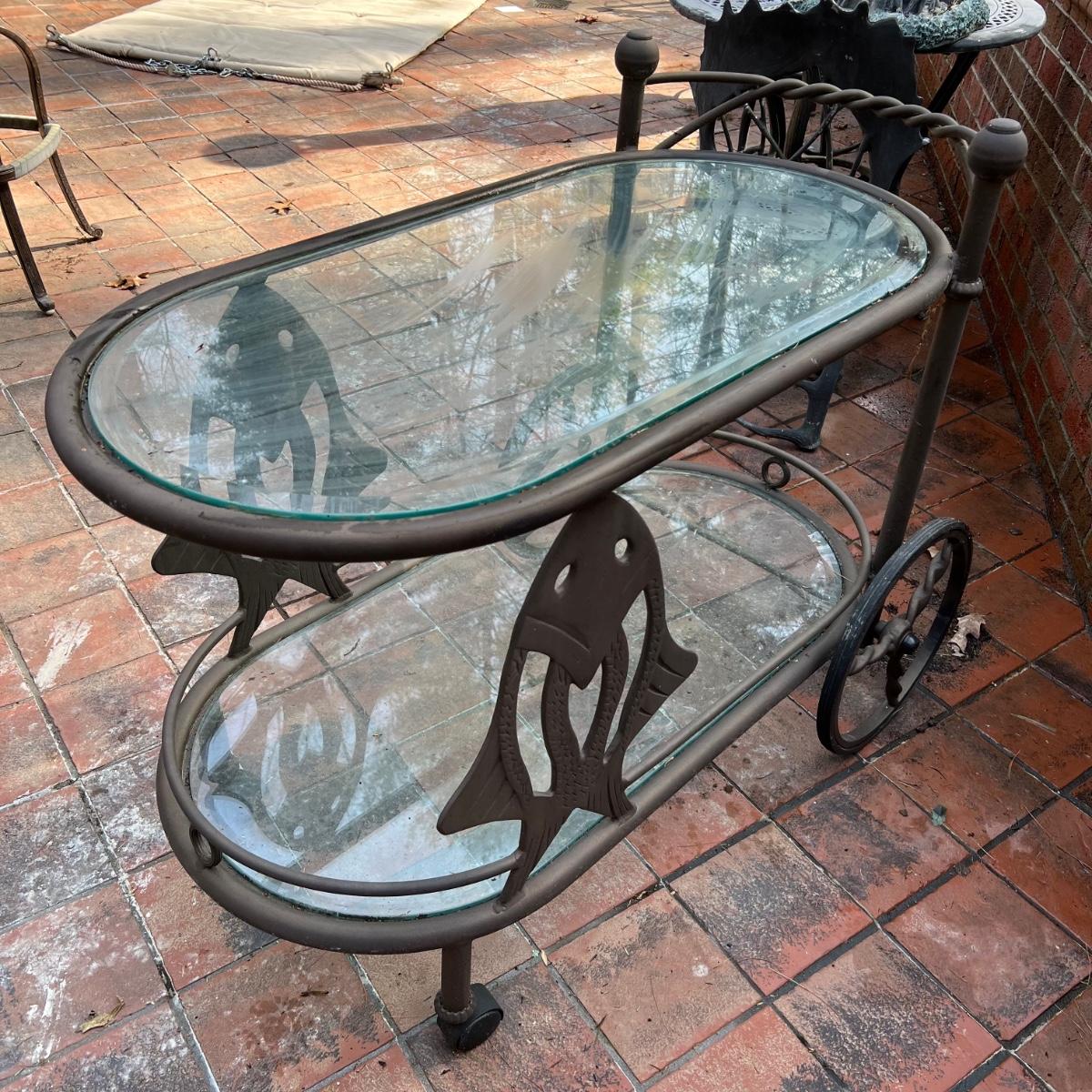 This metal cart with fish embellishmentshas a brown finish and two glass shelves. Note this cart has been on the patio so needs a good cleaning, but has no notable blemishes. It has two large wheels plus two plastic casters and moves/rolls easily.