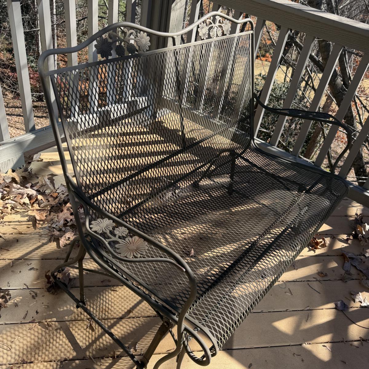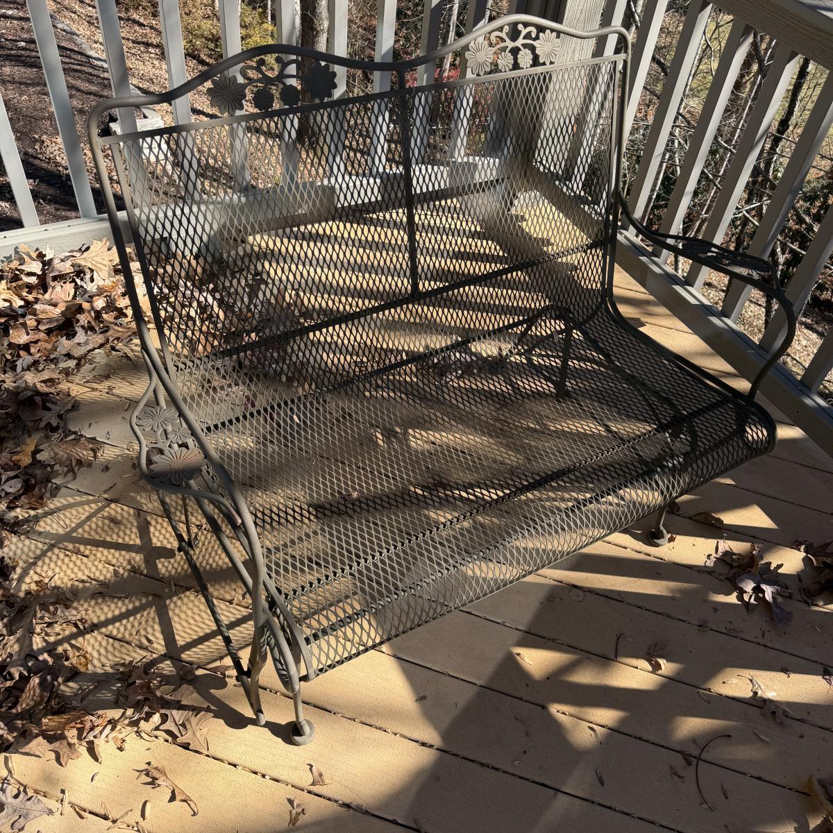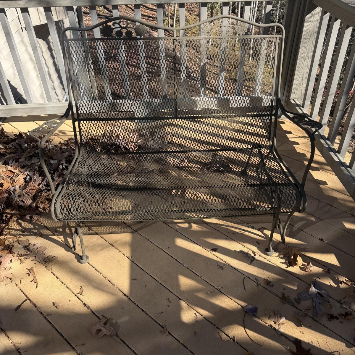 Lot includes a metal glider bench. Bench measures 45” x 25” x 35”H with 16.5” seat height.