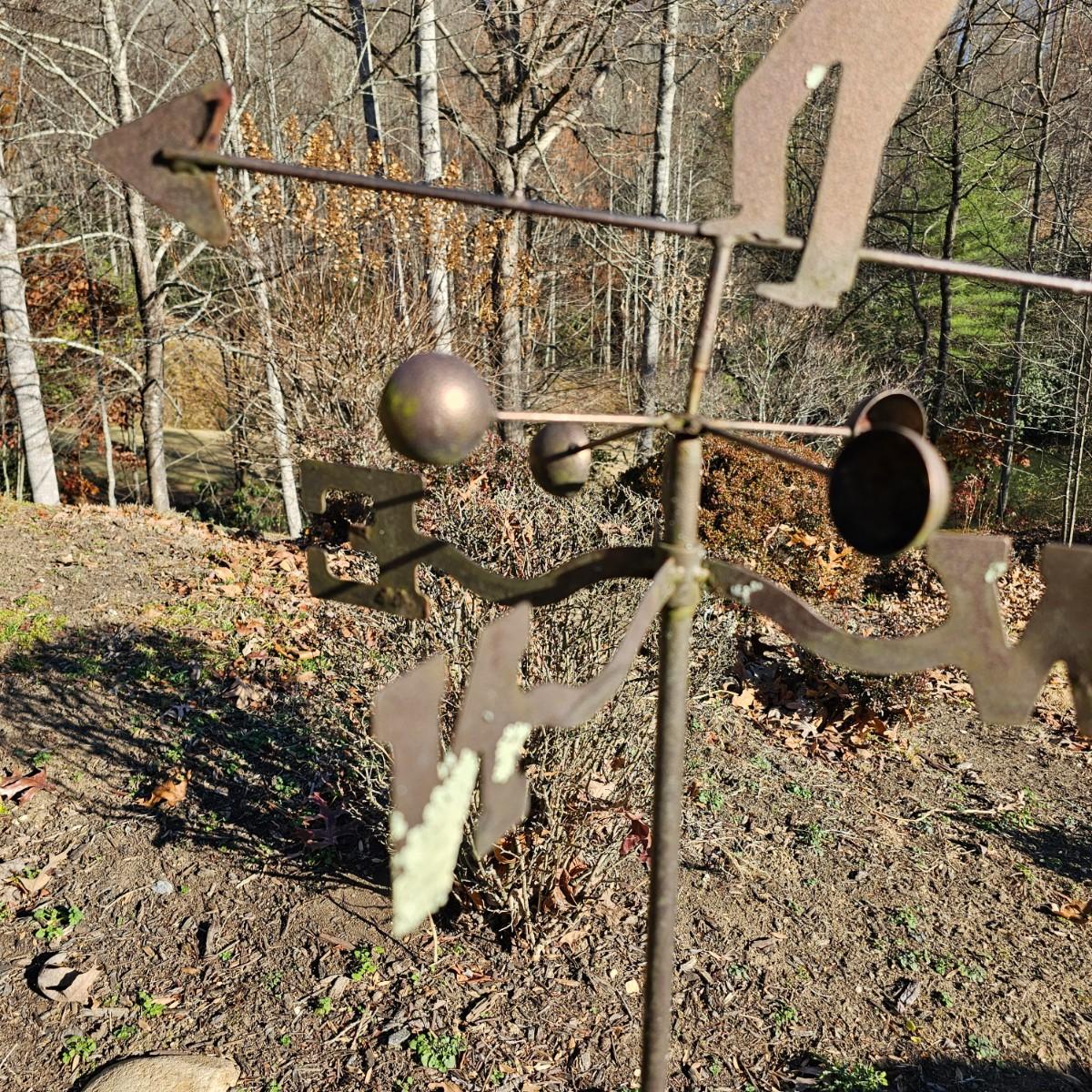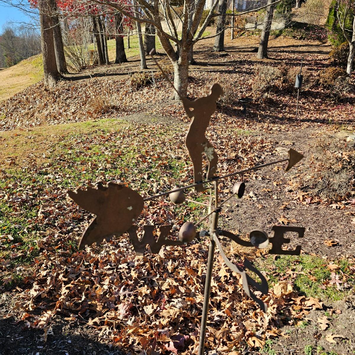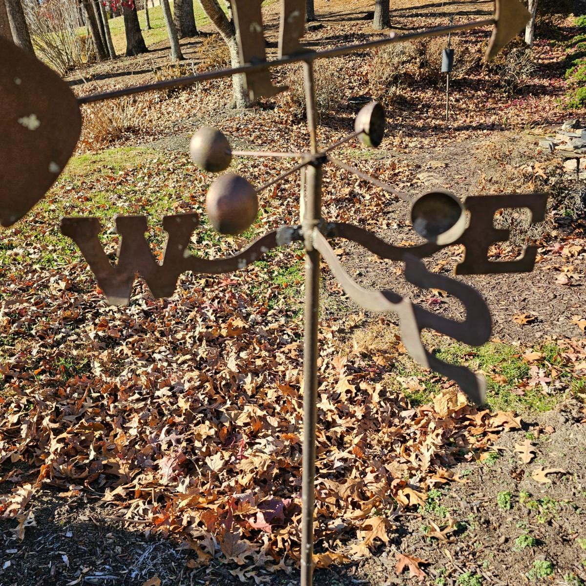 Metal weather vane with four directions arms, set of wind cups and a golfer teeing off on top bar. Cones with yard stake. Measures 15" x 10" x 58"H. Turns but needs some tlc, also has some rust and patina on surfaces. See photos for details. Local pickup only.