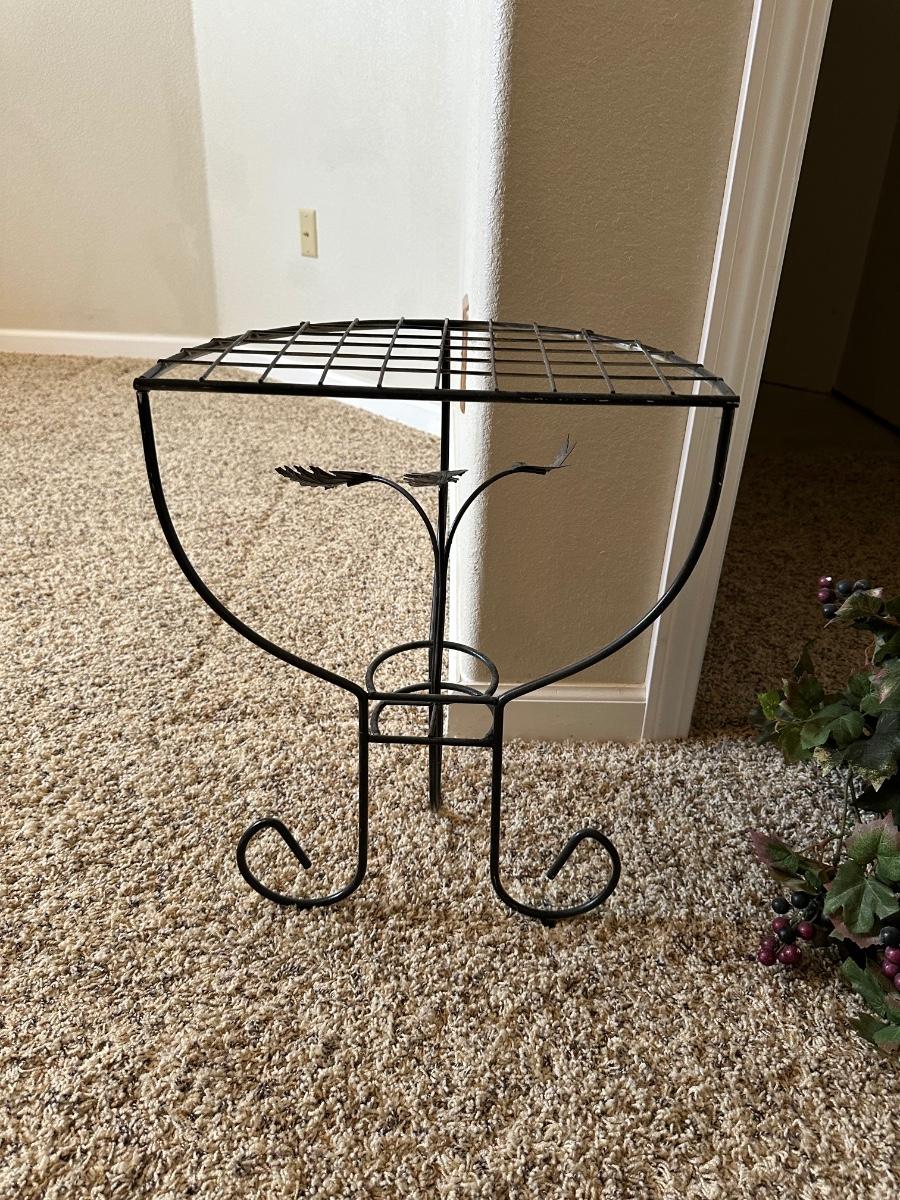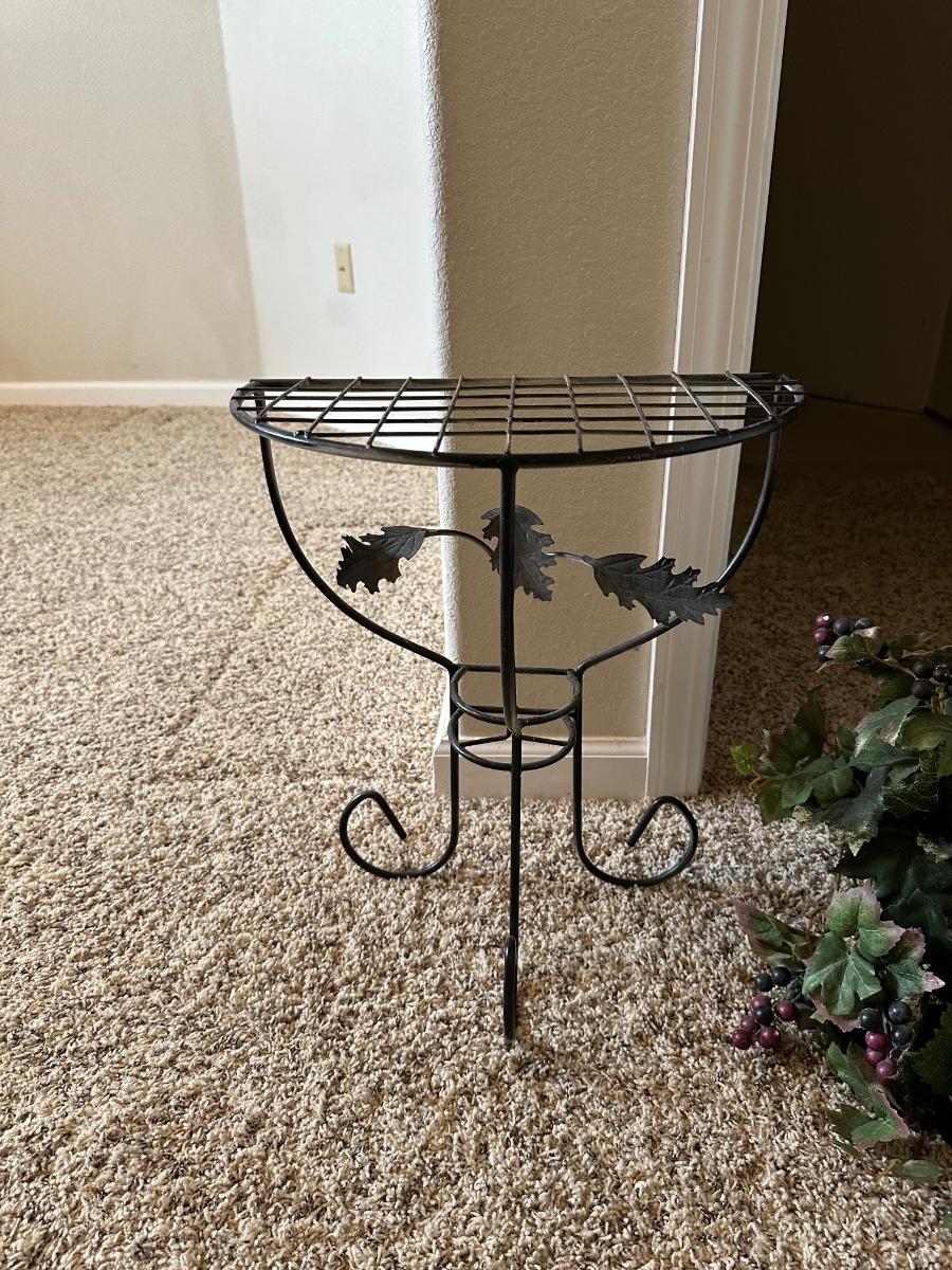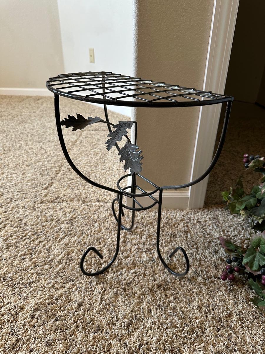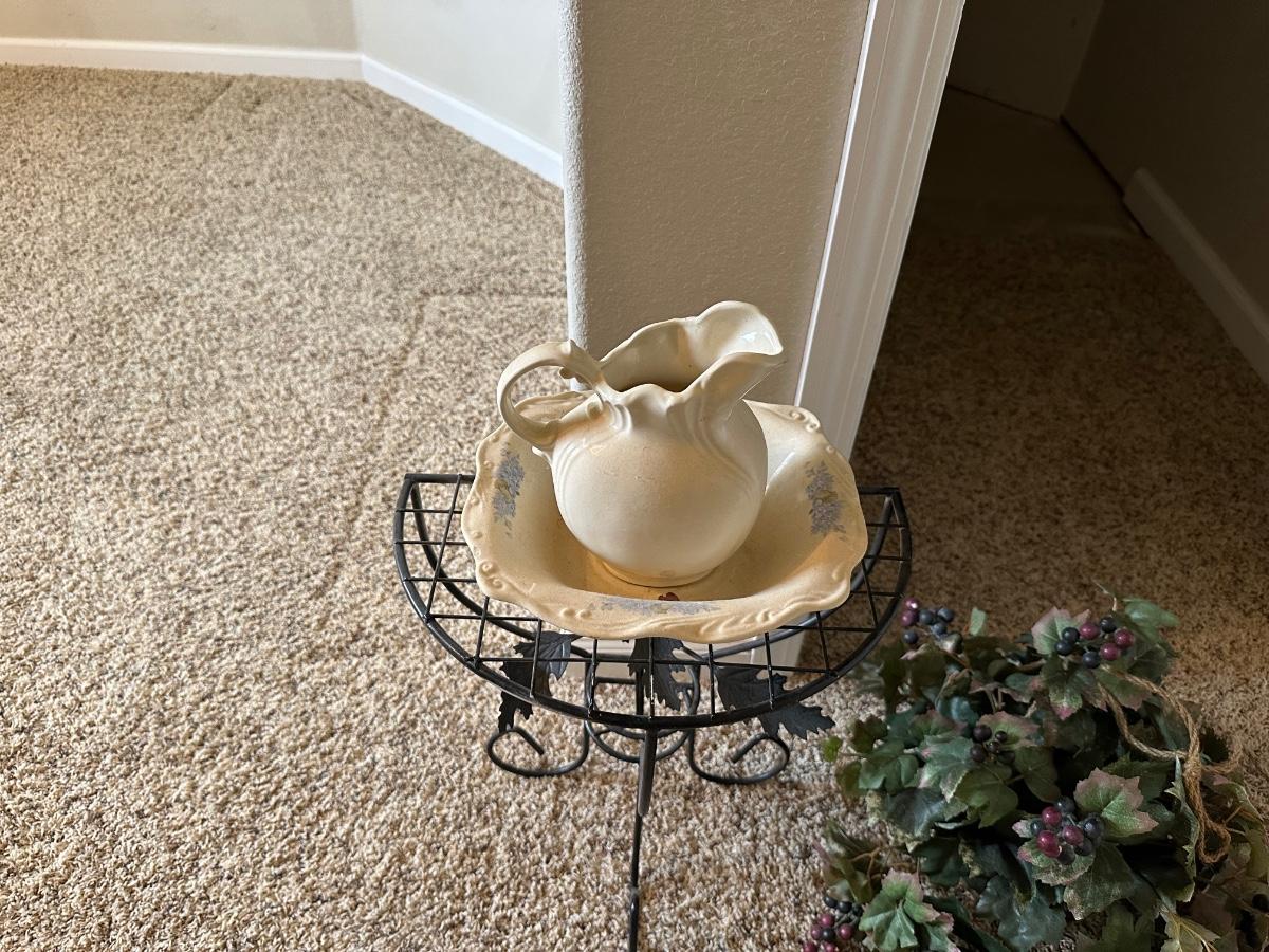 METAL HALF CIRCLE TABLE, WASH BOWL & PITCHER PLUS A FAUX PLANT