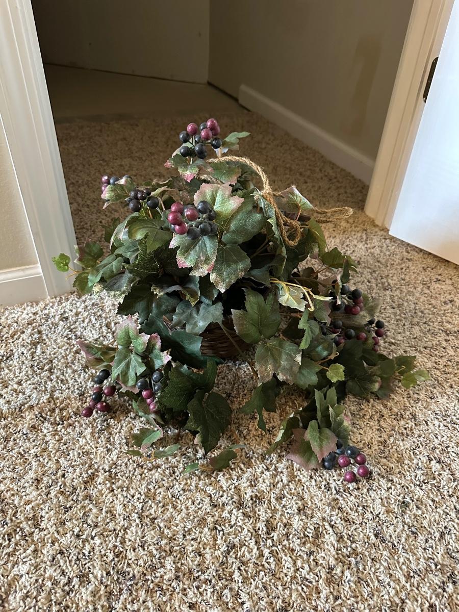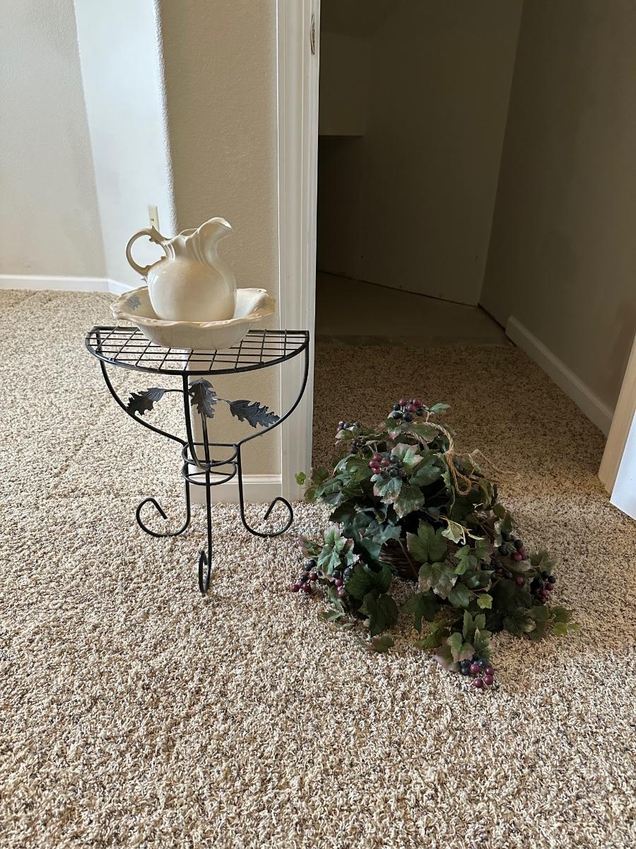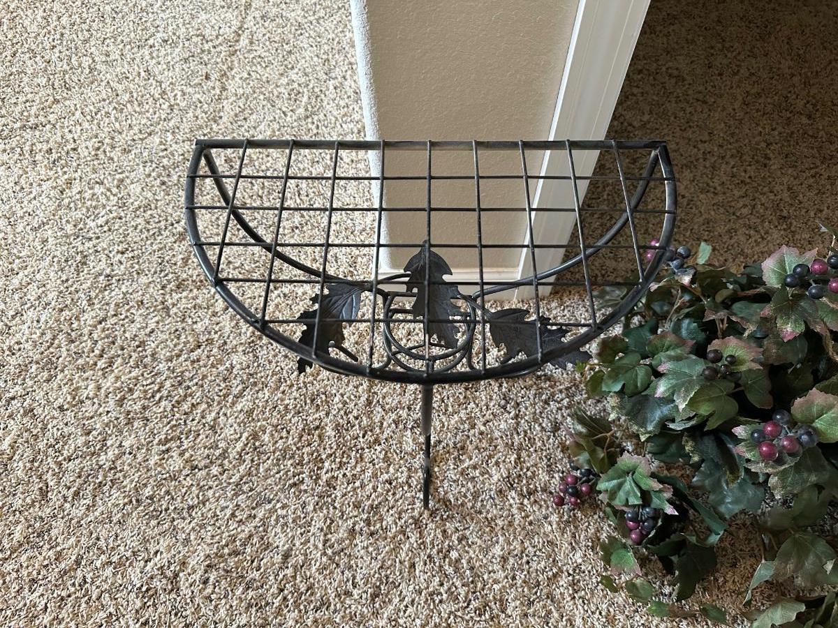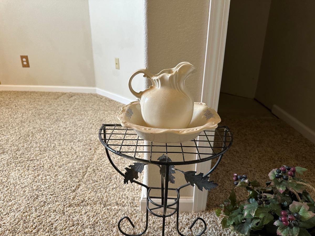METAL HALF CIRCLE TABLE, WASH BOWL & PITCHER PLUS A FAUX PLANT