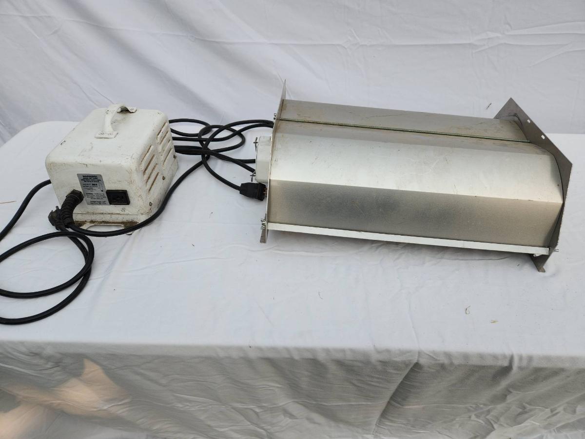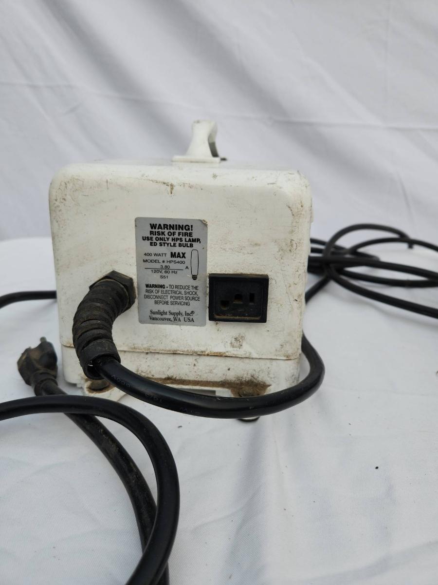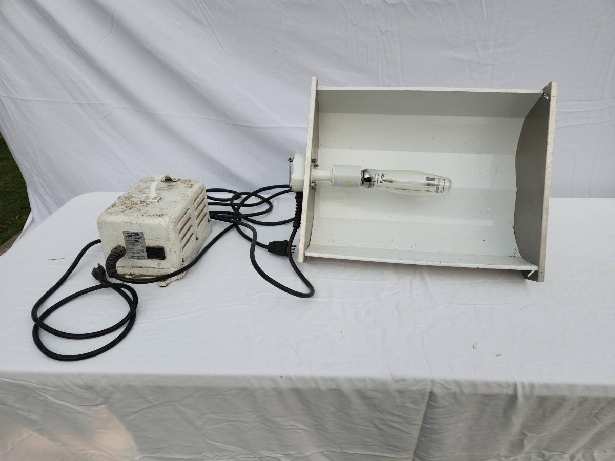 Metal halide light fixture featuring a metal reflector housing, an integrated ballast unit, and a clear bulb installed. The ballast casing is white with visible signs of wear, and labeled with operational specifications. The unit includes wired connections to power the bulb and is designed for high-intensity lighting applications.