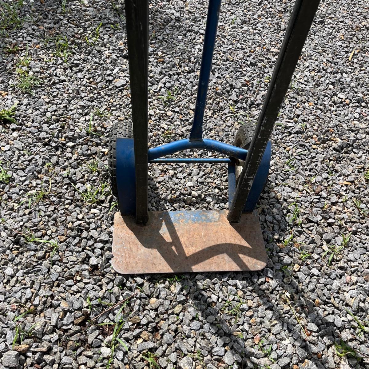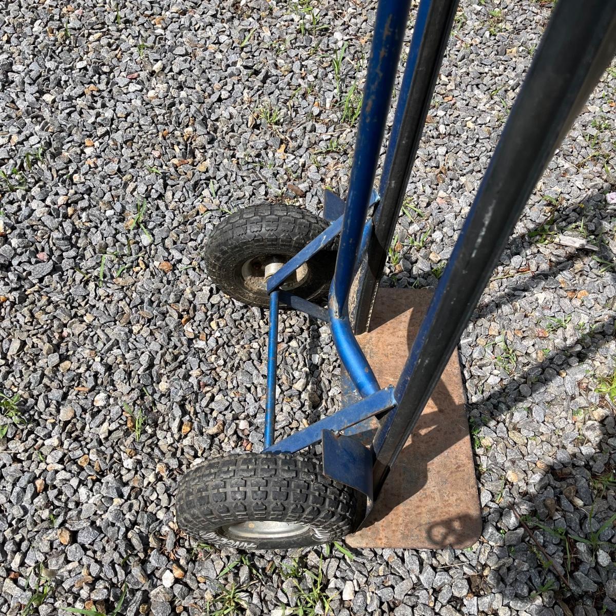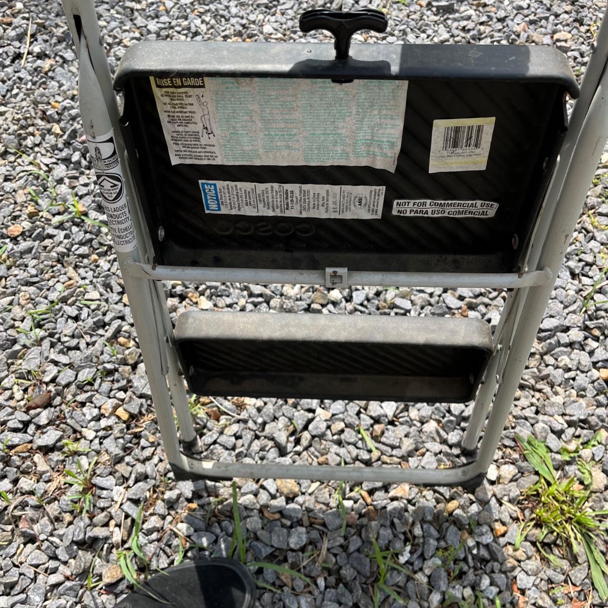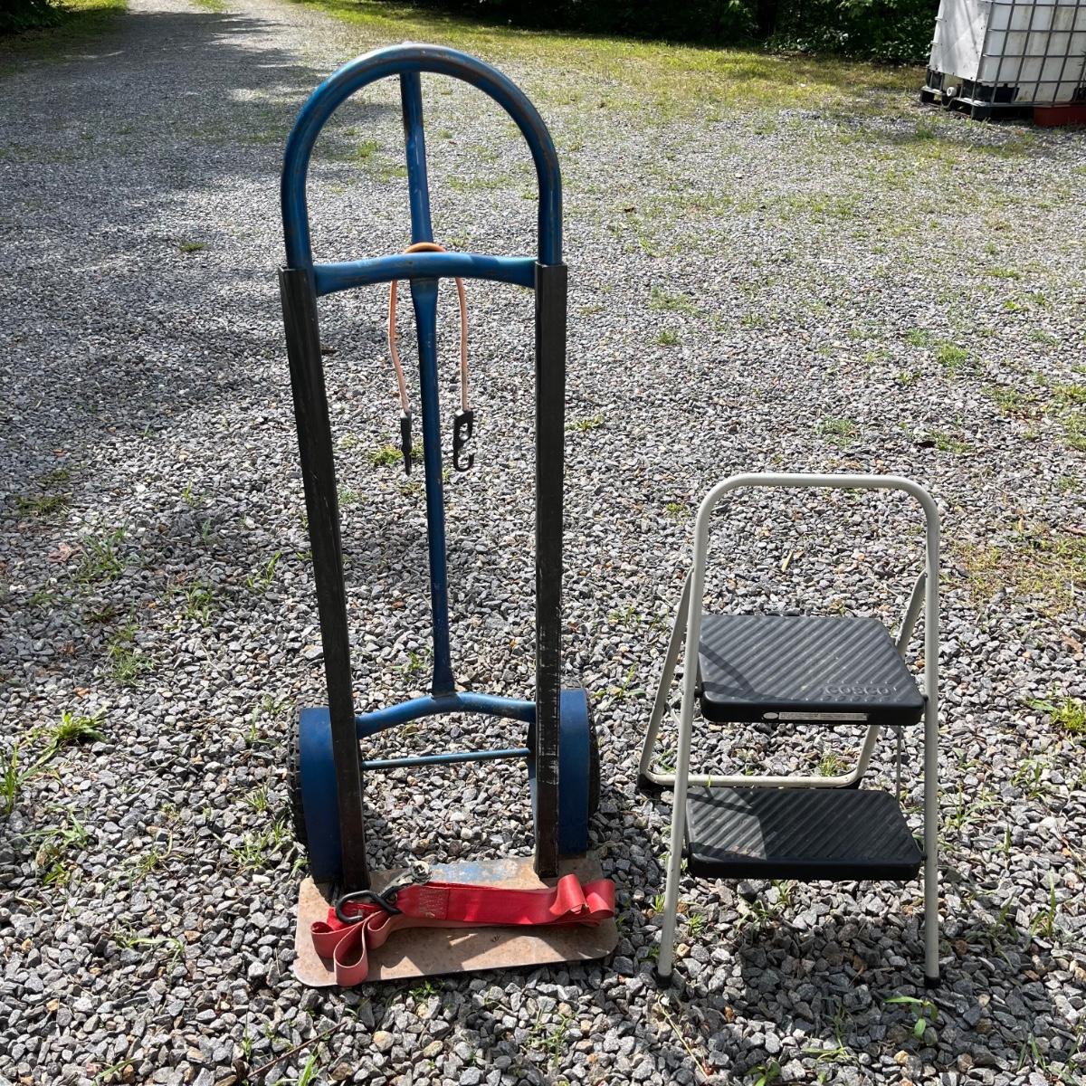 Lot includes a metal hand truck with pneumatic tires, Cosco step stool and a ratchet strap. Hand truck measures 19” x 20” x 50”.