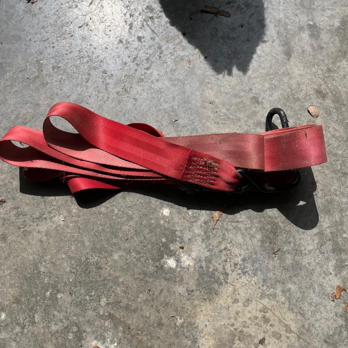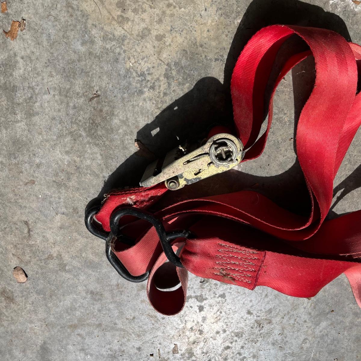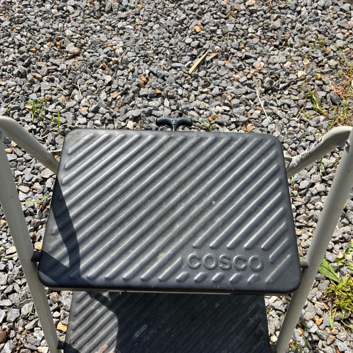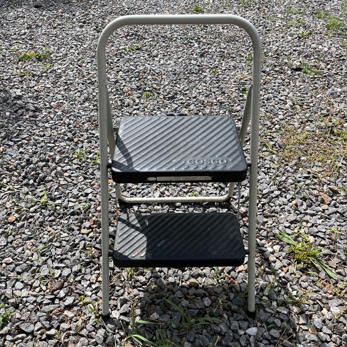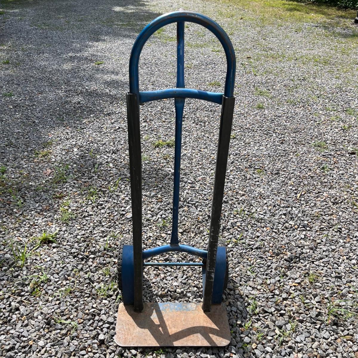 Lot includes a metal hand truck with pneumatic tires, Cosco step stool and a ratchet strap. Hand truck measures 19” x 20” x 50”.