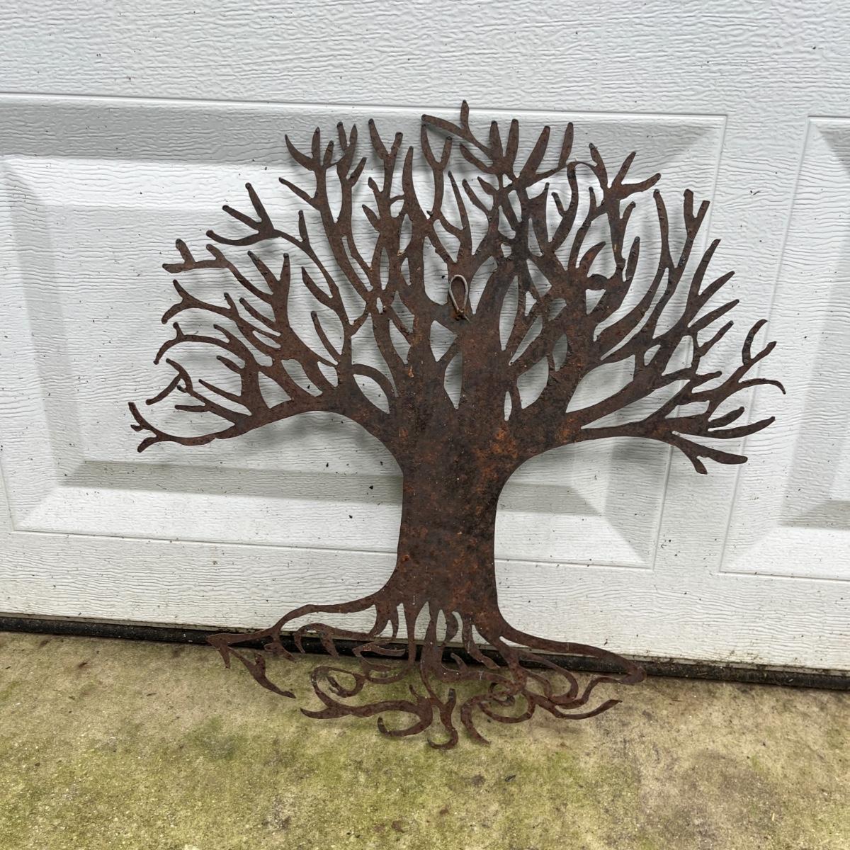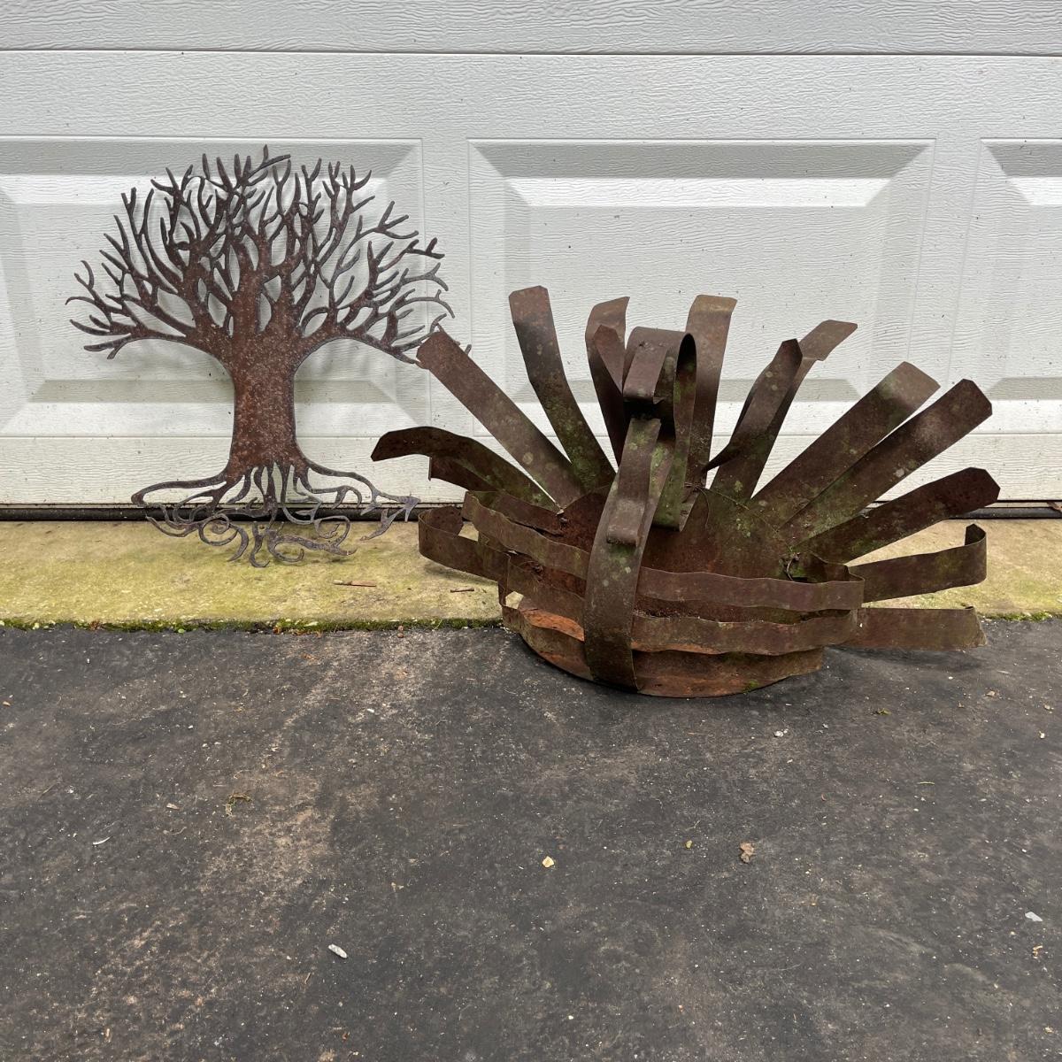 Lot includes a metal hanging turkey planter and a metal Tree of Life art with wall mount.