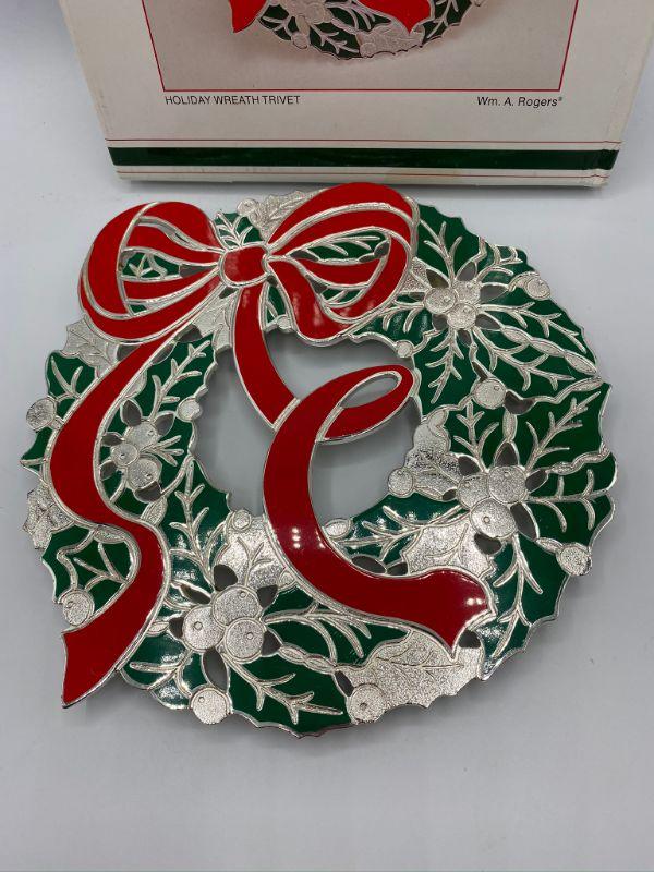 Metal Holiday wreath trivet. Silver with red and green enamel. Good previously used condition.