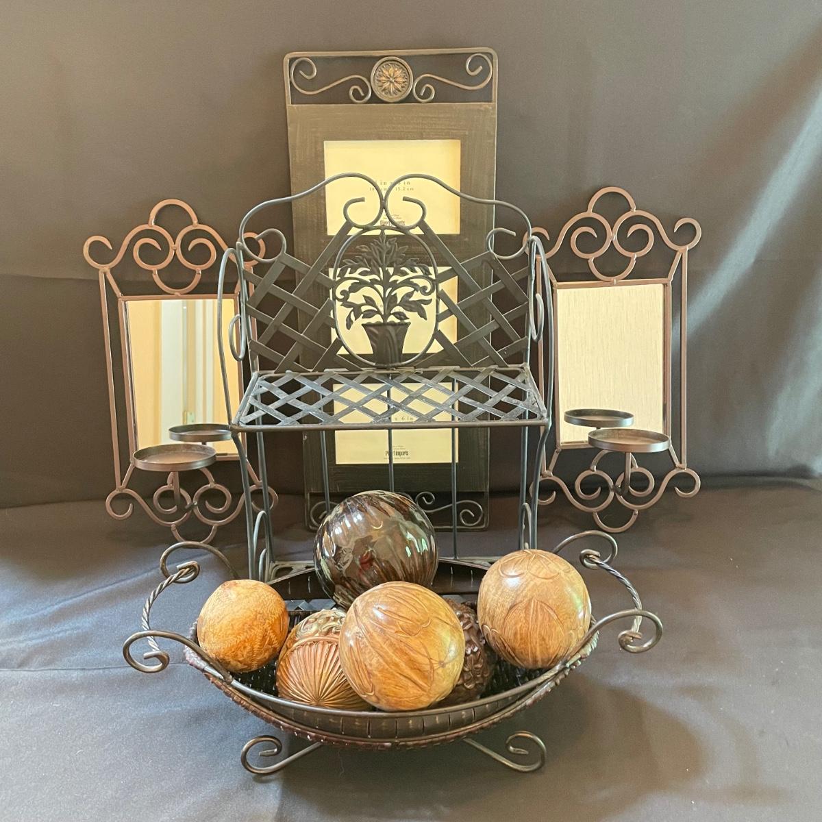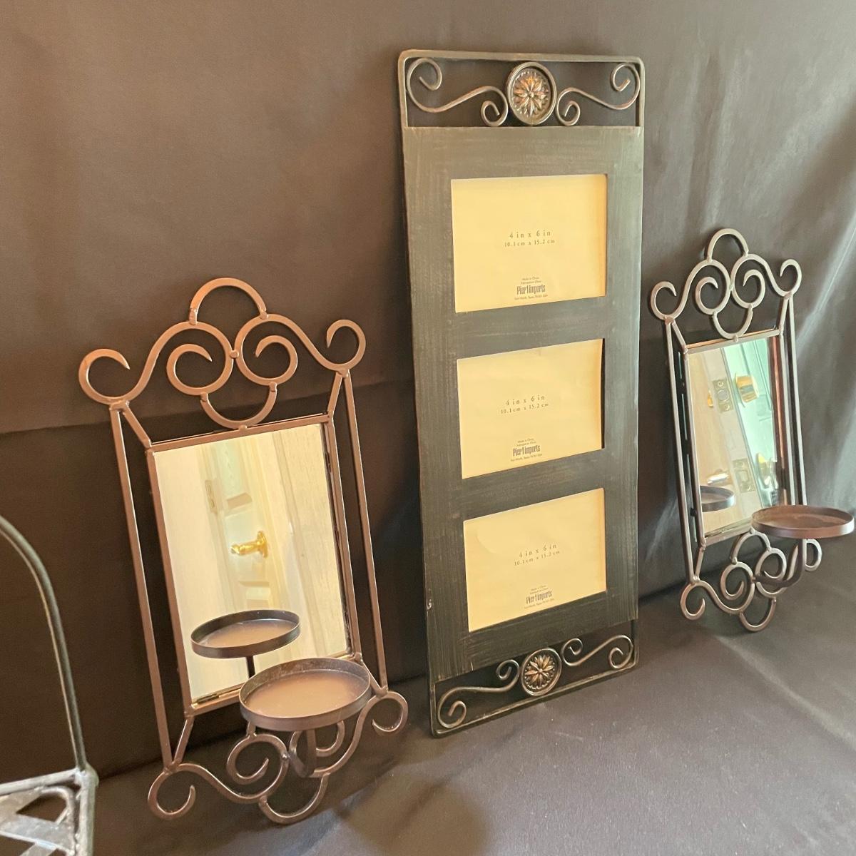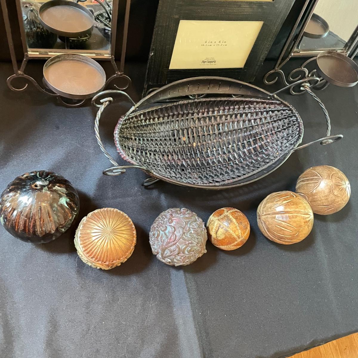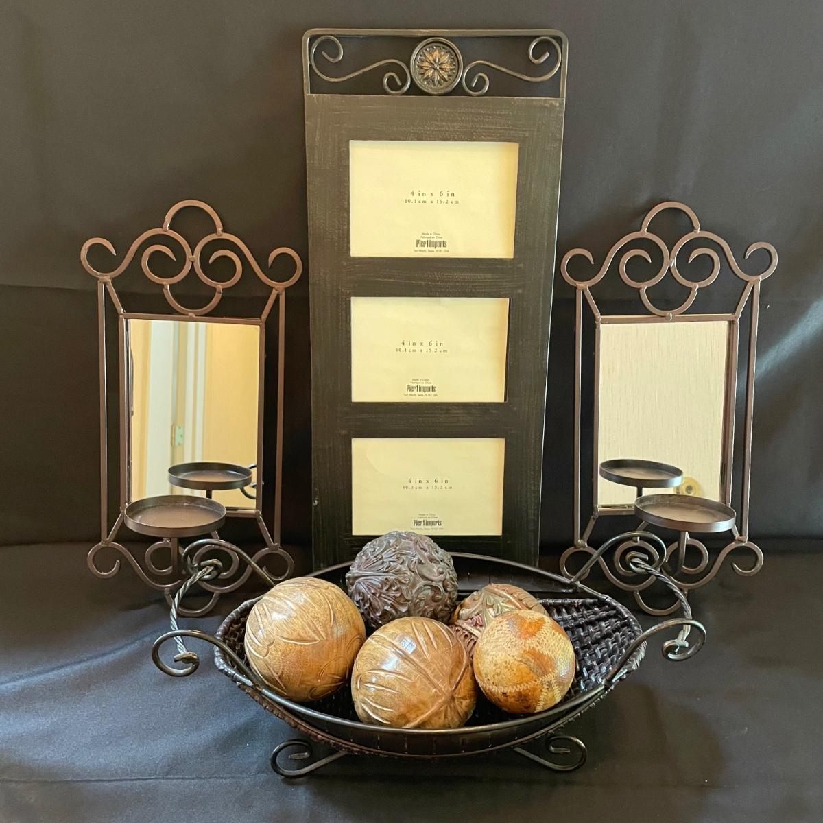 A matching pair of mirrored candle holding wall sconces, a three photo Pier1 wall frame, a tiered shelf and black basket w/ decorative balls. The frame measures 9” x 22”H, it doesn’t have glass panels for each photo. Replacement panels would be roughly 4” x 6”. The decorative balls are a variety of materials- likely akin to coconuts, ceramic and resin. See images. Shipping available.