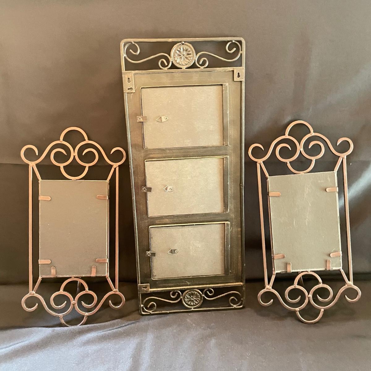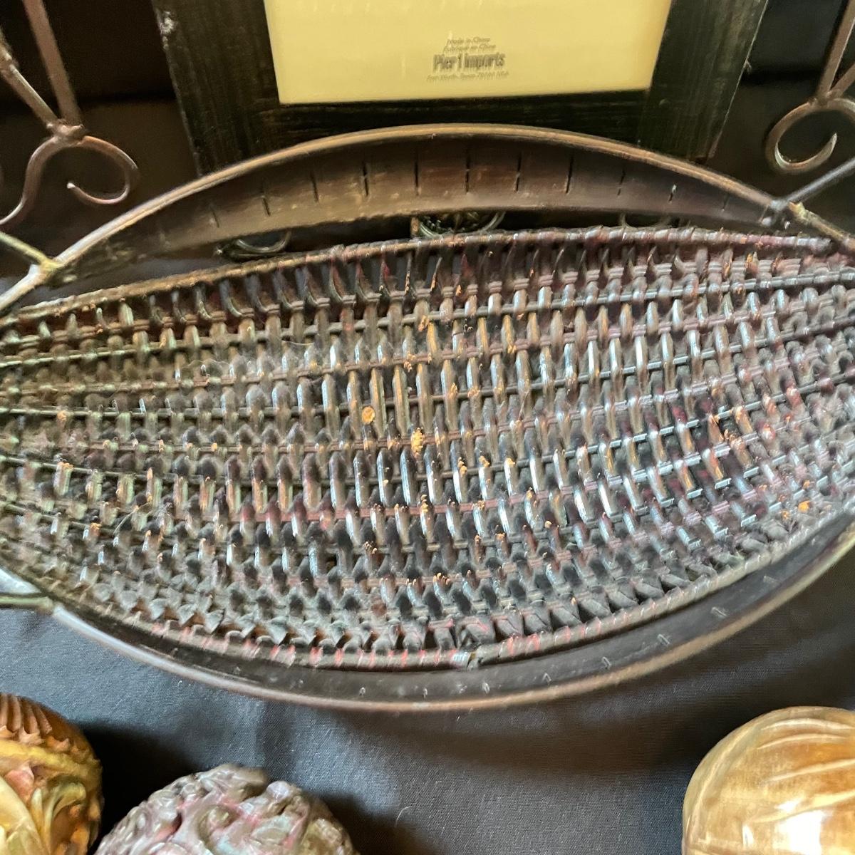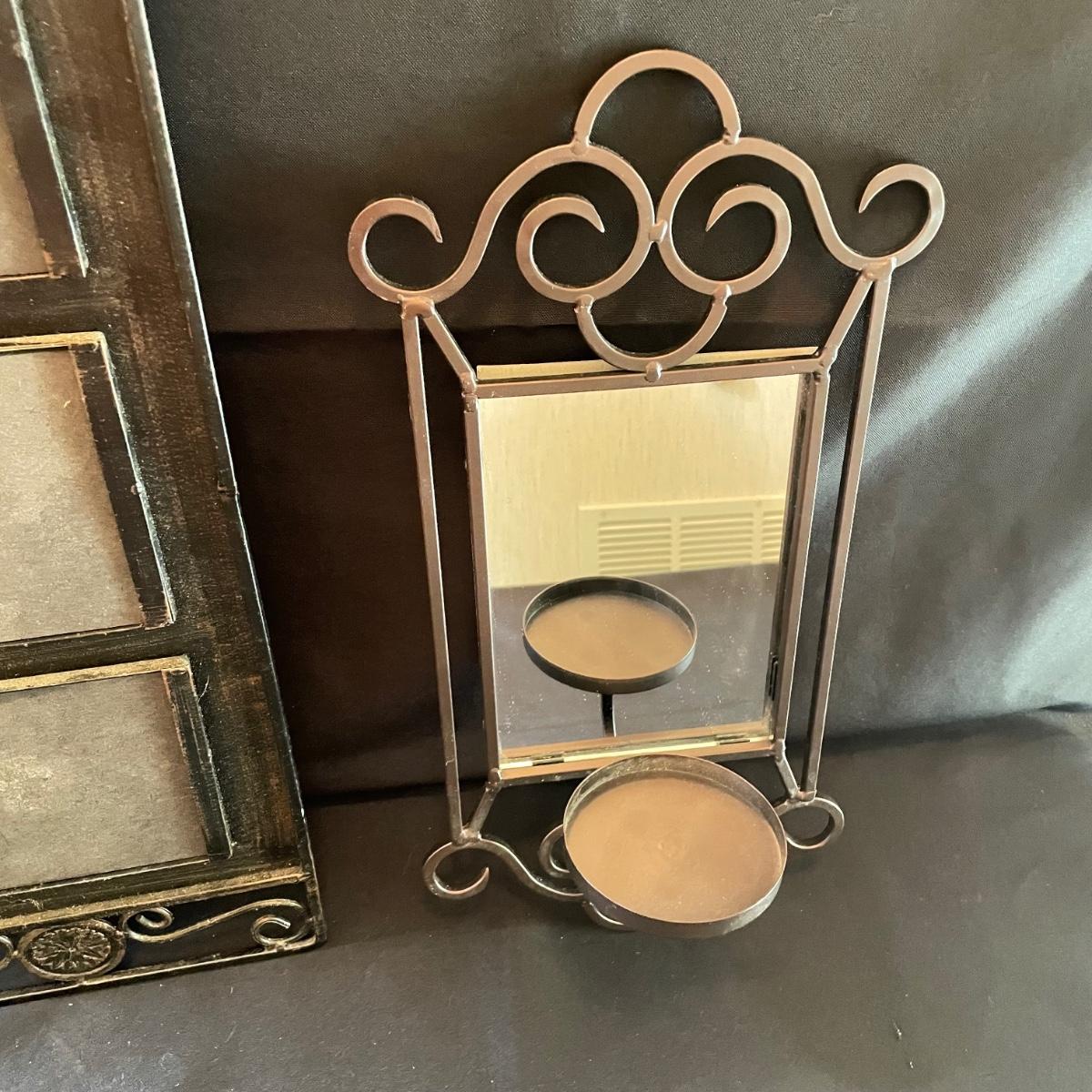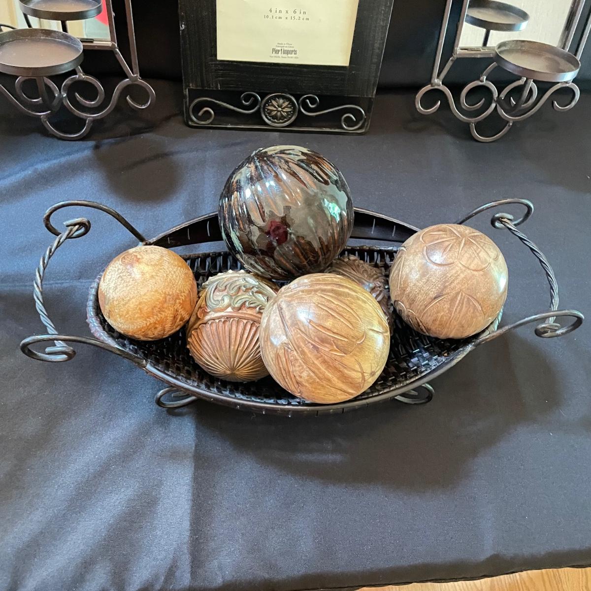 A matching pair of mirrored candle holding wall sconces, a three photo Pier1 wall frame, a tiered shelf and black basket w/ decorative balls. The frame measures 9” x 22”H, it doesn’t have glass panels for each photo. Replacement panels would be roughly 4” x 6”. The decorative balls are a variety of materials- likely akin to coconuts, ceramic and resin. See images. Shipping available.