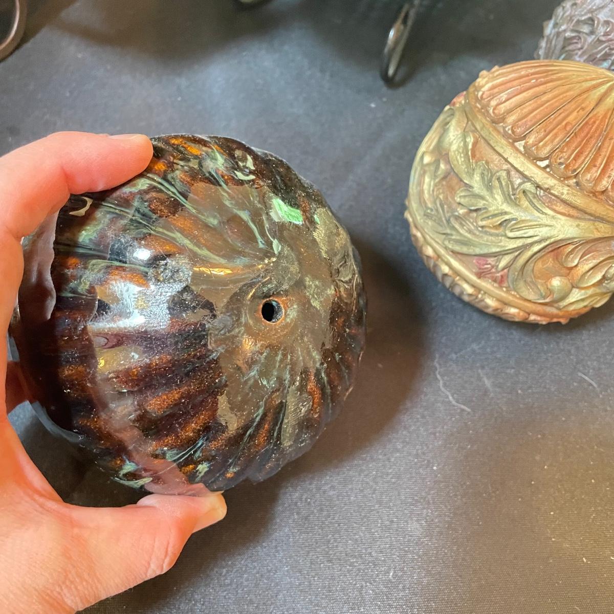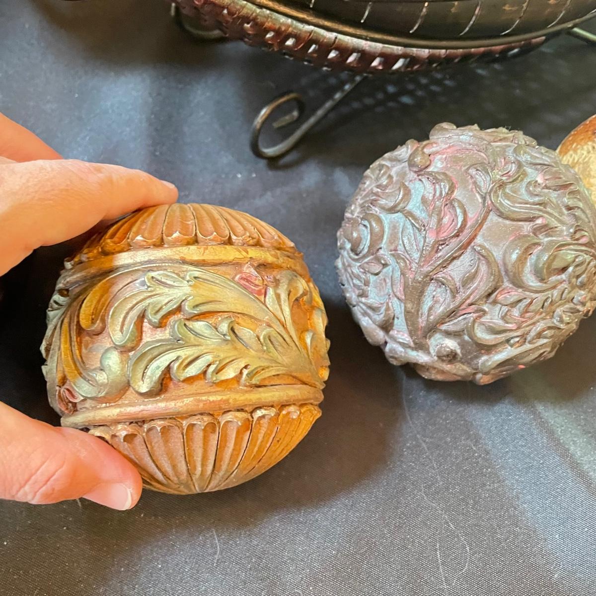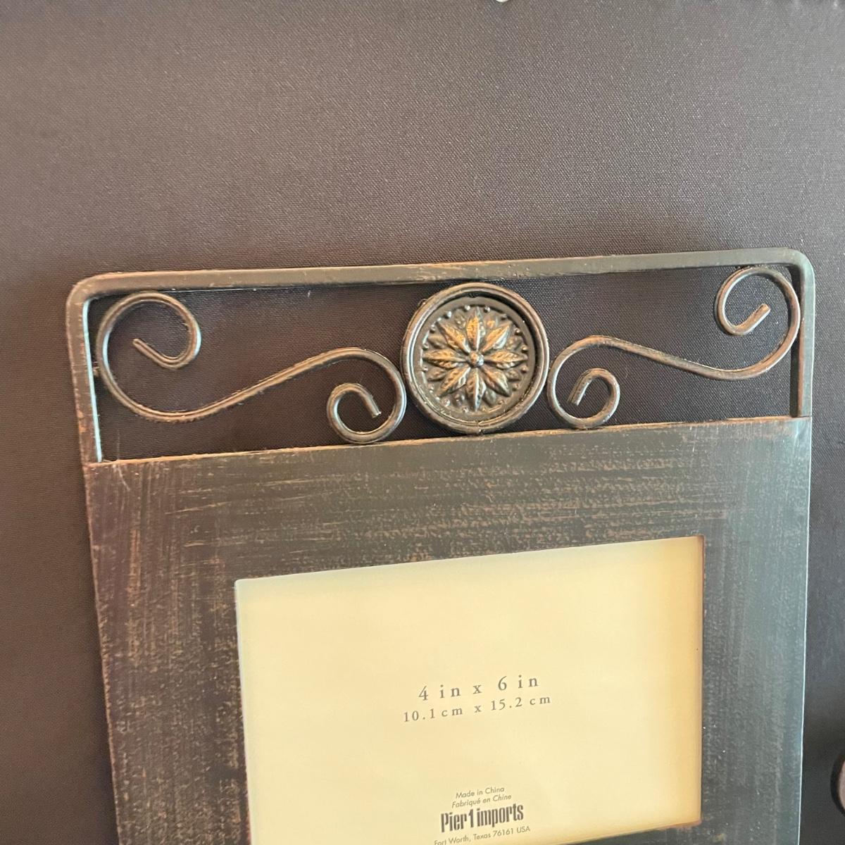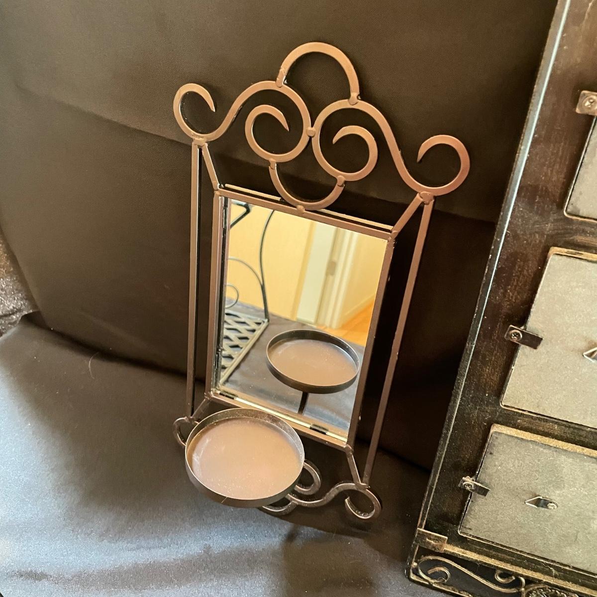 A matching pair of mirrored candle holding wall sconces, a three photo Pier1 wall frame, a tiered shelf and black basket w/ decorative balls. The frame measures 9” x 22”H, it doesn’t have glass panels for each photo. Replacement panels would be roughly 4” x 6”. The decorative balls are a variety of materials- likely akin to coconuts, ceramic and resin. See images. Shipping available.
