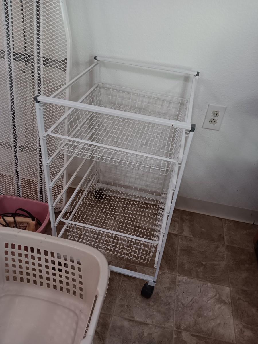 Metal Ironing board with metal baskets on stand and a clothing Iron