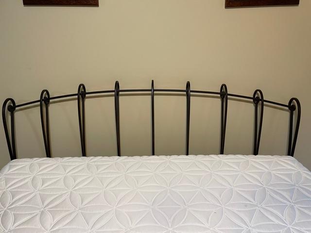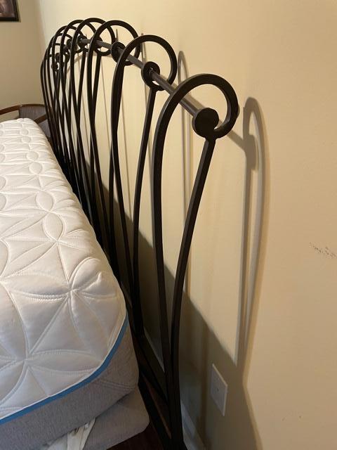 Metal King Bed Headboard. Sleigh bed style w/metal curls 76" W x 50" H (at center). Comes with metal bedframe