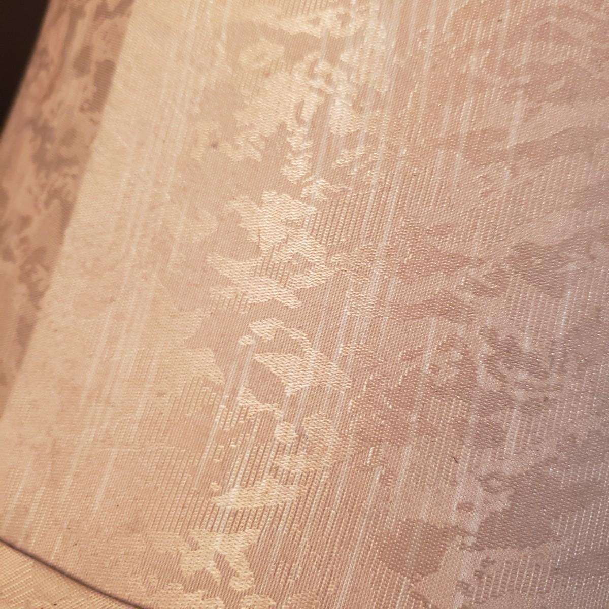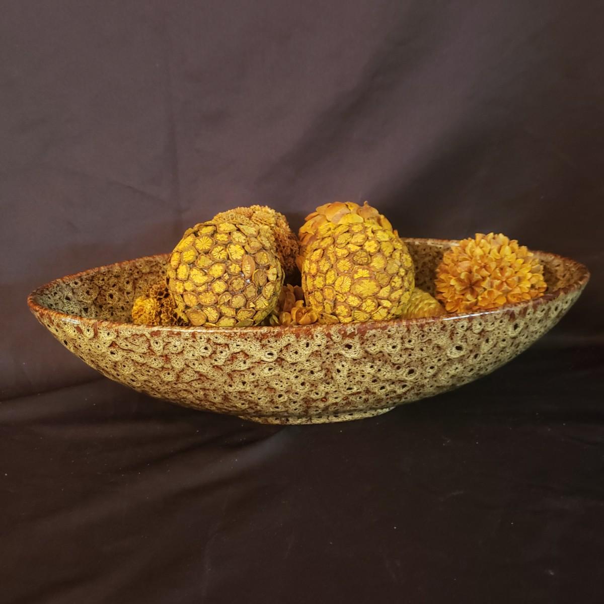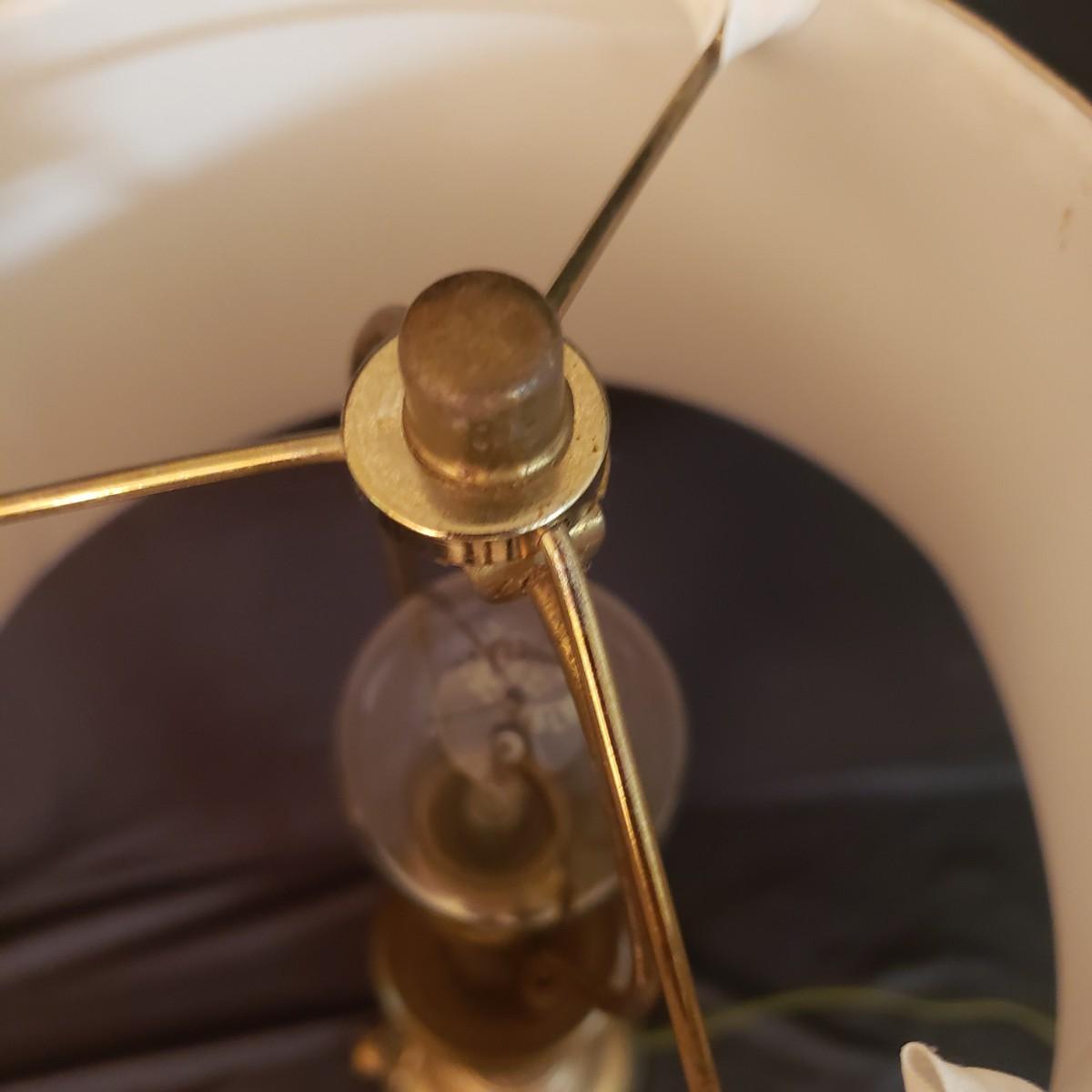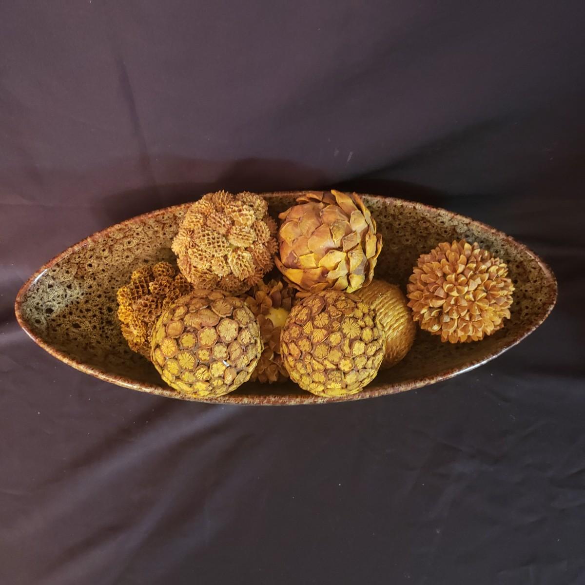 The lamp is a 3-way metal lamp with a copper like tone to it. The base of the lamp is 7" and the entire lamp with the shade is 30"H. The shade is made out a thick satin like material, see picture. The decorative ceramic oblong bowl measures 16"x7"x4"H. The bowl is displayed with natural materials in ball shaped. Two of the balls have missing pieces, but can easily be turned in the bowl so you don't see it.