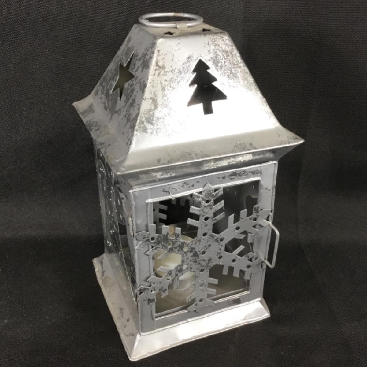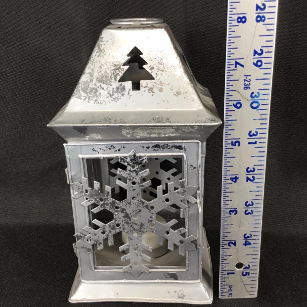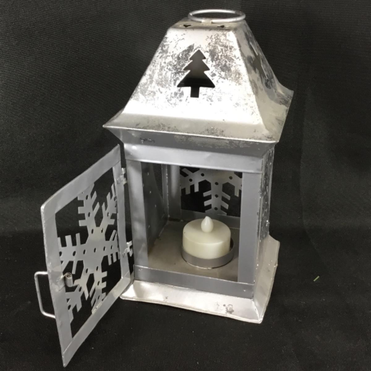 One metal lantern candle holder. Includes one battery powered candle which is untested; see pictures.