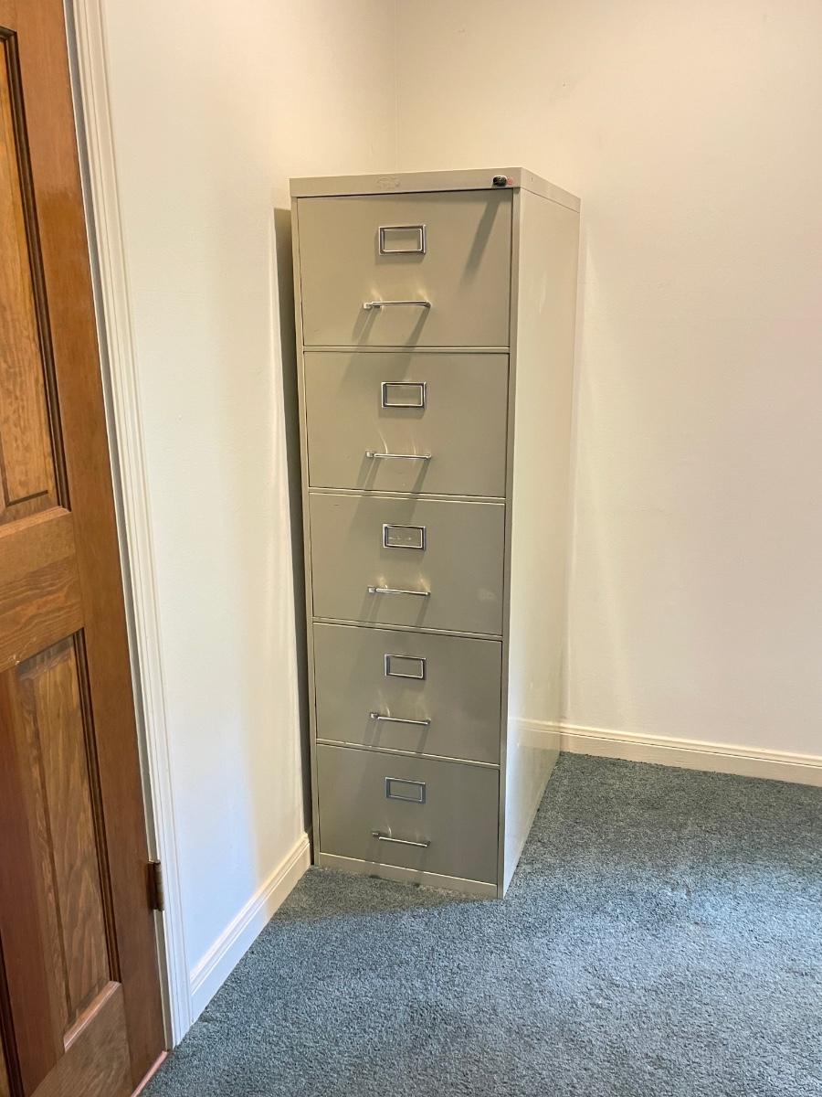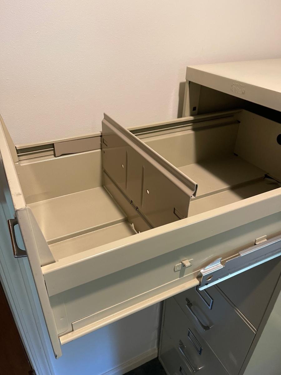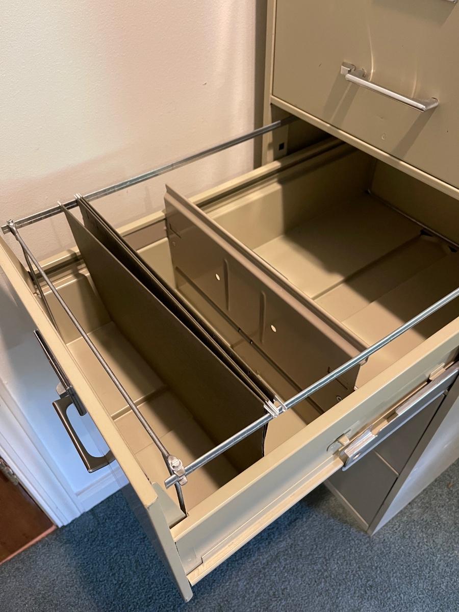5 Drawers ~ 3 of the Drawers have file hangers and file sliders. 1 Drawer only has a file slider and the bottom drawer has no hanger or file slider. Bottom drawer can be used for storage ~ No Key ~ 9.5” H x 18” W x 28.5” D